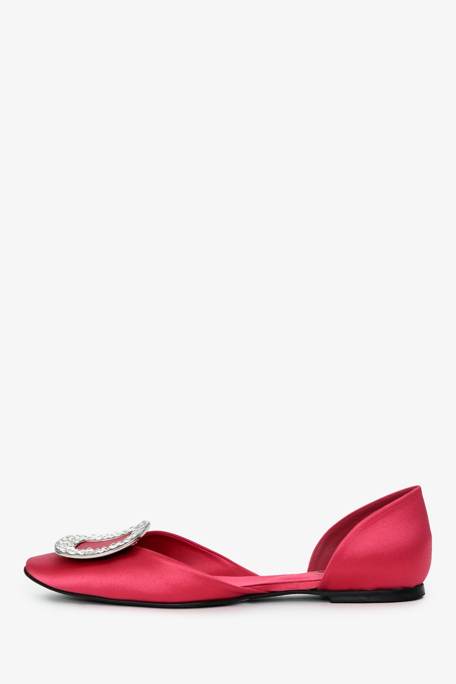 Roger Vivier Pink Satin D'Orsay Crystal Embellished Flats. Slip-on. Round toe. Silver-tone hardware. Tonal stitching.