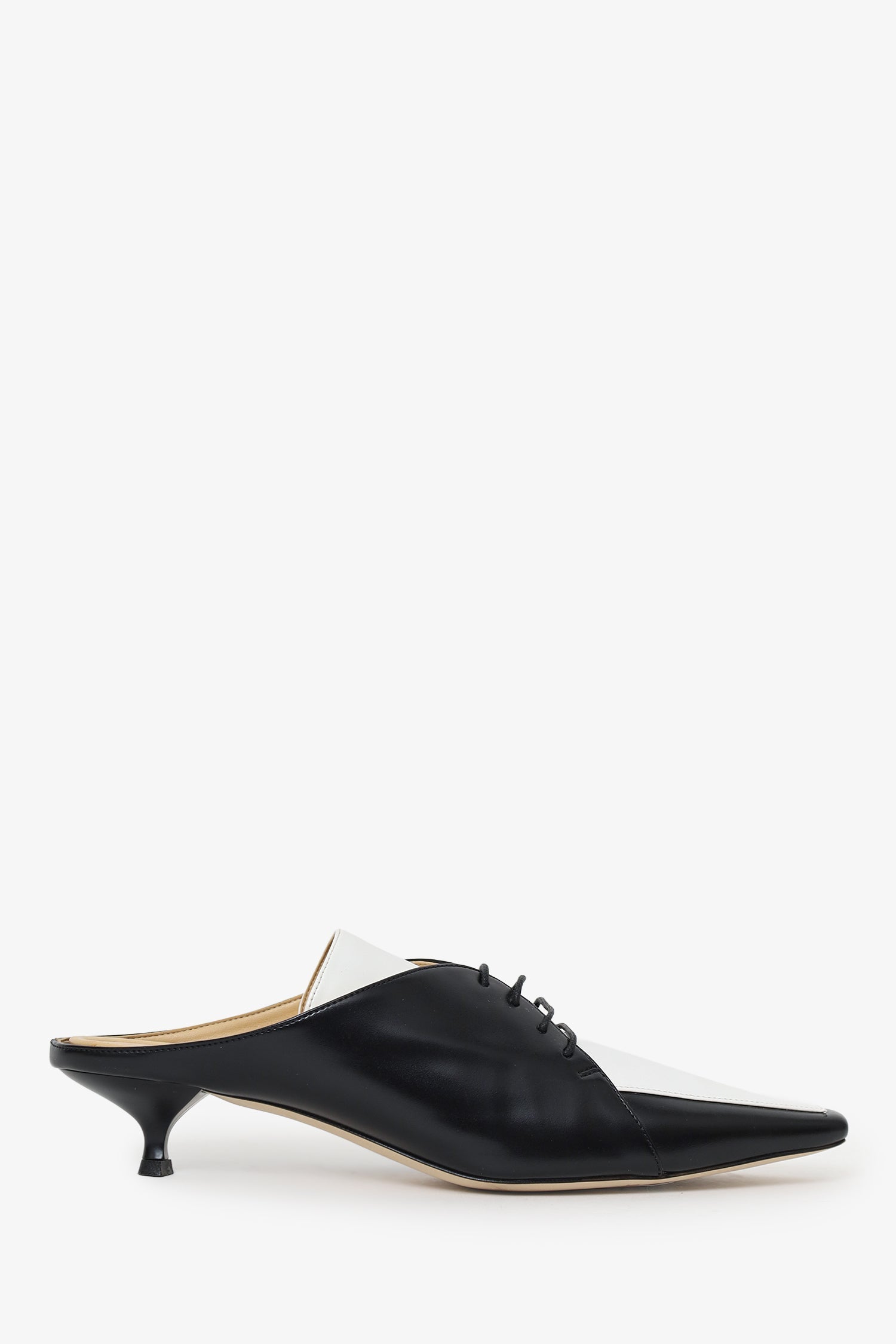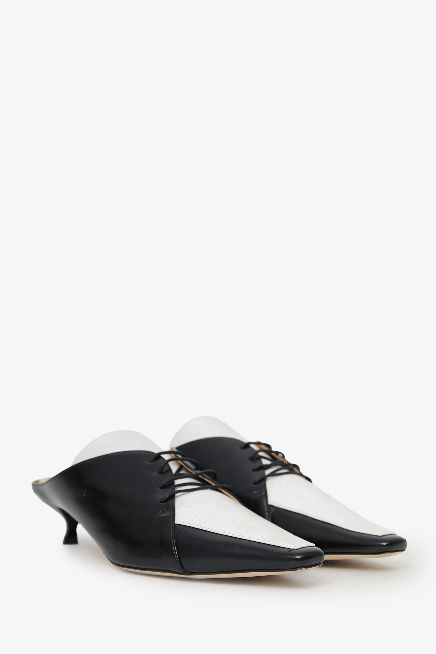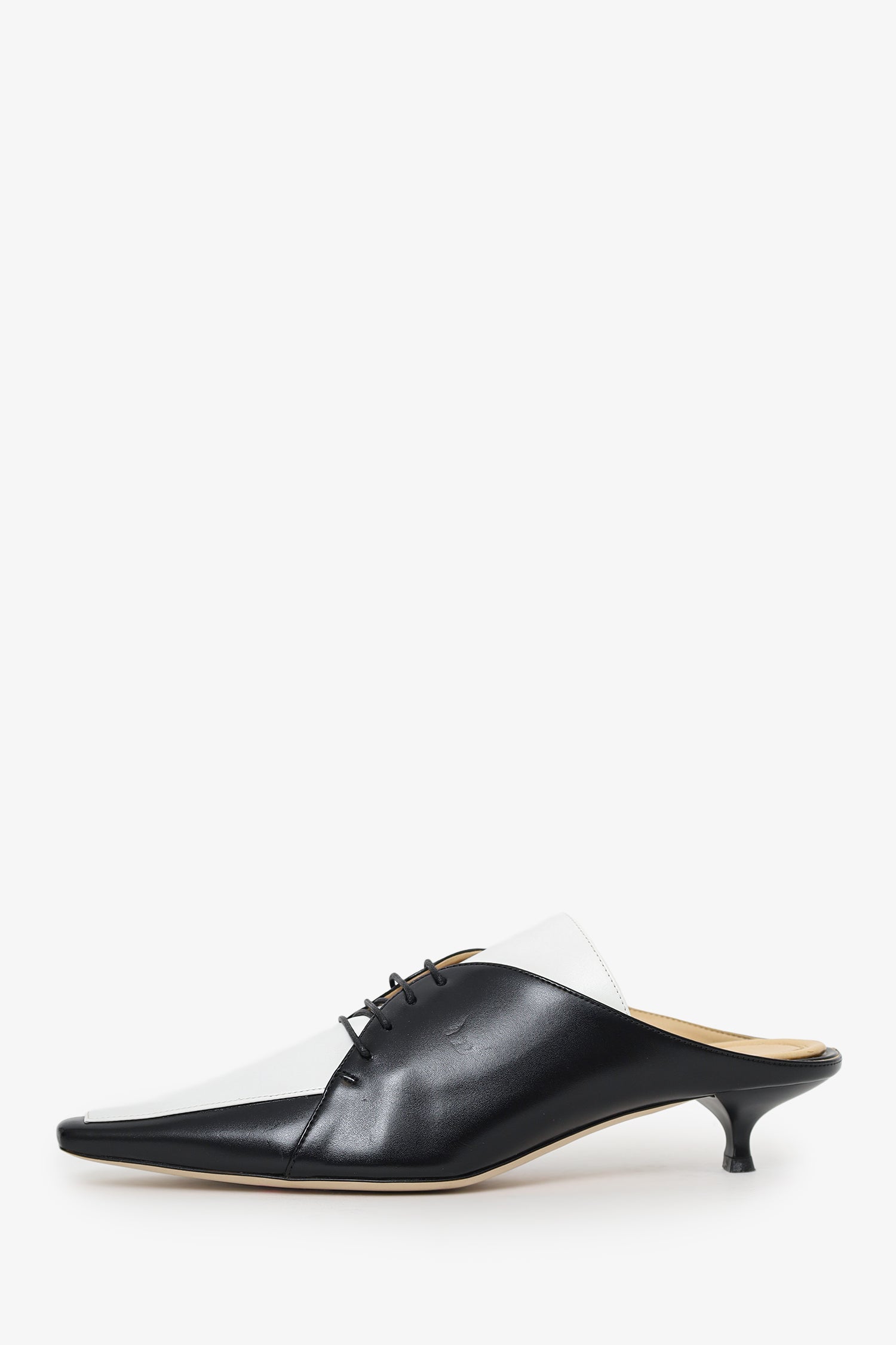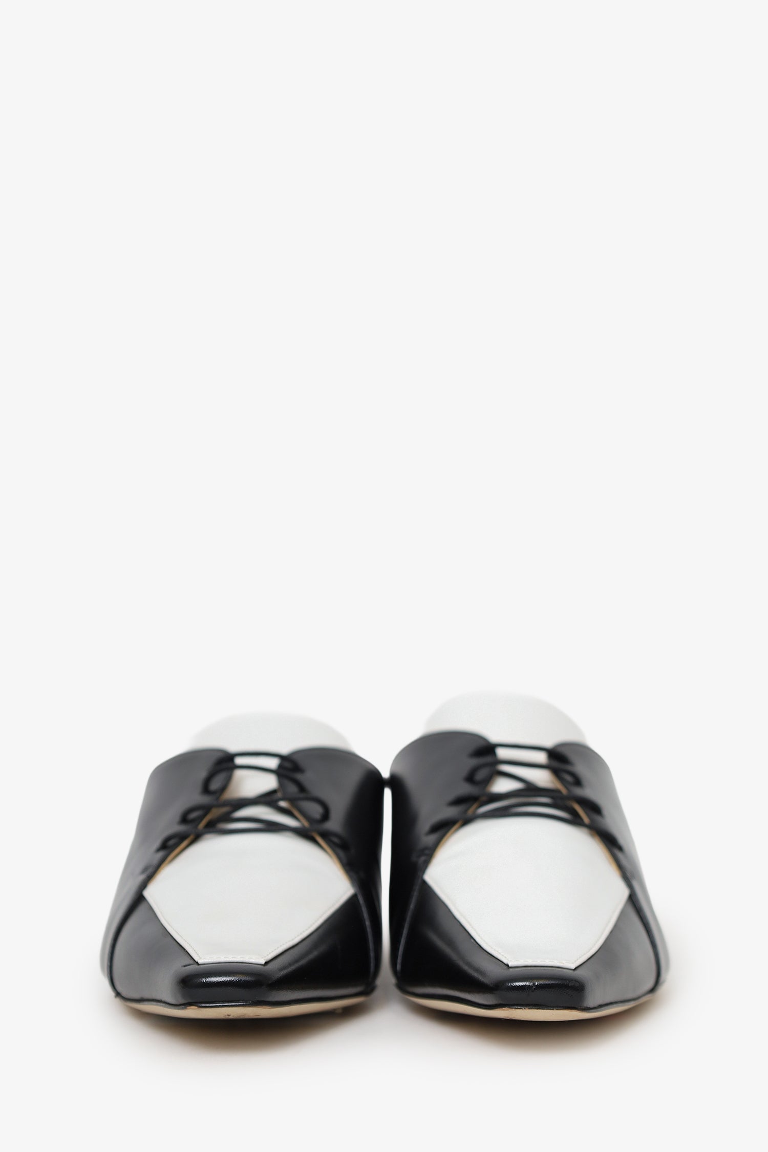 Rosie Assoulin Black/White Leather Lace-up Mules. Slip-on. Pointed squared-toe. Top lace-up closure. Tonal stitching.