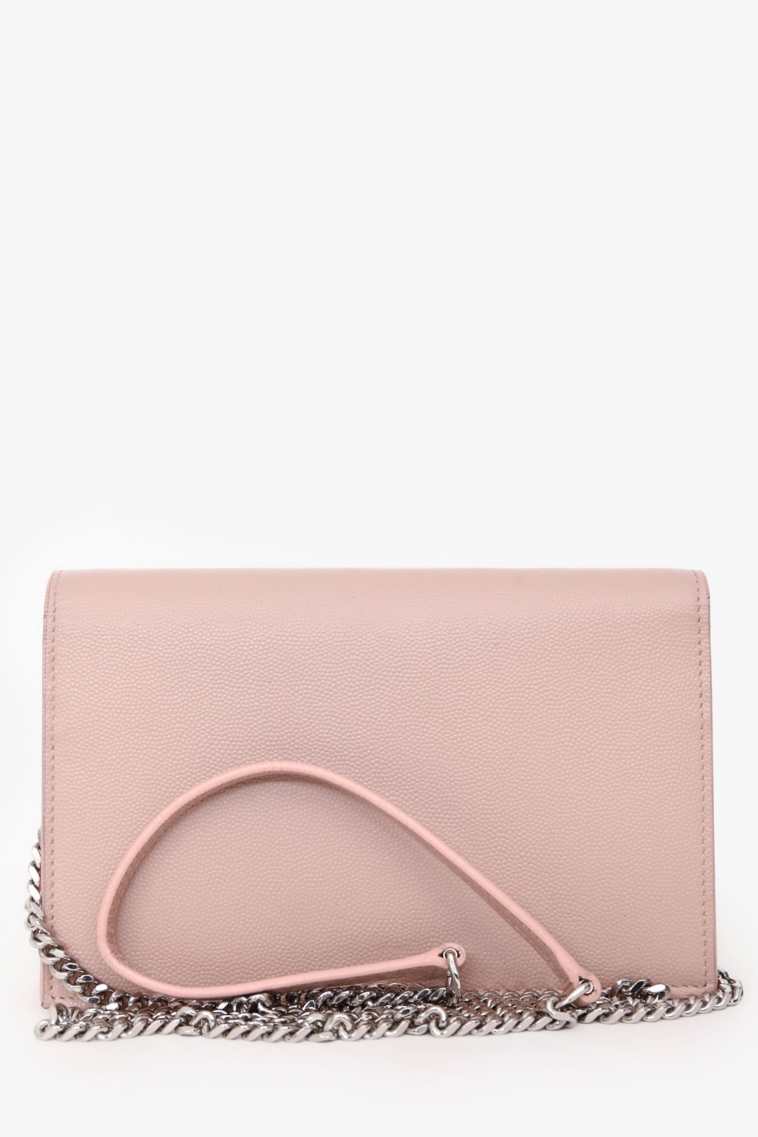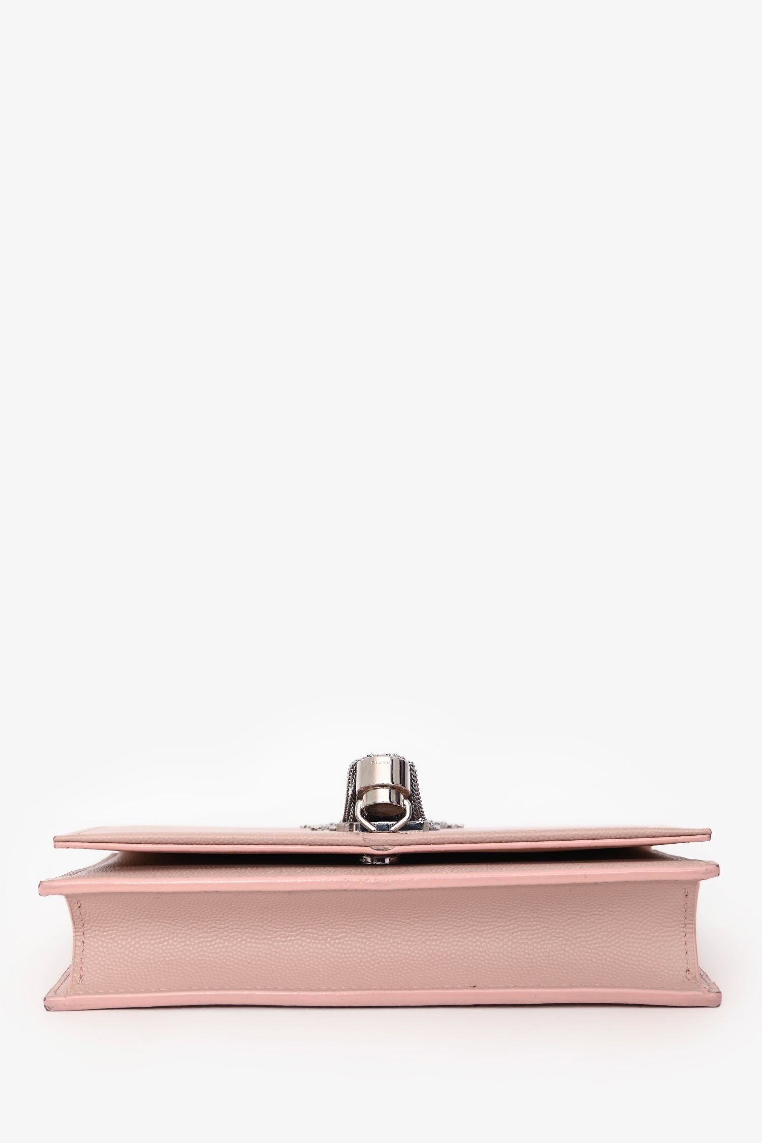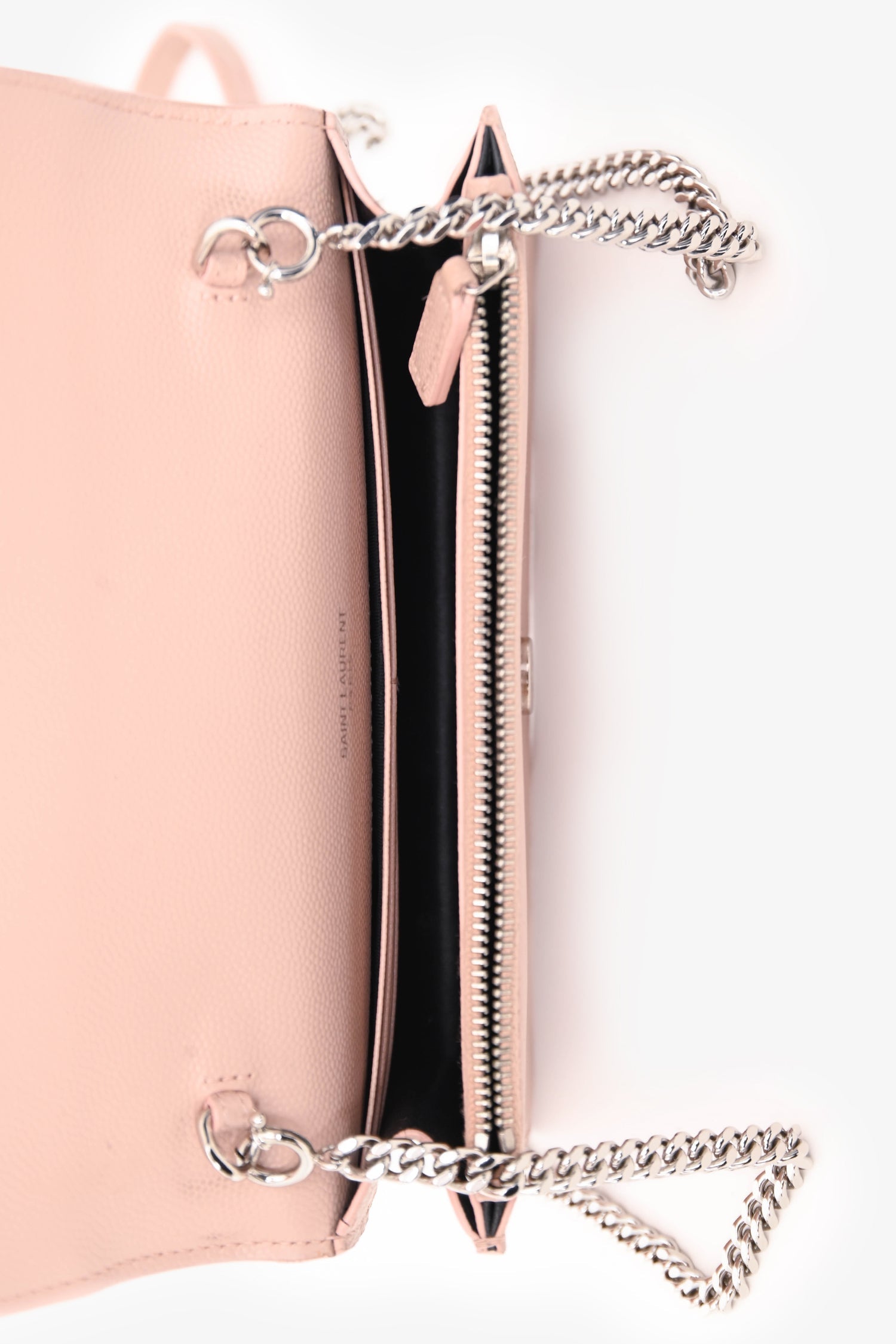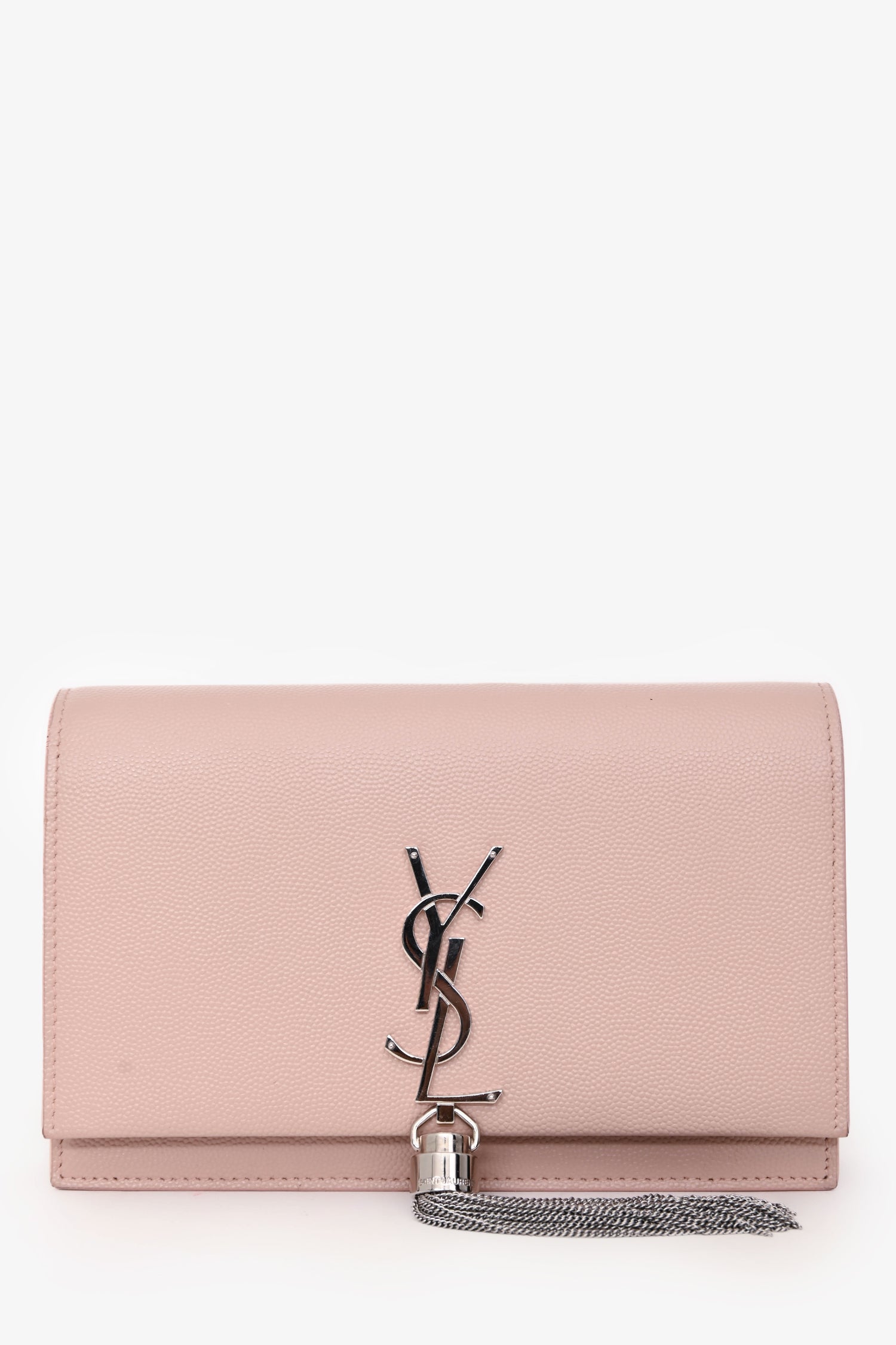 Saint Laurent Pink Small Kate Tassel Crossbody Bag. Top flap with snap closure. Detachable chain shoulder strap. Leather-lined interior. 1 interior pocket with 1 zip coin compartment. Silver-tone hardware. Tonal stitching.