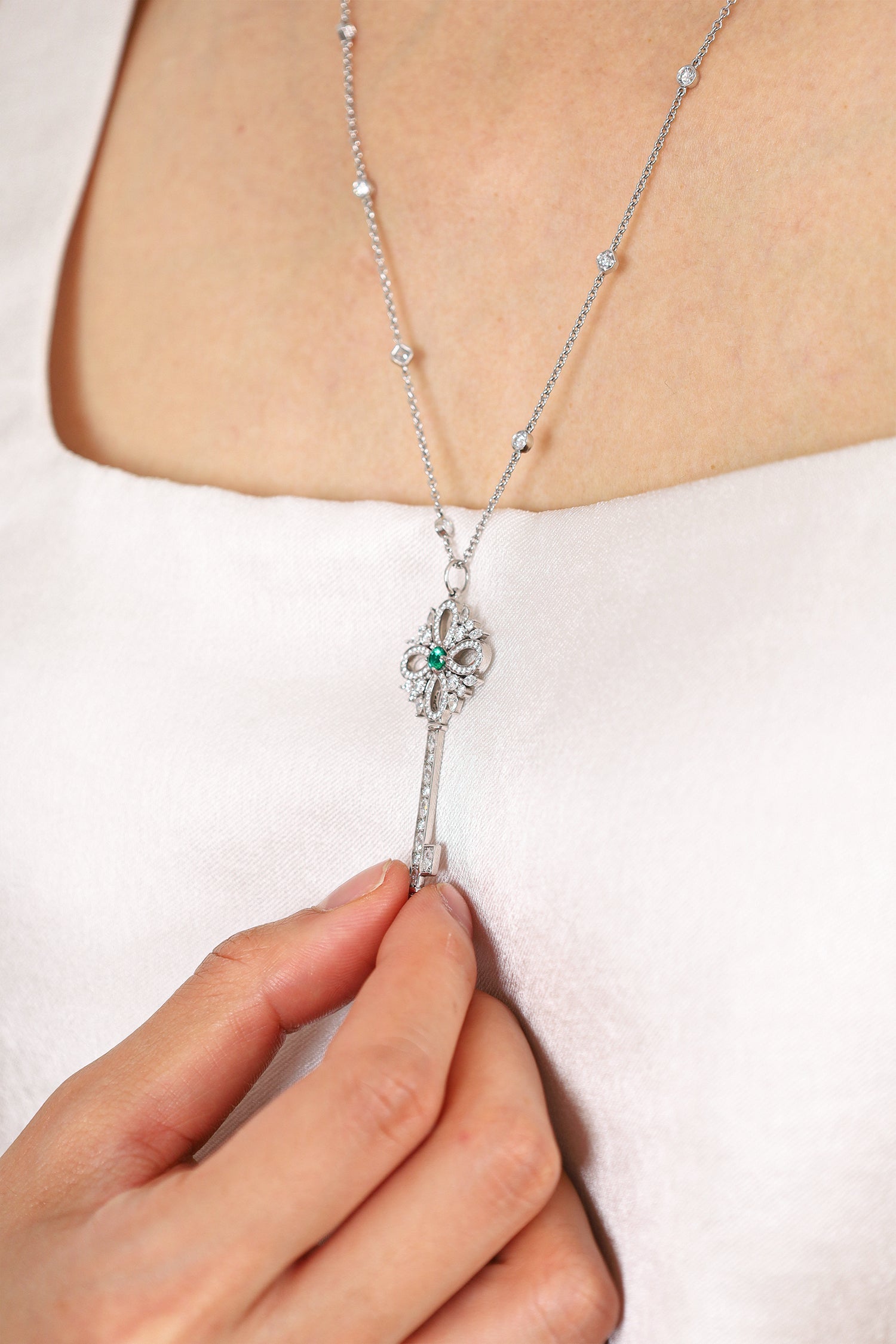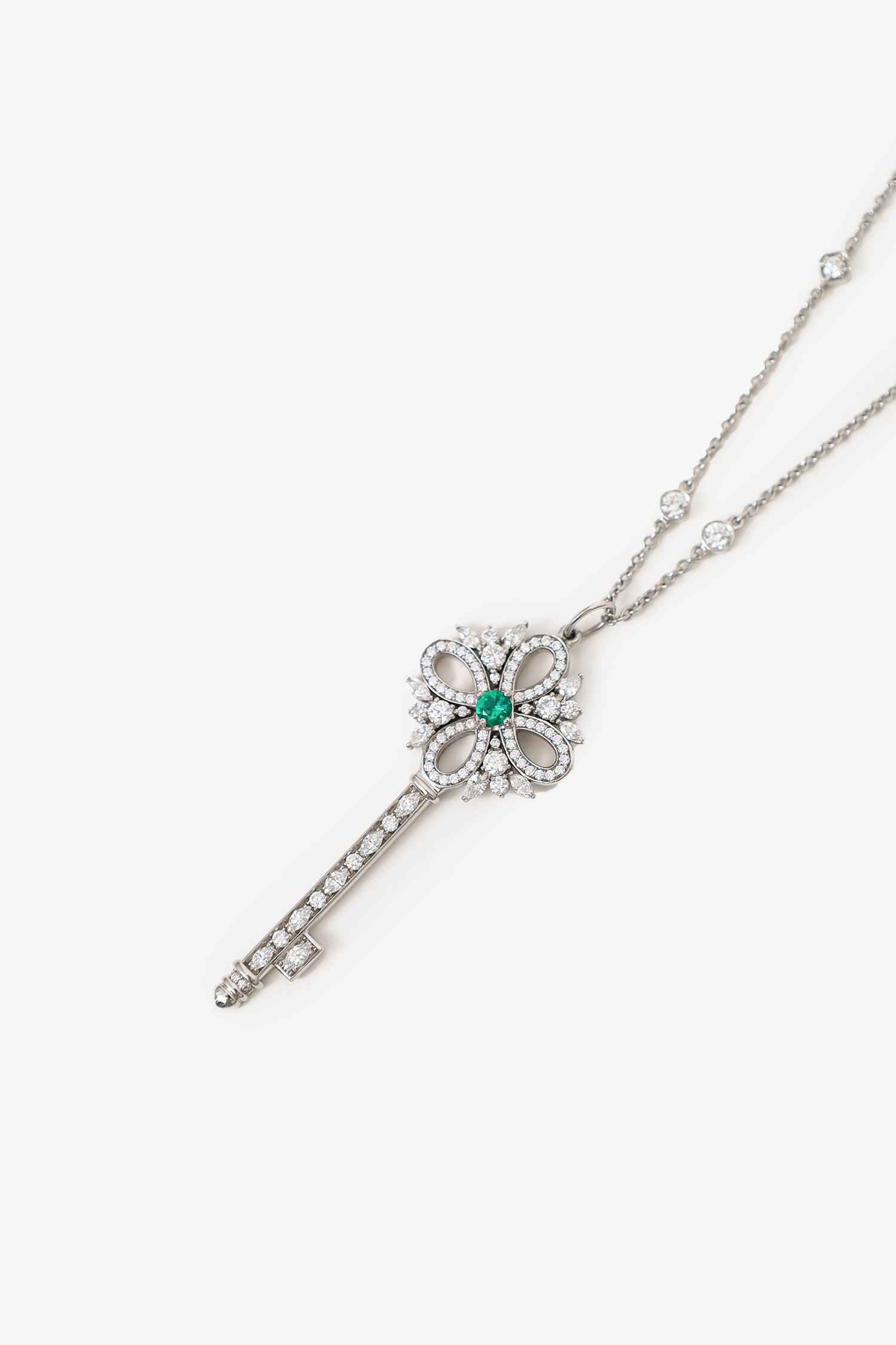 Tiffany & Co. Platinum Diamond Emerald Victoria Key Pendant on Diamond Station Chain