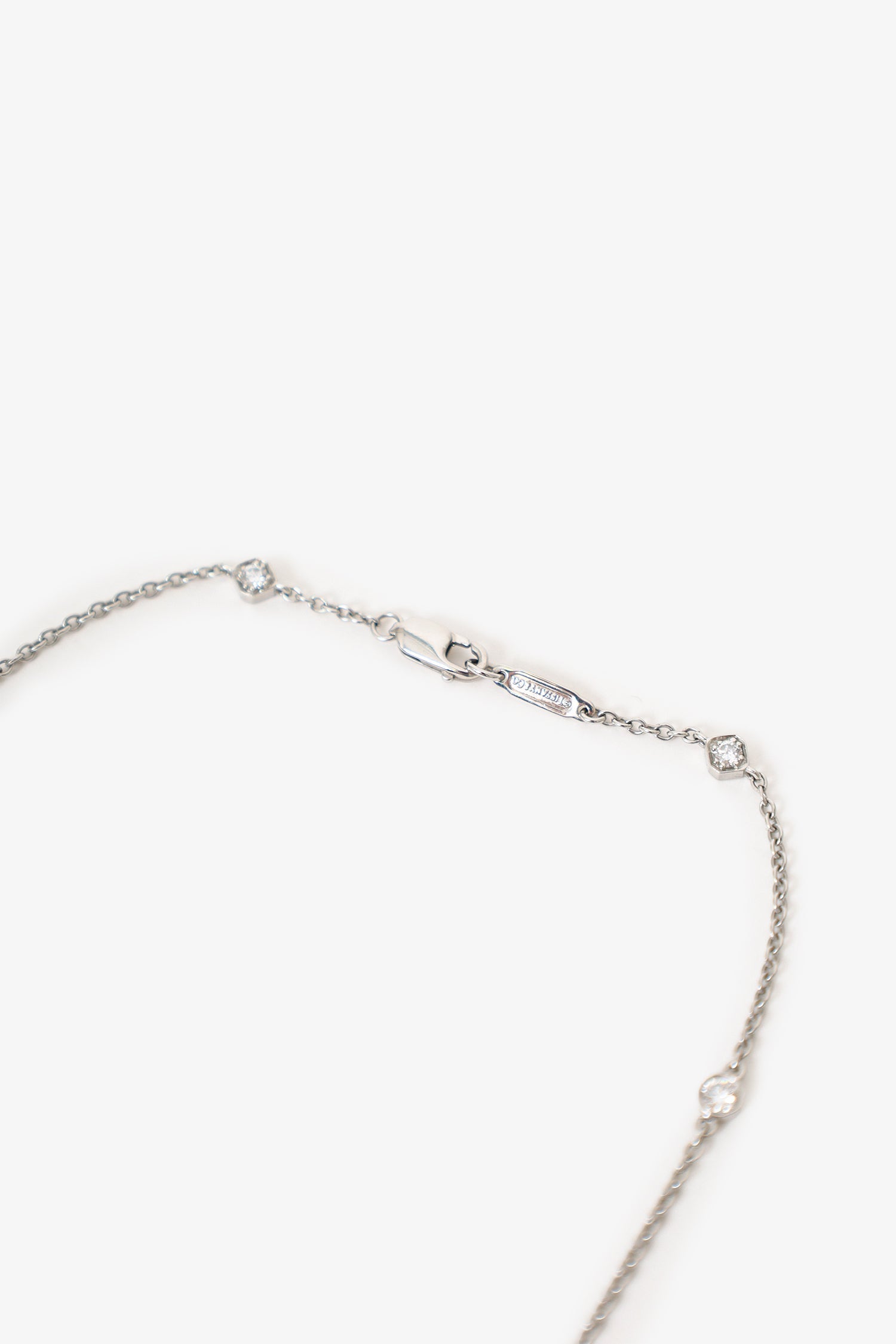 Tiffany & Co. Platinum Diamond Emerald Victoria Key Pendant on Diamond Station Chain. Rear claps closure. Diamonds set on chain. Arrangement of emerald and diamonds set on key pendent. Silver-tone hardware.