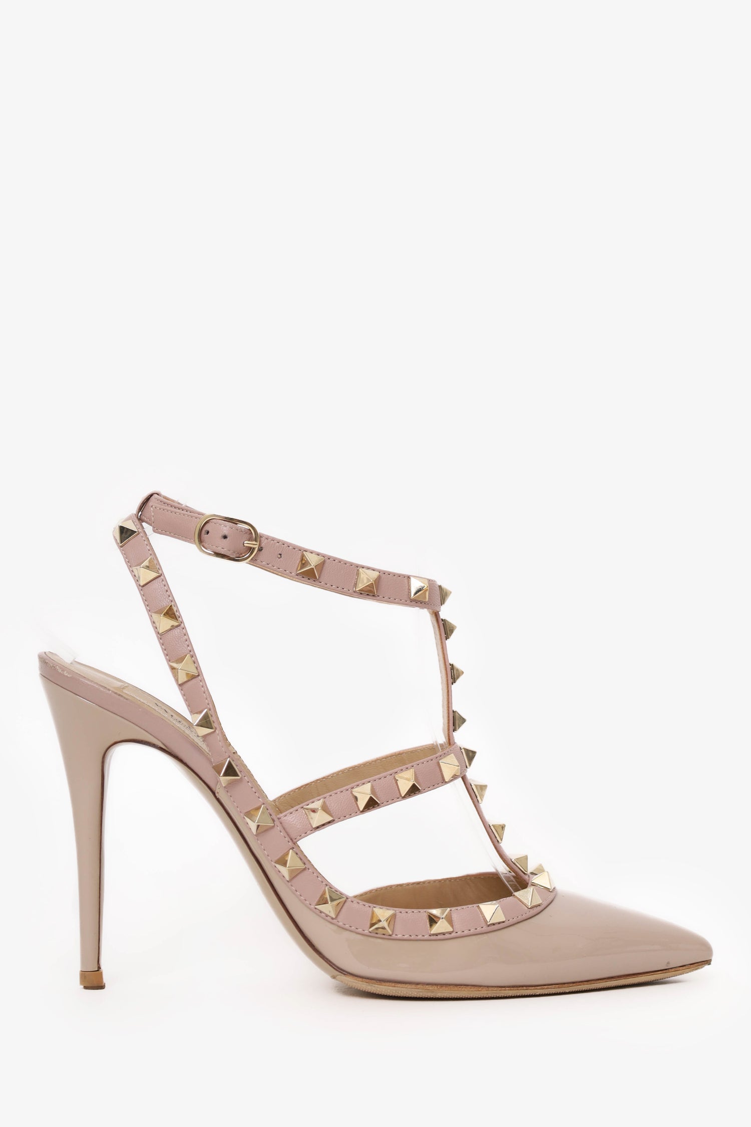 Valentino Nude Patent Cage Rockstud Heels. Slip-on. Pointed toe. Ankle strap with adjustable buckle closure. Gold-tone hardware. Tonal stitching.