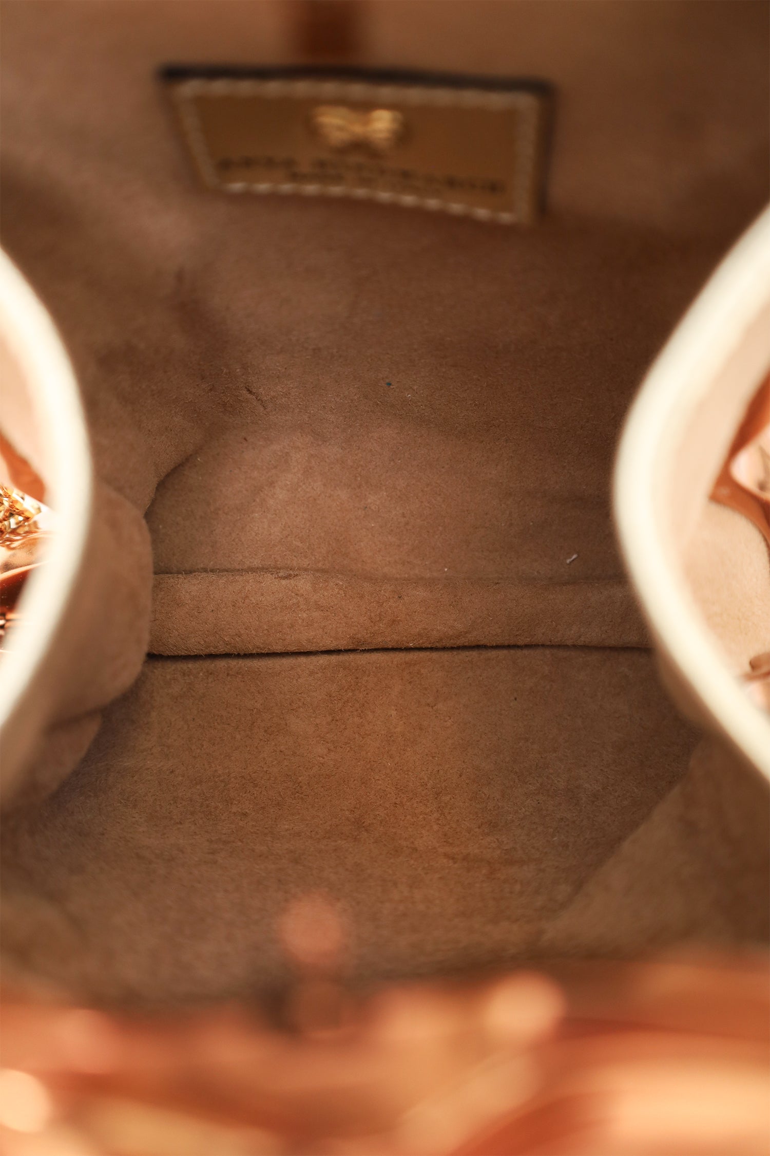 Anya Hindmarch Rose Gold Metallic Metal Crisp Packet Clutch With Chain. Top push-clasp closure. Removable chain link crossbody strap with clasp closure. Open lined interior. Gold-tone hardware. Tonal stitching.