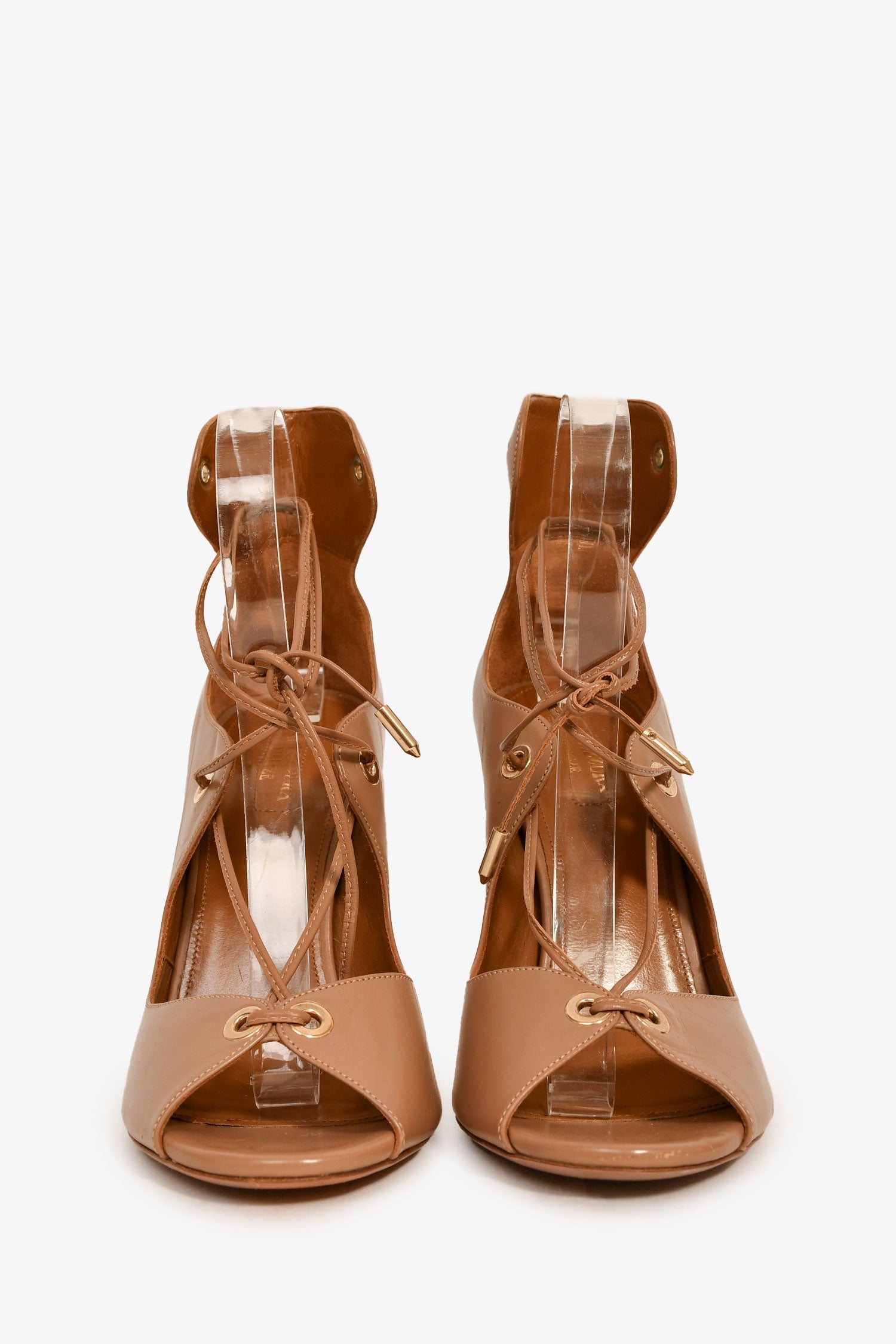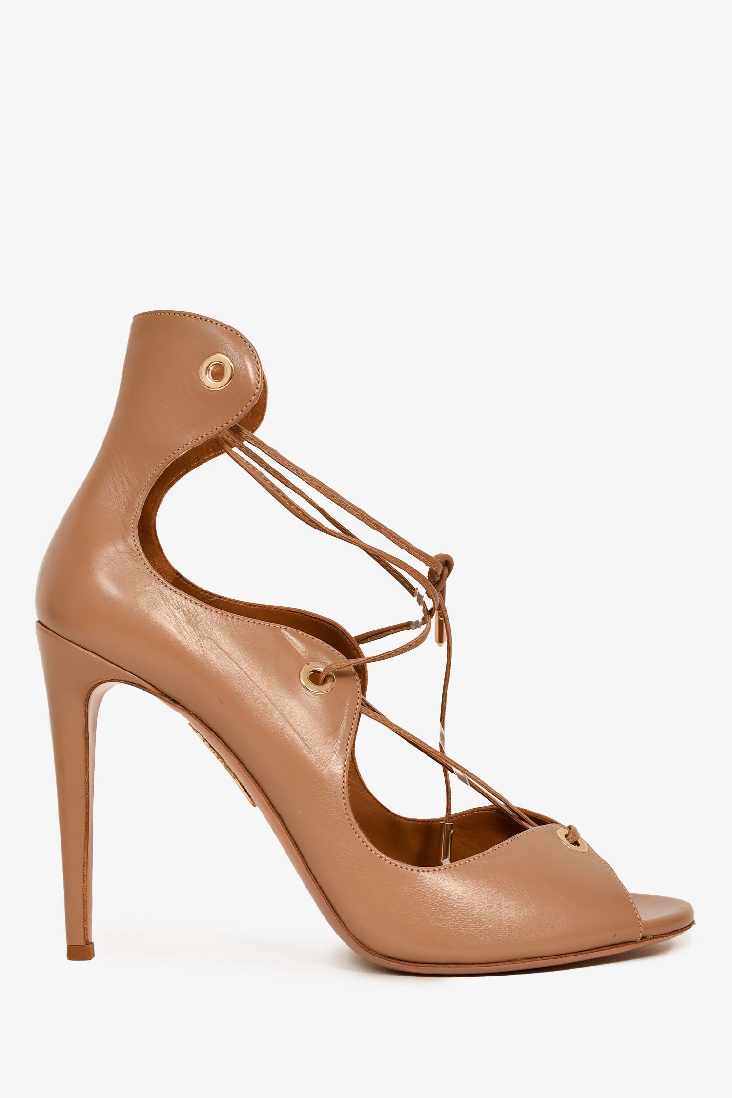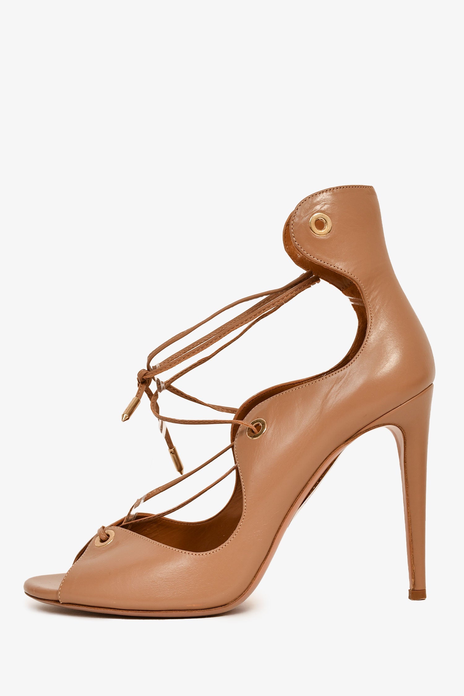 Aquazzura Nude Leather Lace-Up Heels. Slip-on. Open toe.