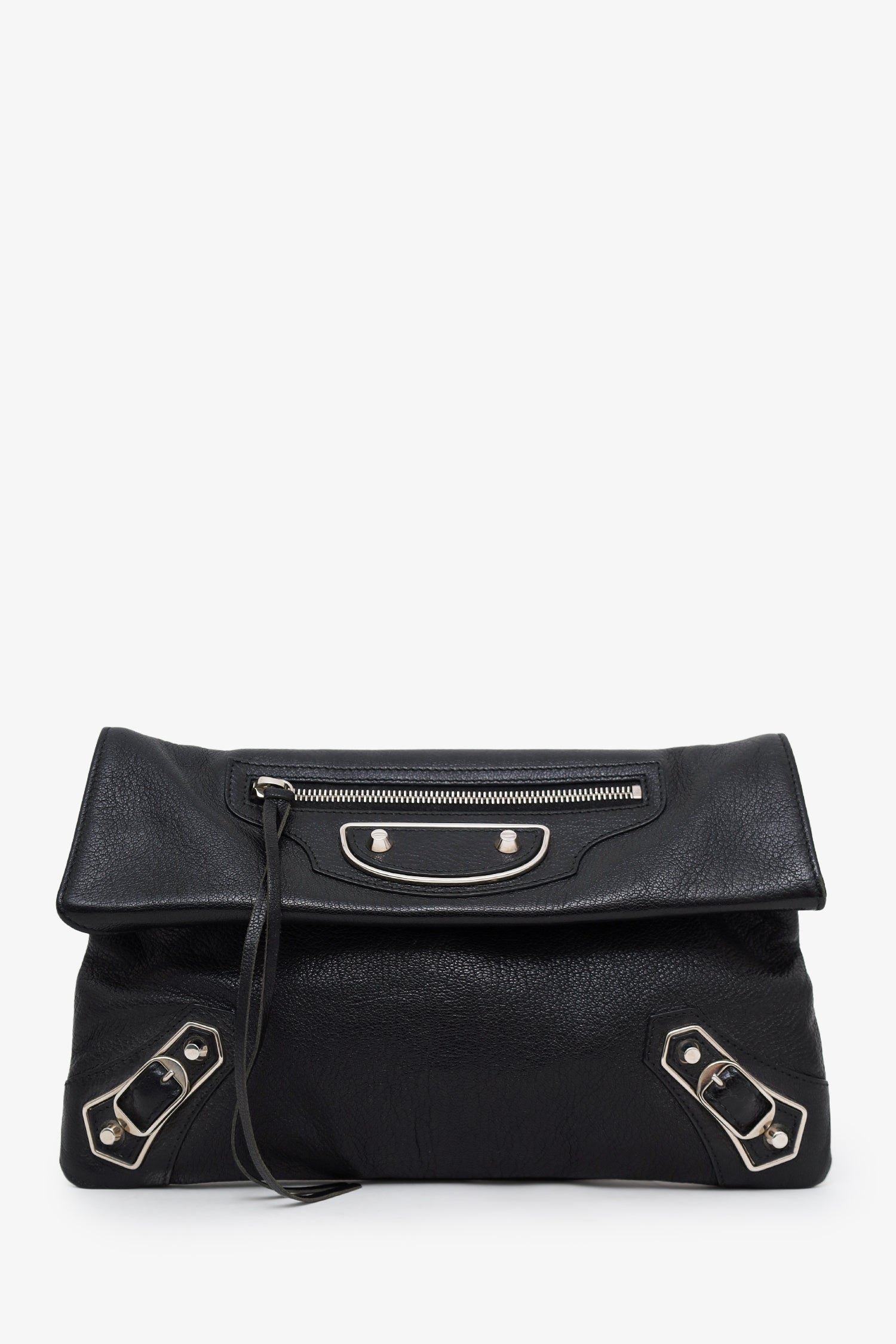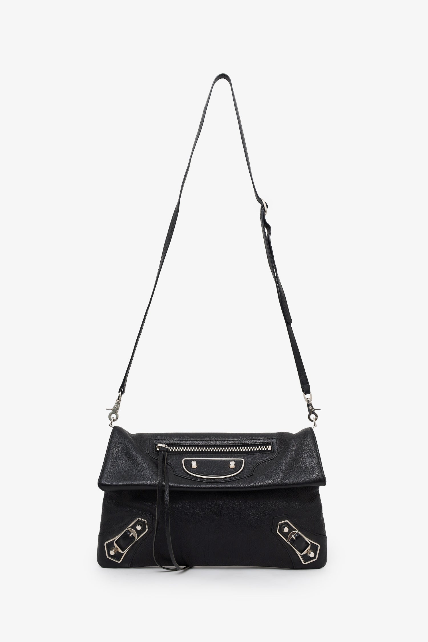 Balenciaga Black Leather City Envelope Clutch Bag With Strap. Front fold-over flap with snap-button-up closure. Removable crossbody strap with adjustable pull-through buckle closure. Single exterior front zip-up pocket. Lined interior with 3 pockets; 2 large compartments, and 1 zip-up. Gold-tone hardware. Tonal stitching.