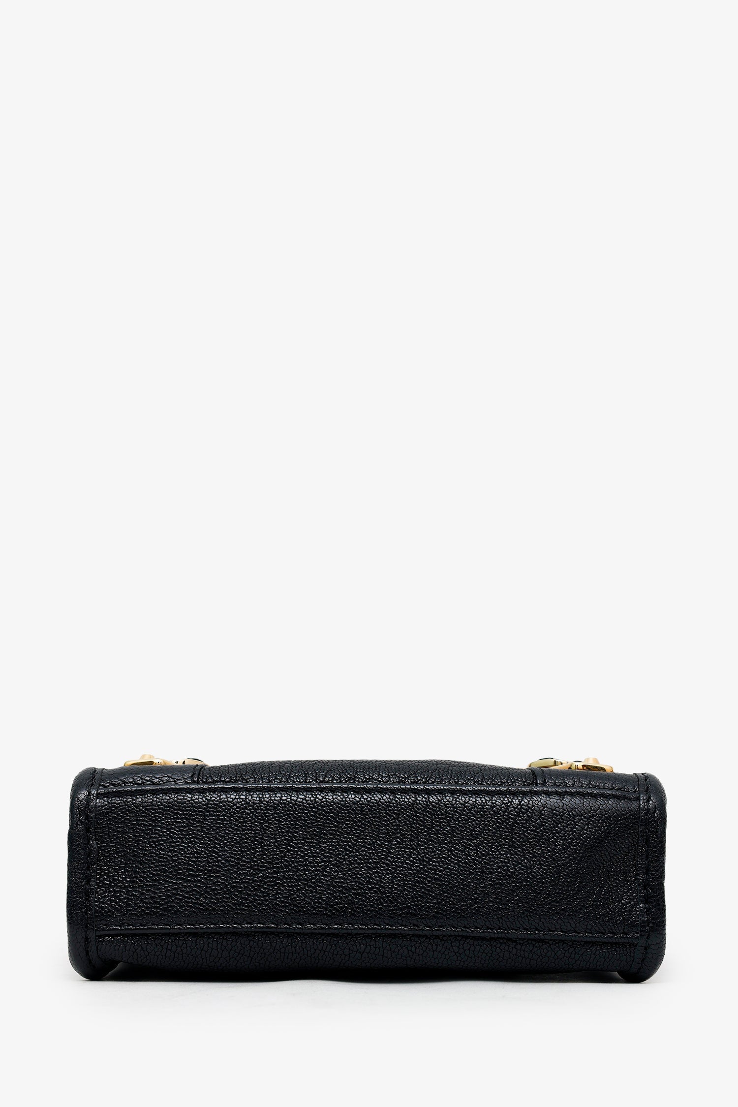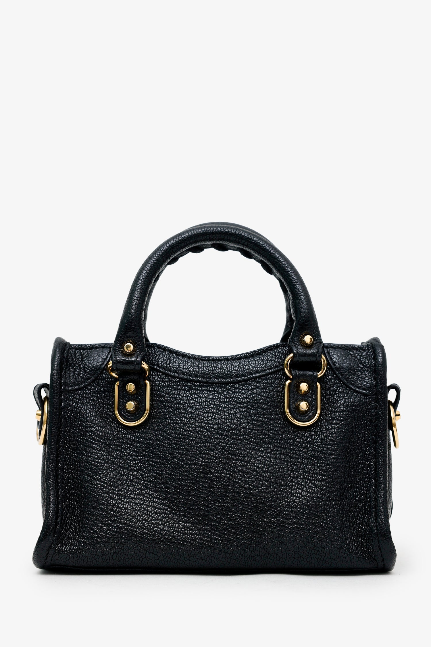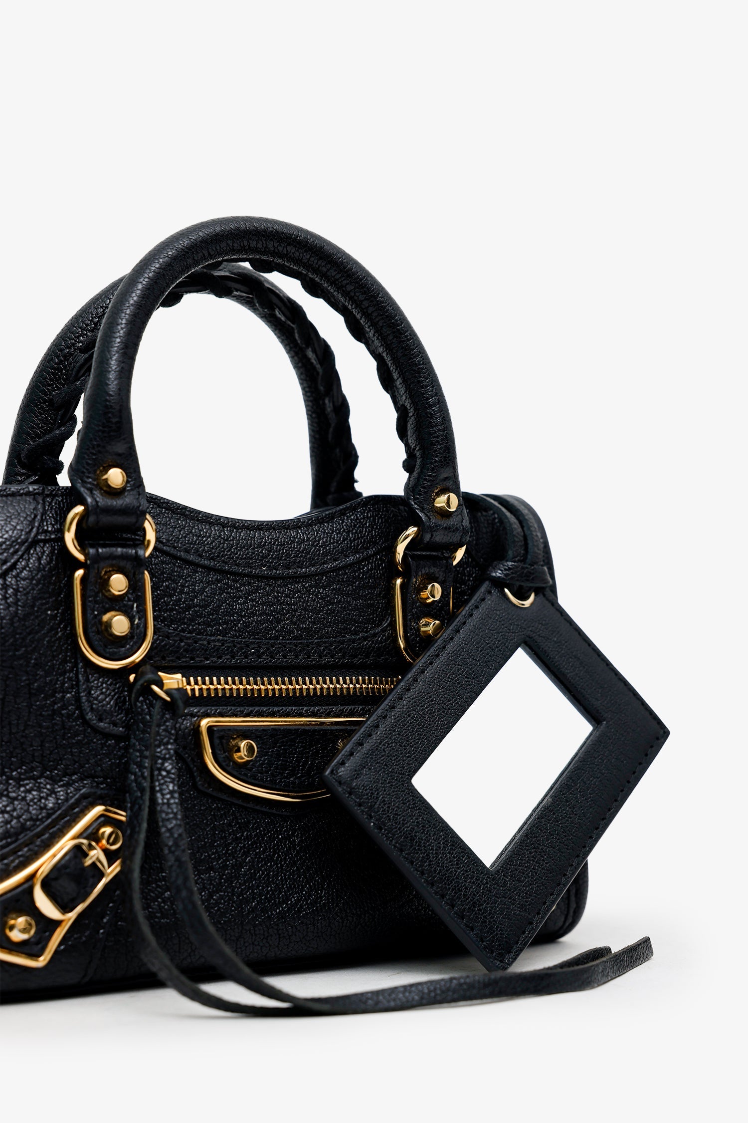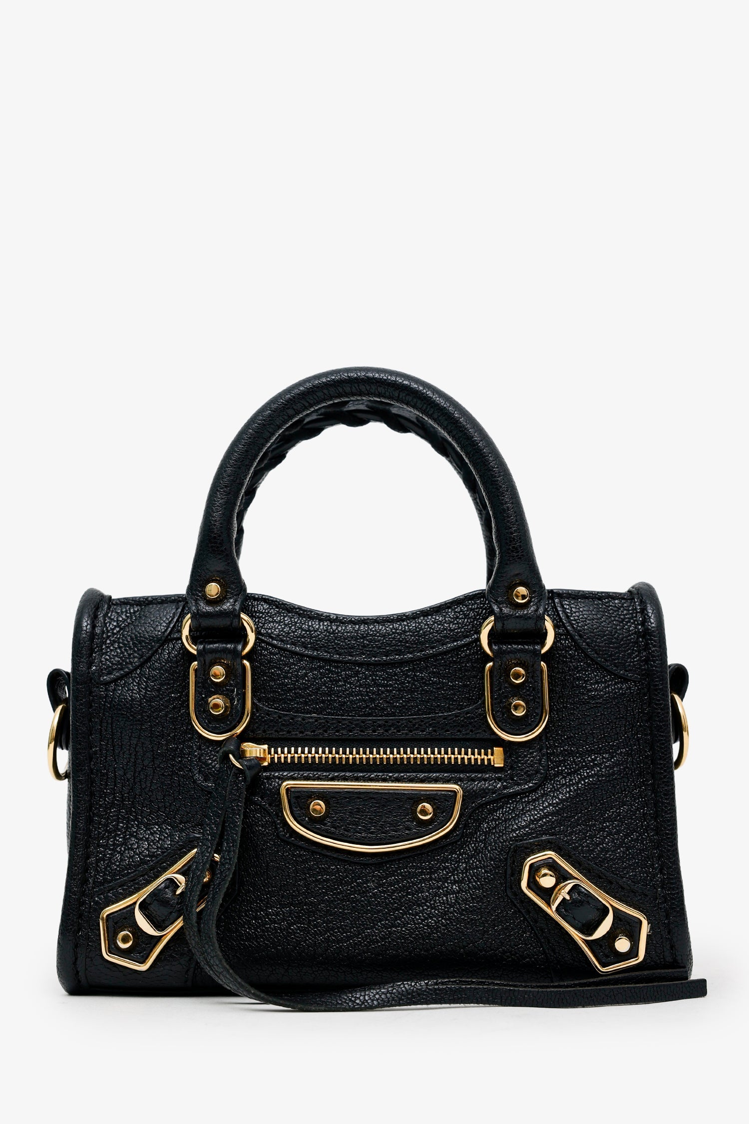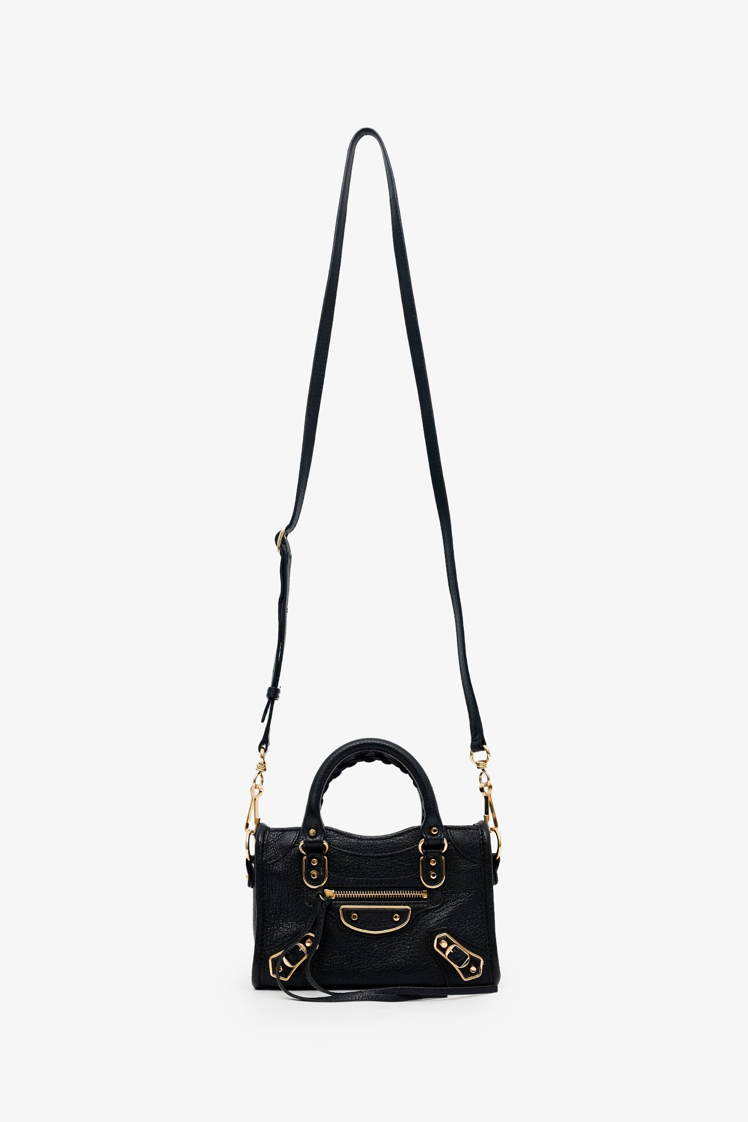 Balenciaga Black Leather Mini Edge City Bag GHW With Strap. Top zip closure. Twin top handles. Removable crossbody strap with clasp closure. Single exterior front zip pocket. Lined interior. with single slip pocket. Additional mirror. Gold-tone hardware. Tonal stitching.