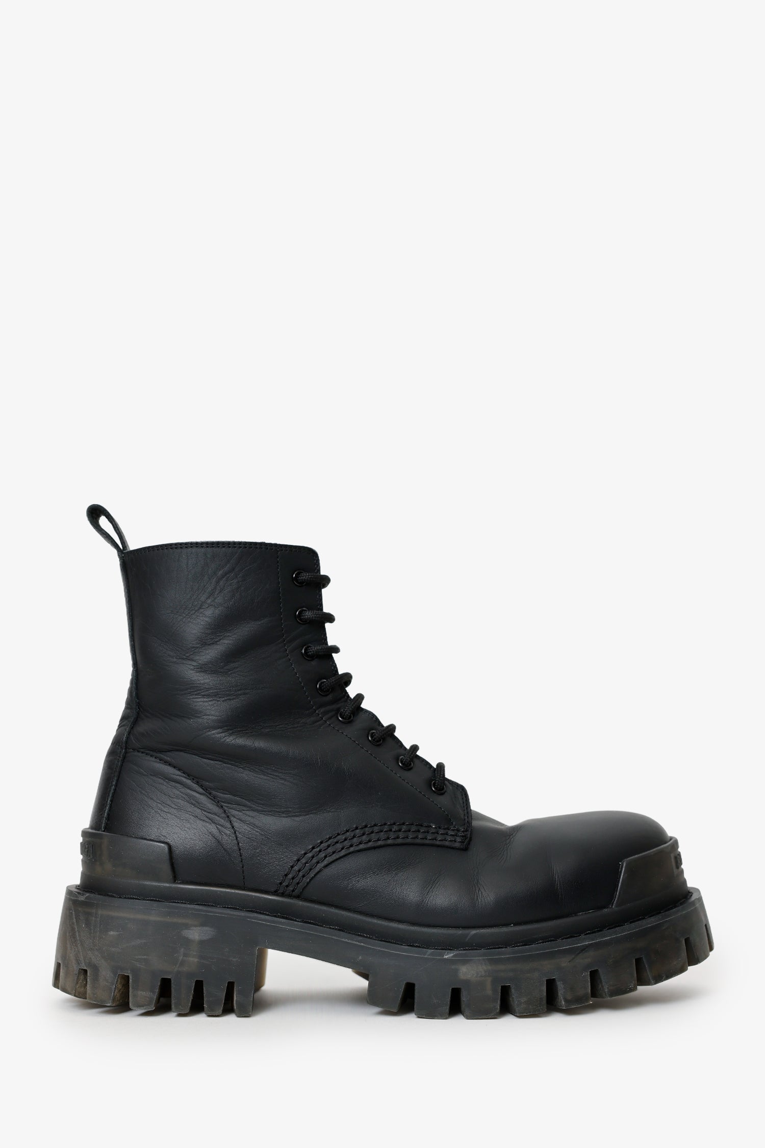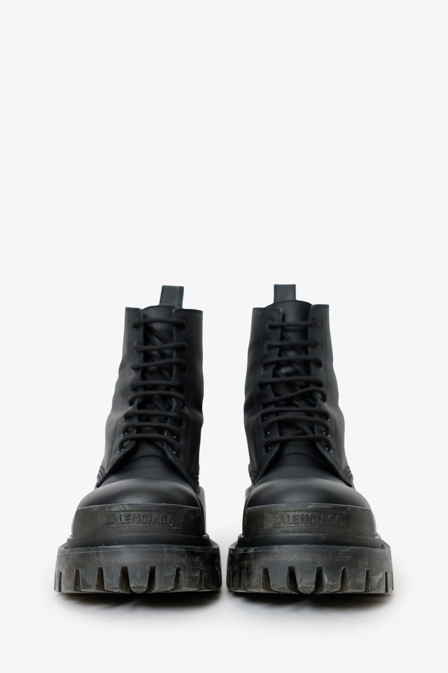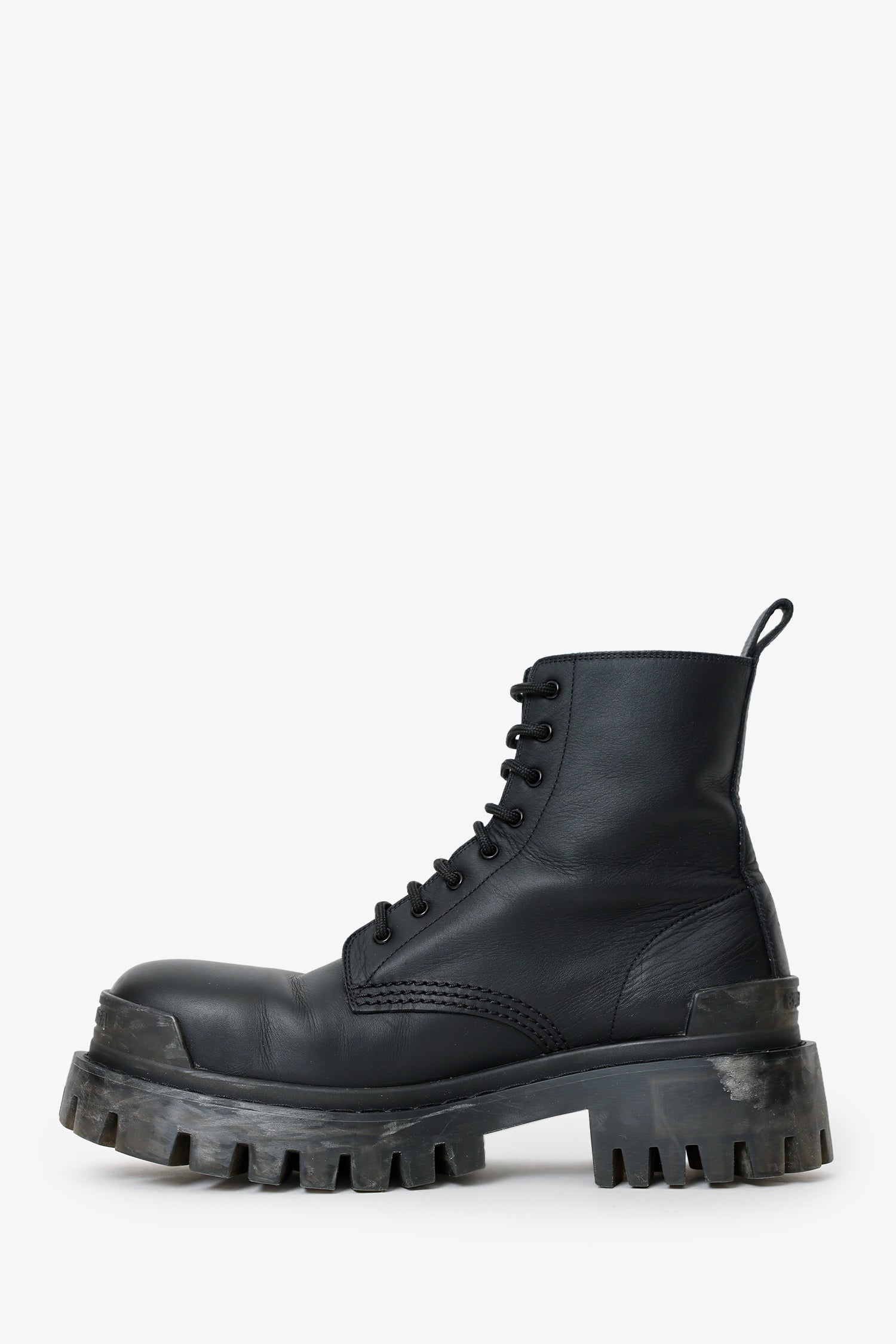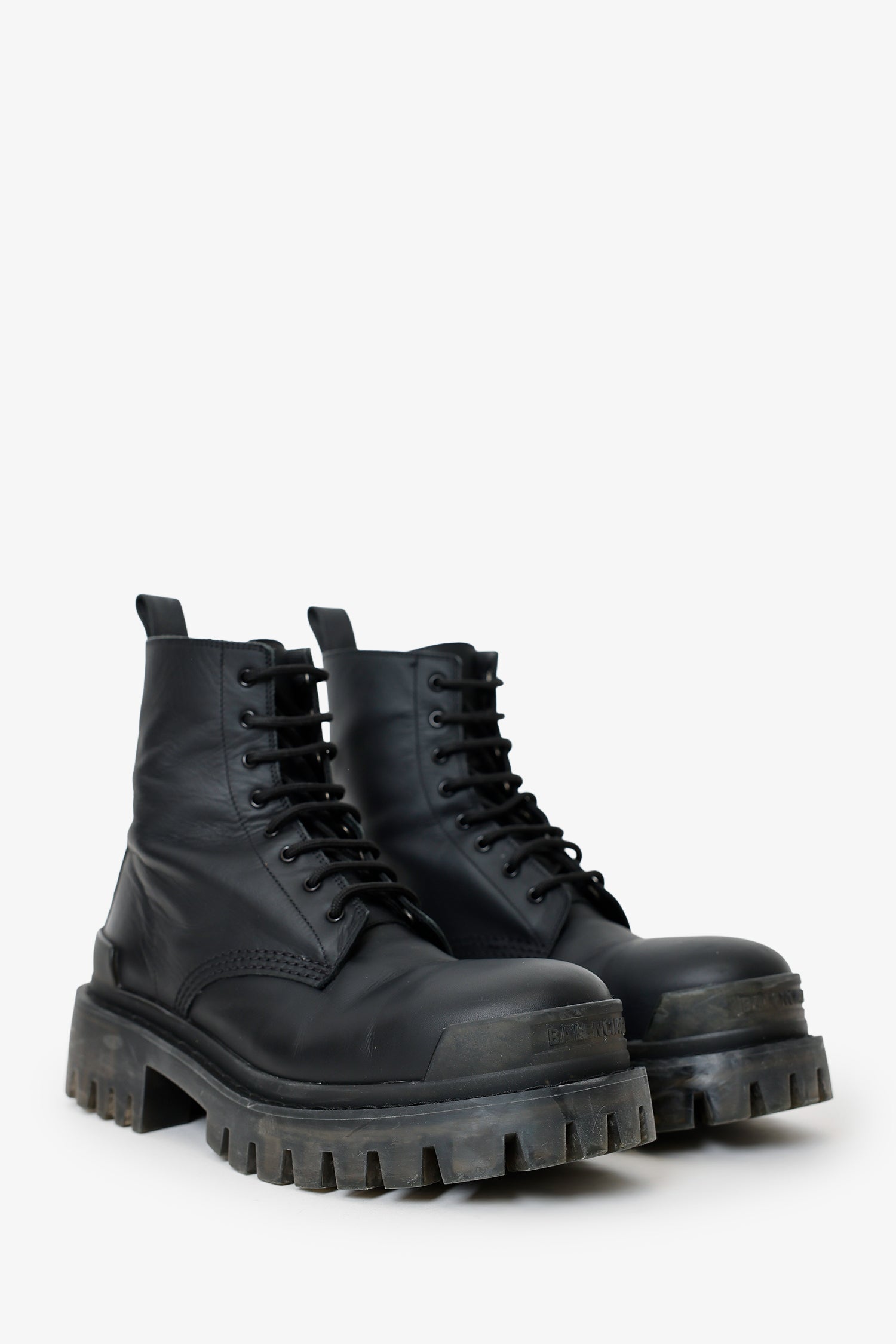 Balenciaga Black Leather 'Strike' Boots. Round toe. Front lace-up closure. Rear pull tab. Block heel. Lined interior. Tonal stitching.