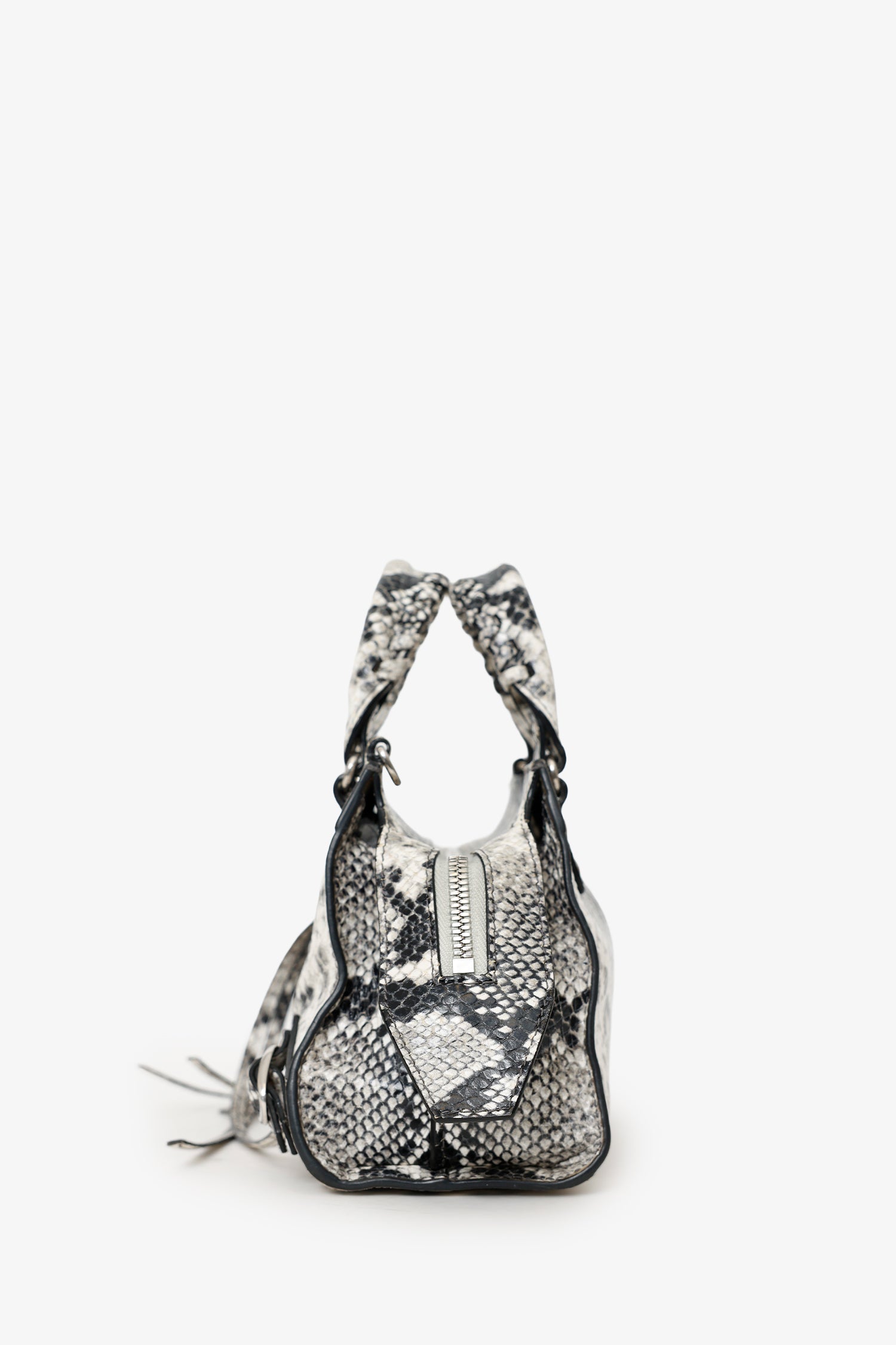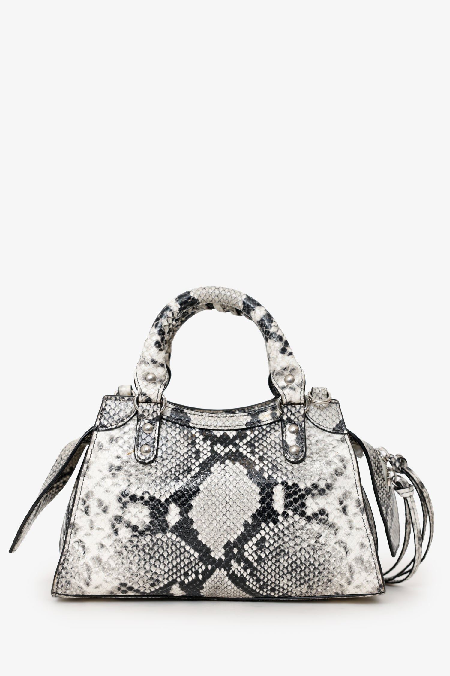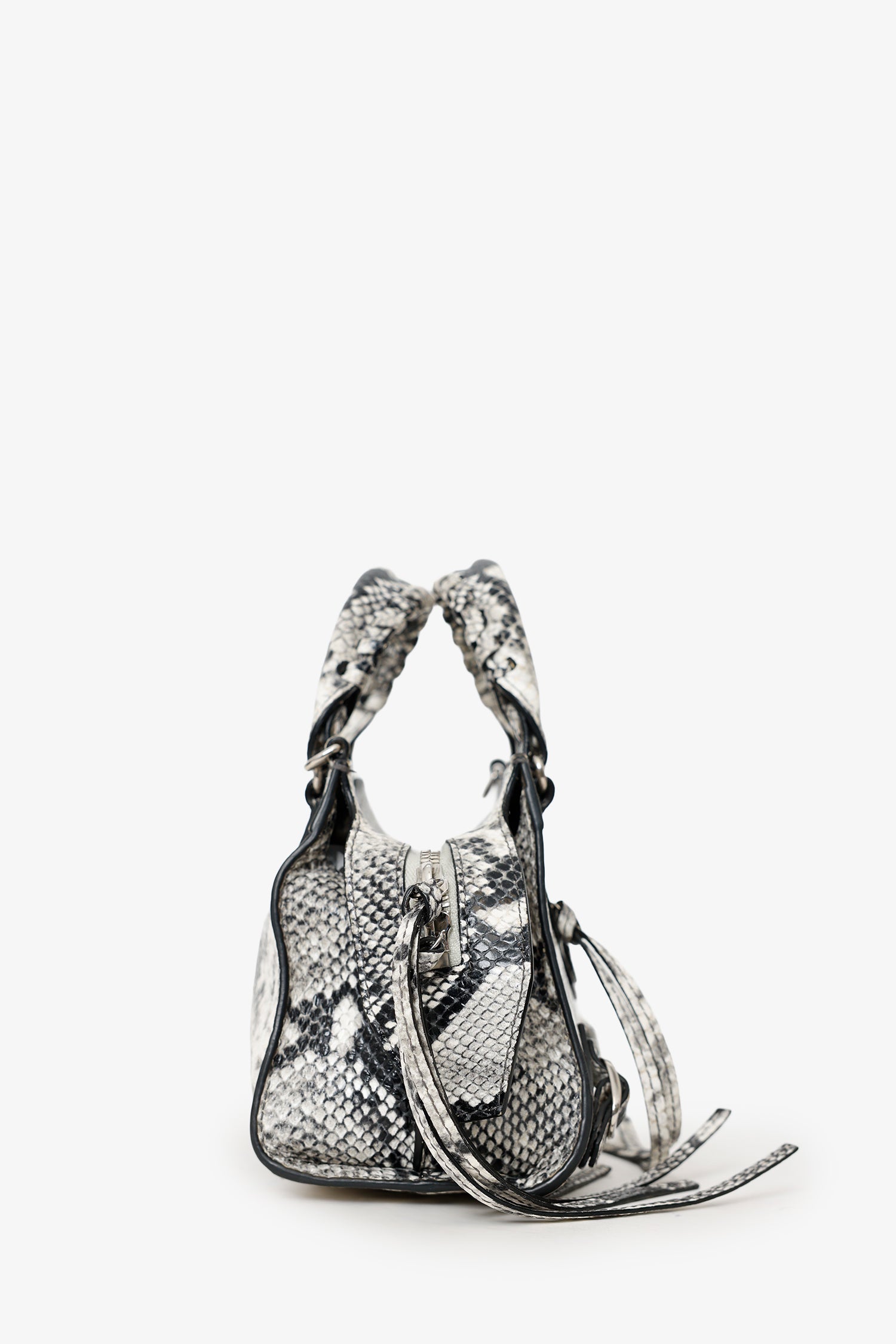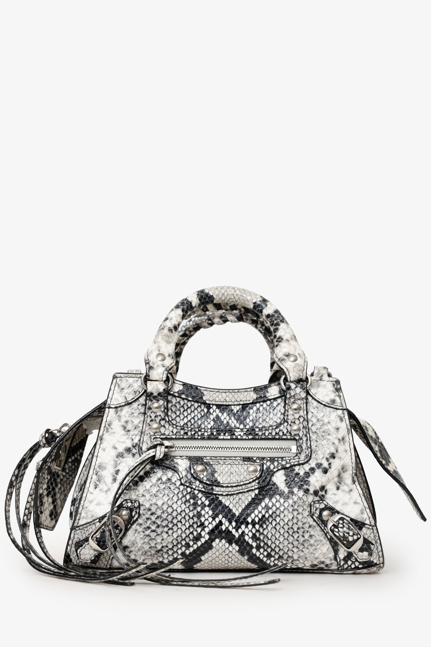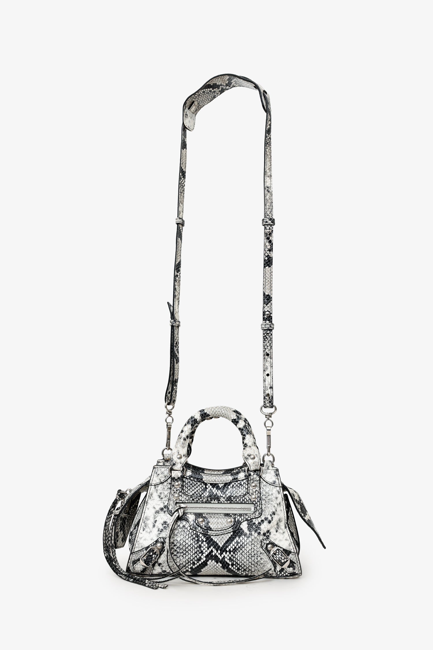 Balenciaga Python Embossed Leather Neo Classic Mini City Bag. Top zip closure. Twin top handles. Removable and adjustable push-pin crossbody strap with clasp closure. Single front exterior pocket with zip pocket. 2 exterior d-rings. Lined interior. Single interior slip pocket. Silver-tone hardware. Tonal stitching.