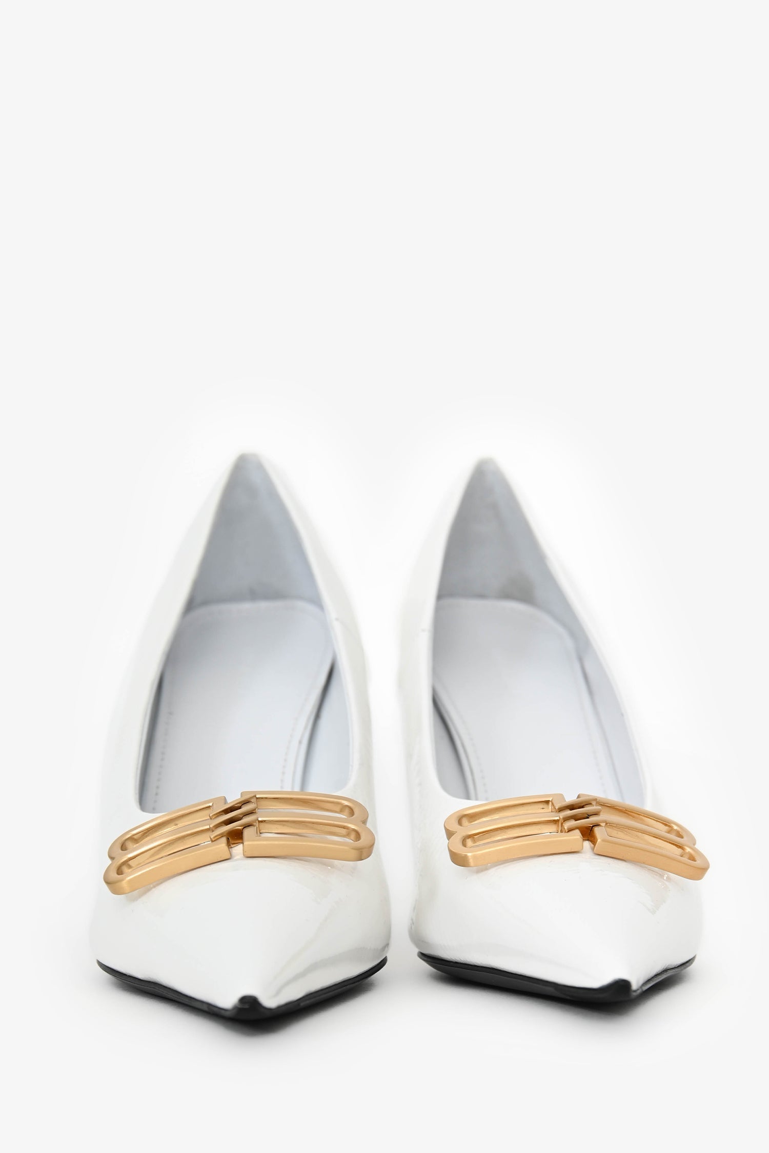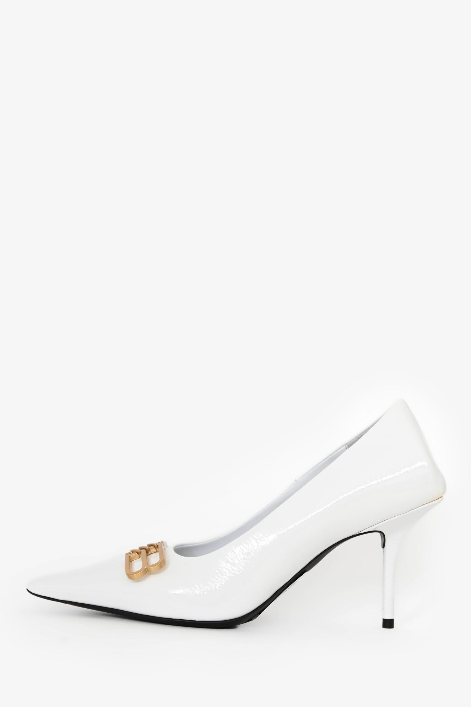 Balenciaga White Patent Leather BB Knife Heels. Pointed toe. Leather lining and insole. Gold-tone hardware. Tonal stitching.
