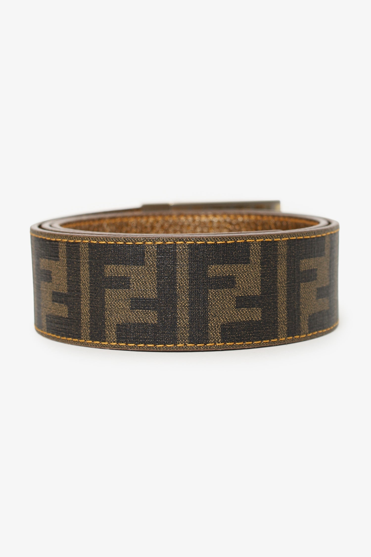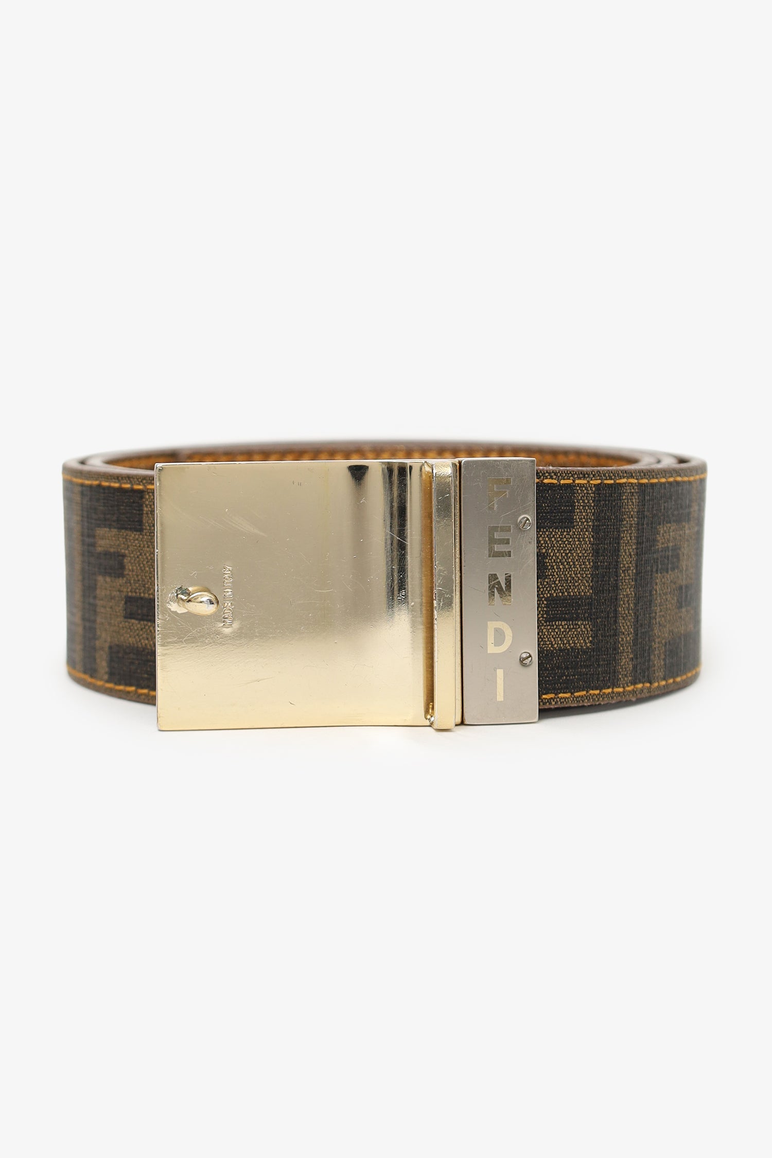 Fendi Gold Metallic/Zucca Coated Canvas Reversible Plaque Buckle Belt. Adjustable pull-through push-pin closure. Silver-tone hardware. Contrast and tonal stitching.