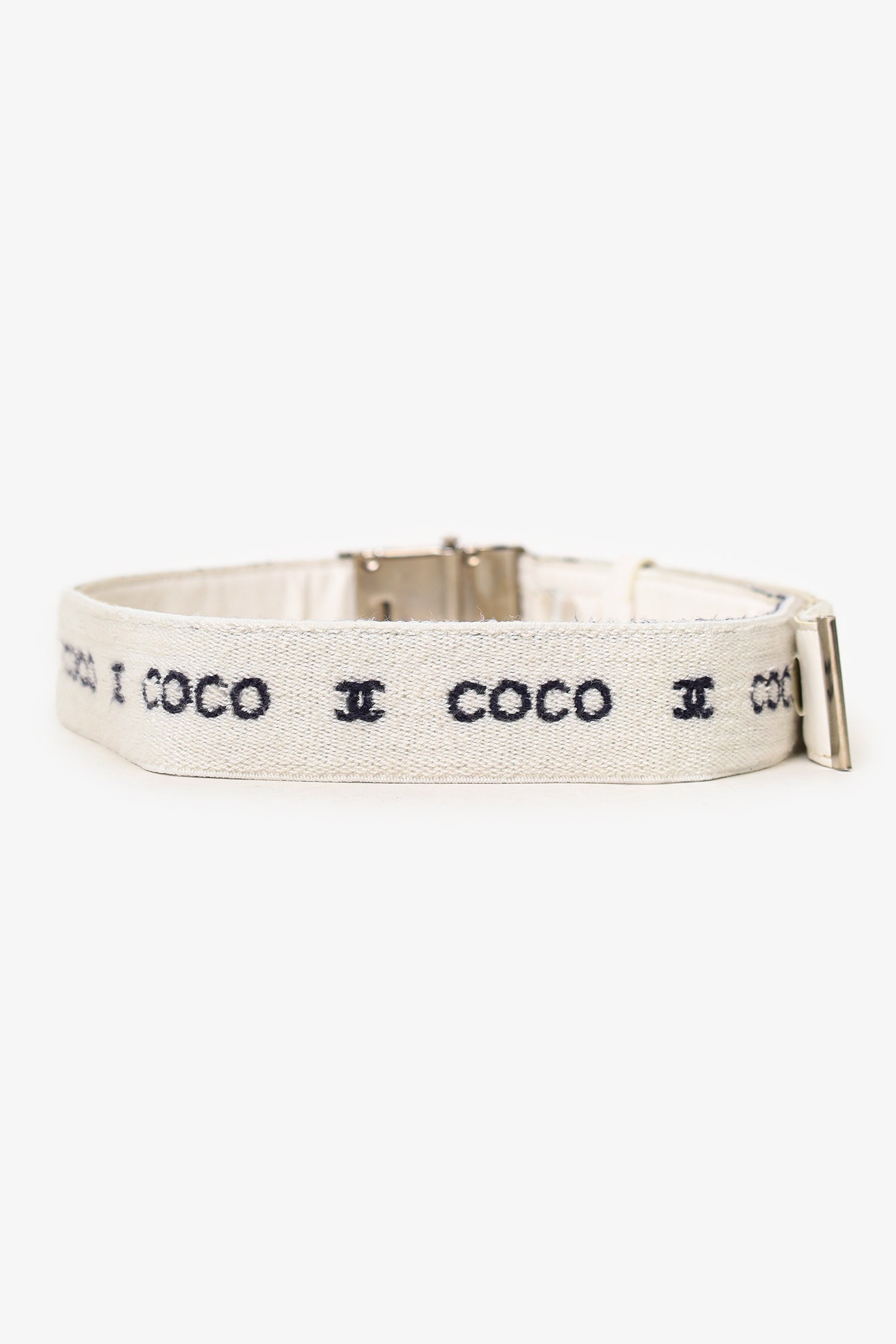 Pre-Loved Chanel™ White Wool 'Coco CC' Belt. Adjustable pull-through buckle closure. Interior leather lining. Tonal stitching. Silver-tone hardware.