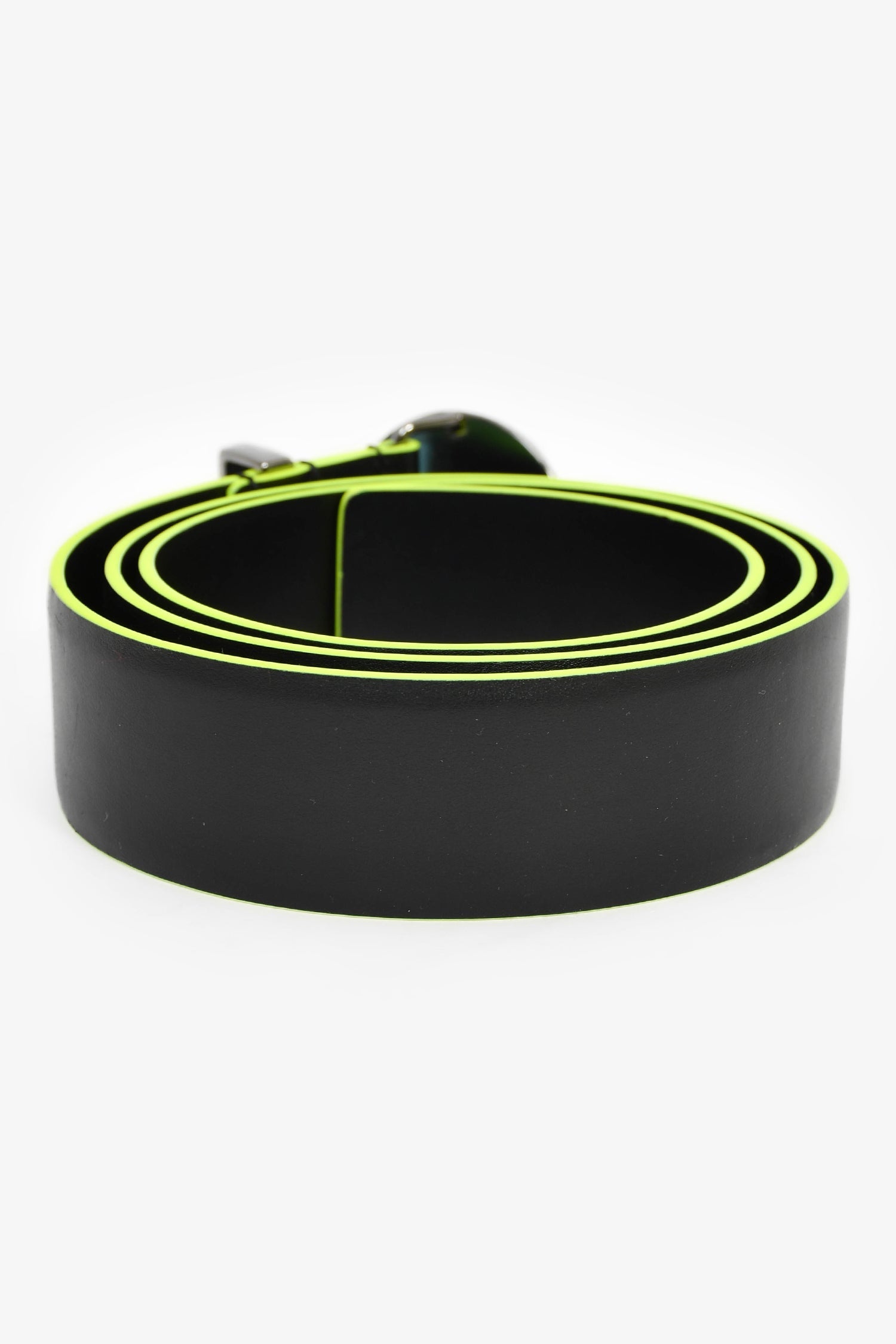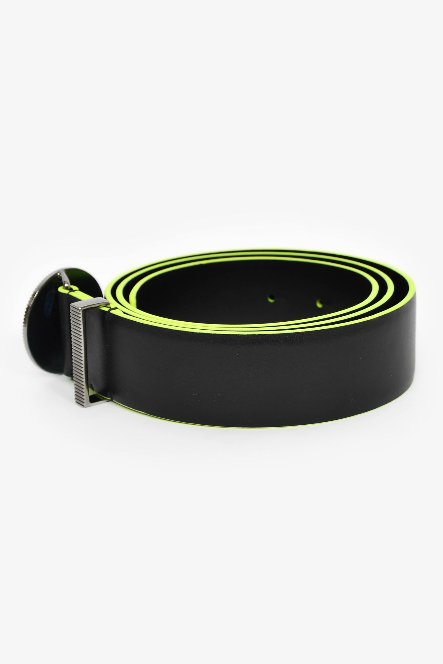 Versace Black/Neon Green Leather Medusa Belt. Medusa head buckle in black-tone hardware. Adjustable length. Tonal stitching.