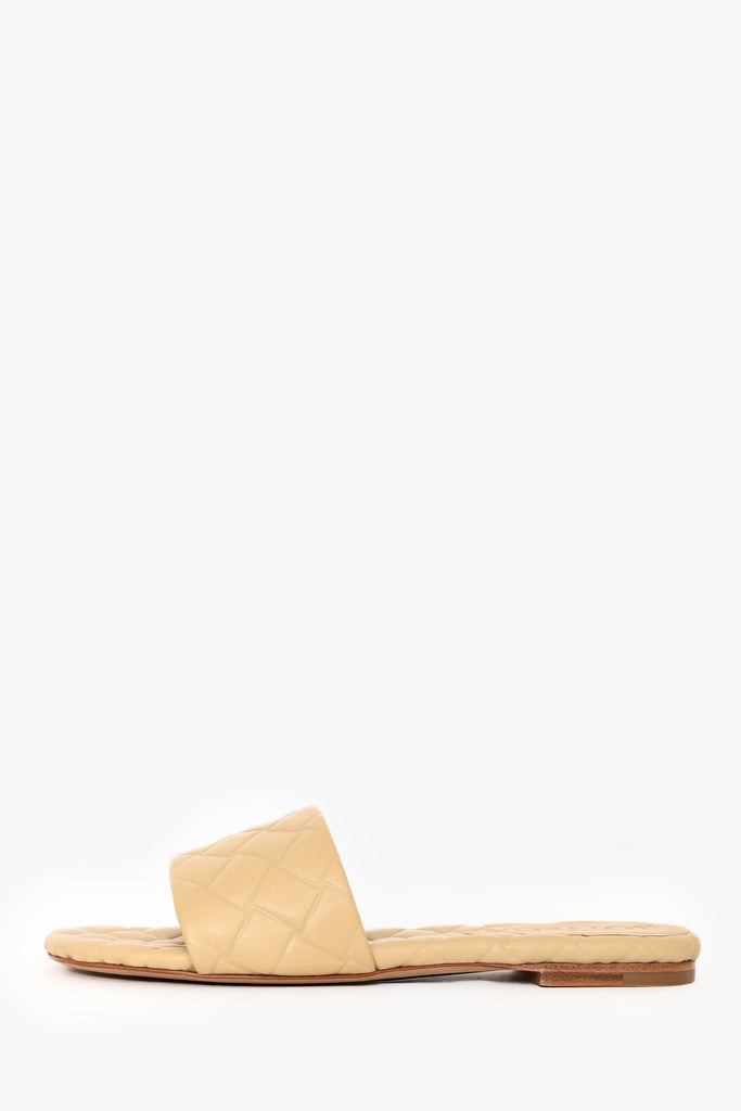 Bottega Veneta Beige Leather Amy Sandals. Slip-on. Open square toe. Wide woven leather upper strap. Leather lining and insole. Tonal stitching.
