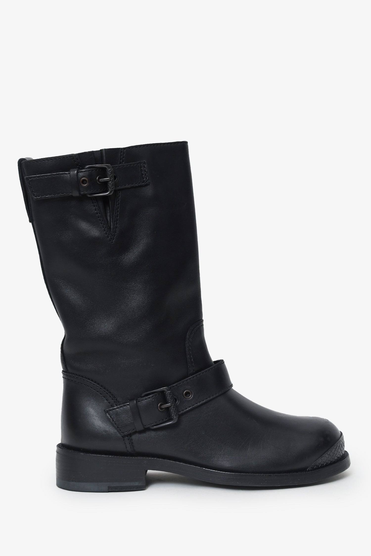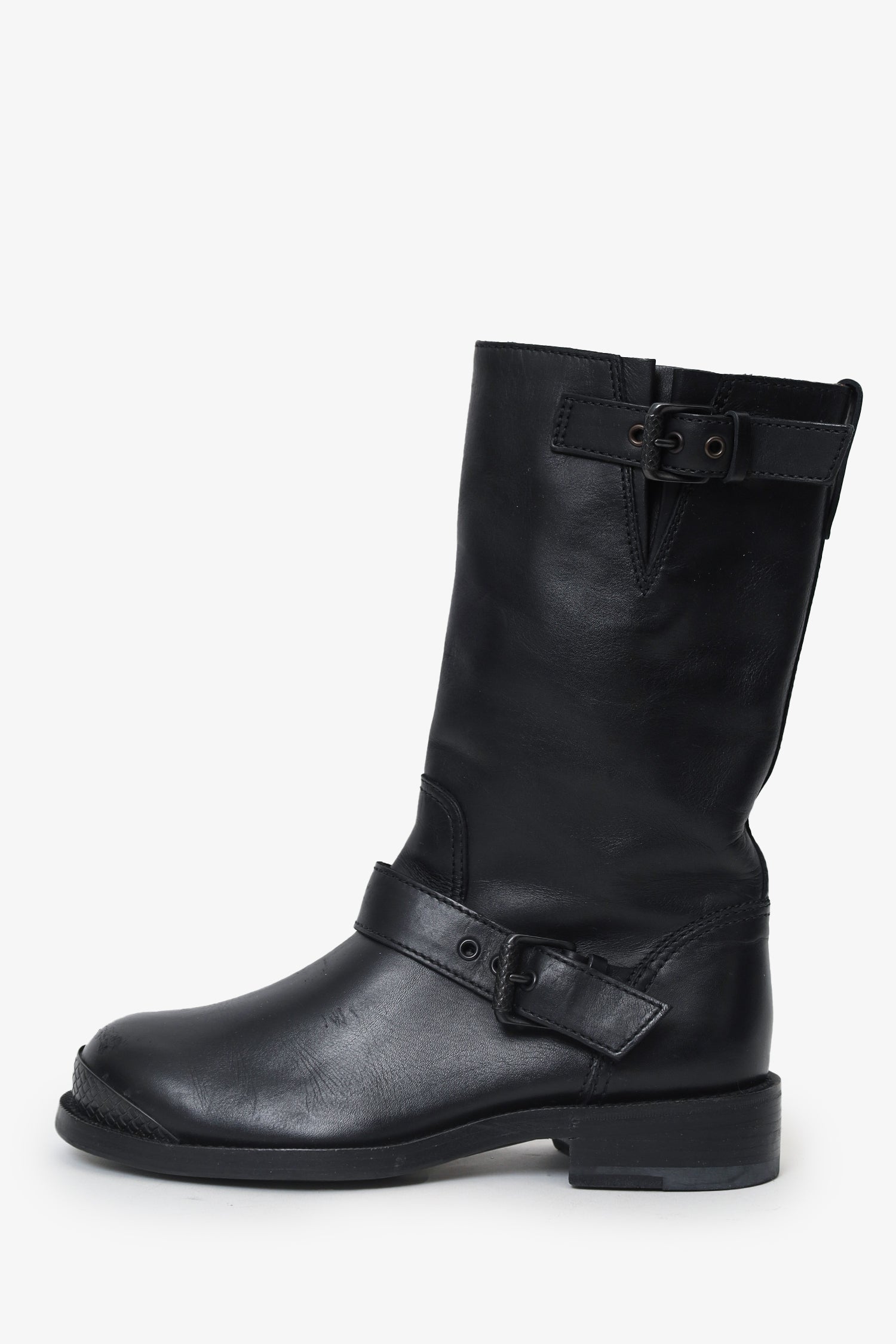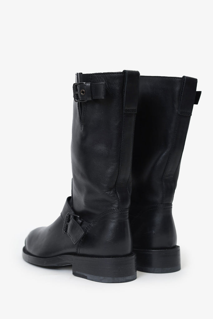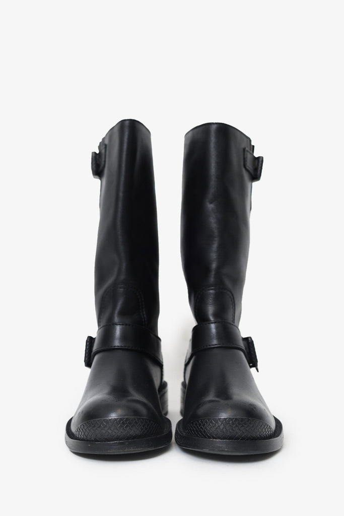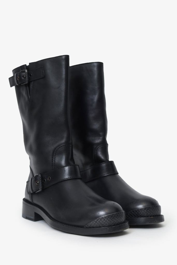 Bottega Veneta Black Leather Biker Boots. Pull-on. Round toe. Adjustable pull-through buckle closure to arch and shaft. Block heel. Rear pull tab. Lined interior. Gunmetal-tone hardware. Tonal stitching.