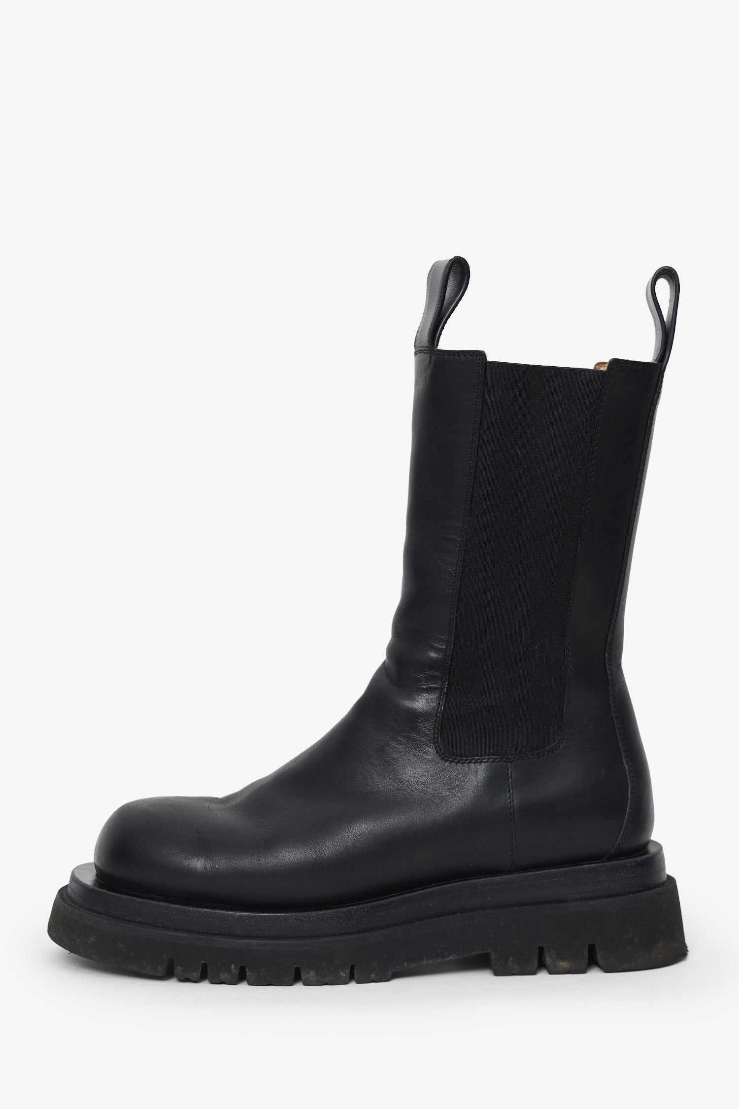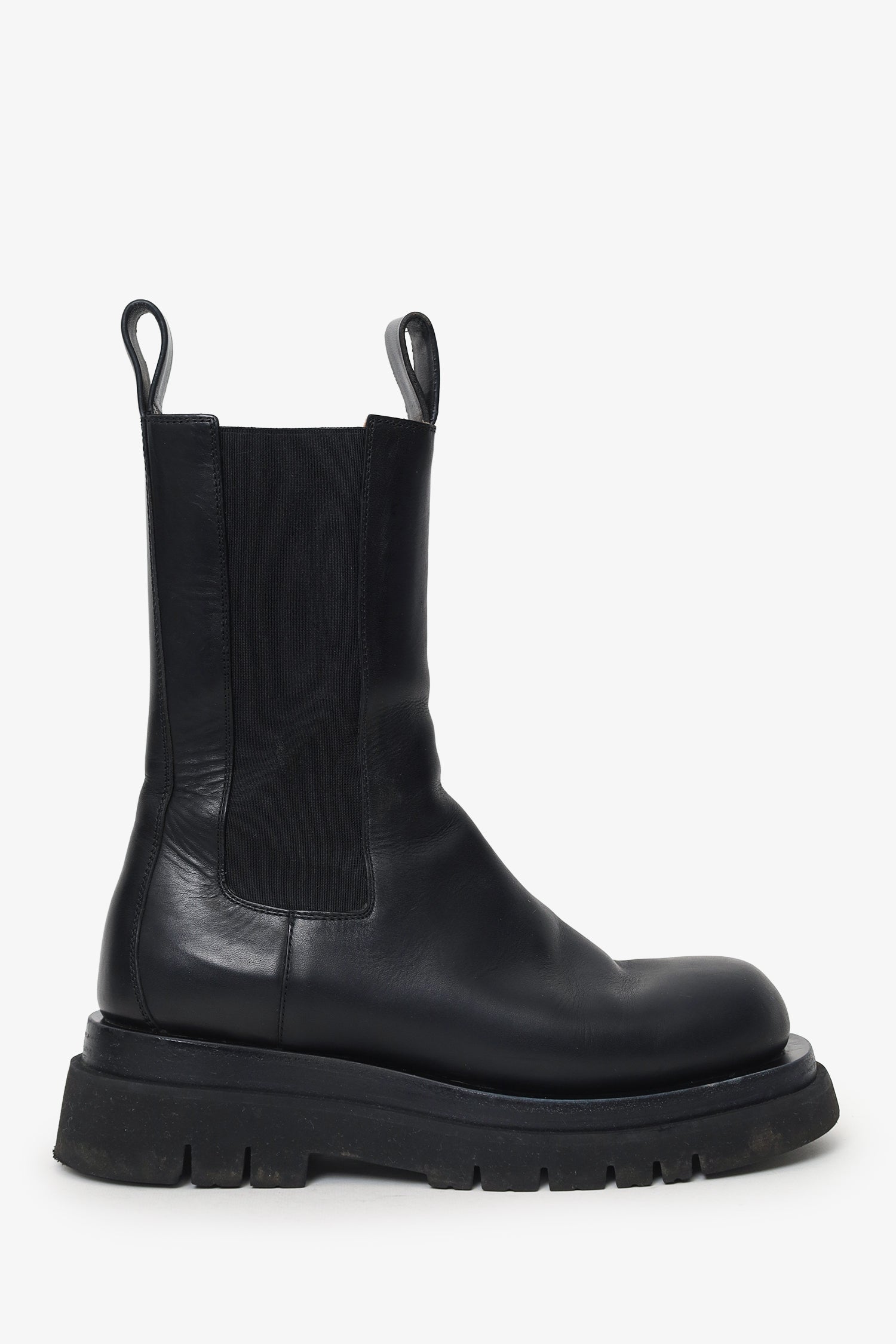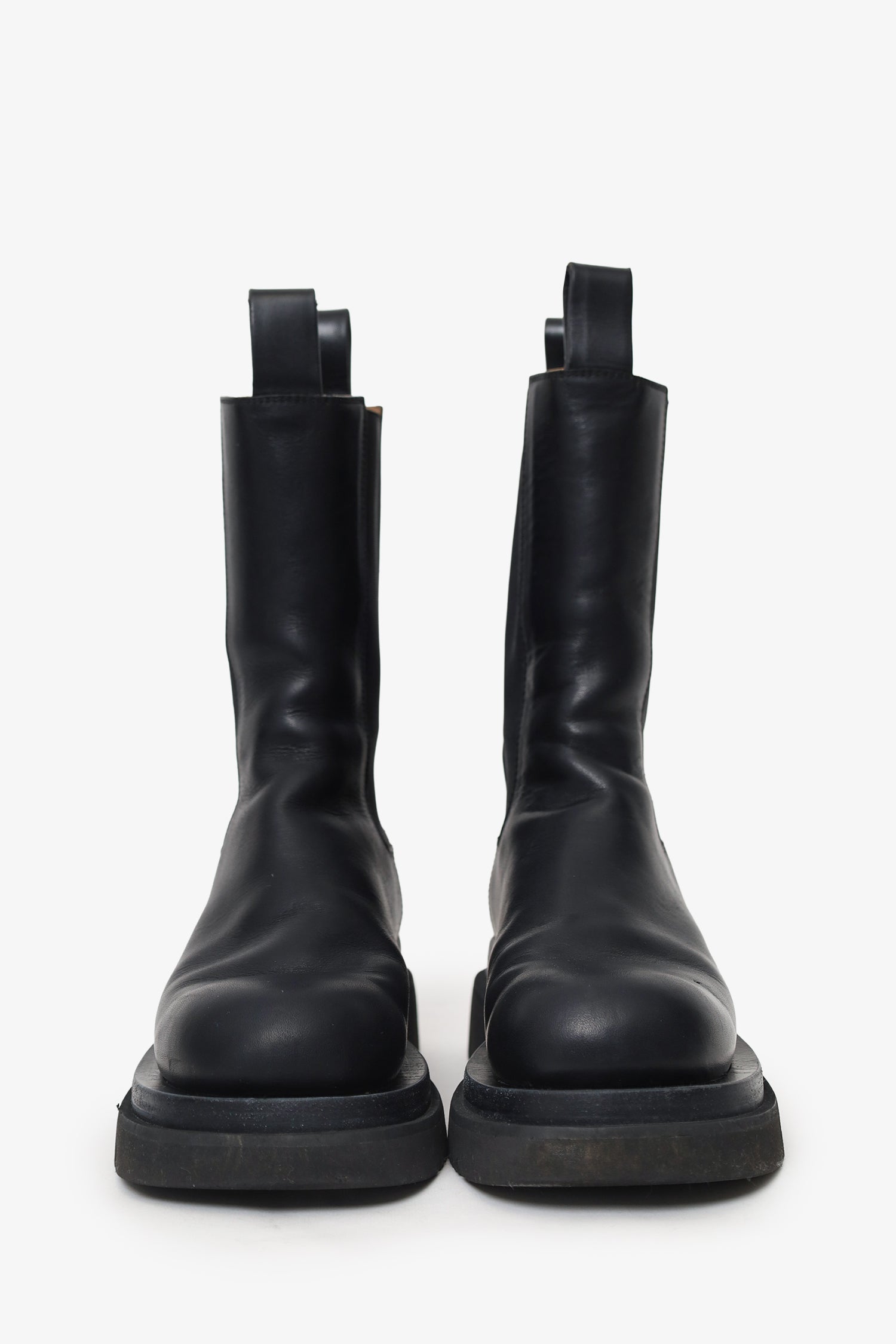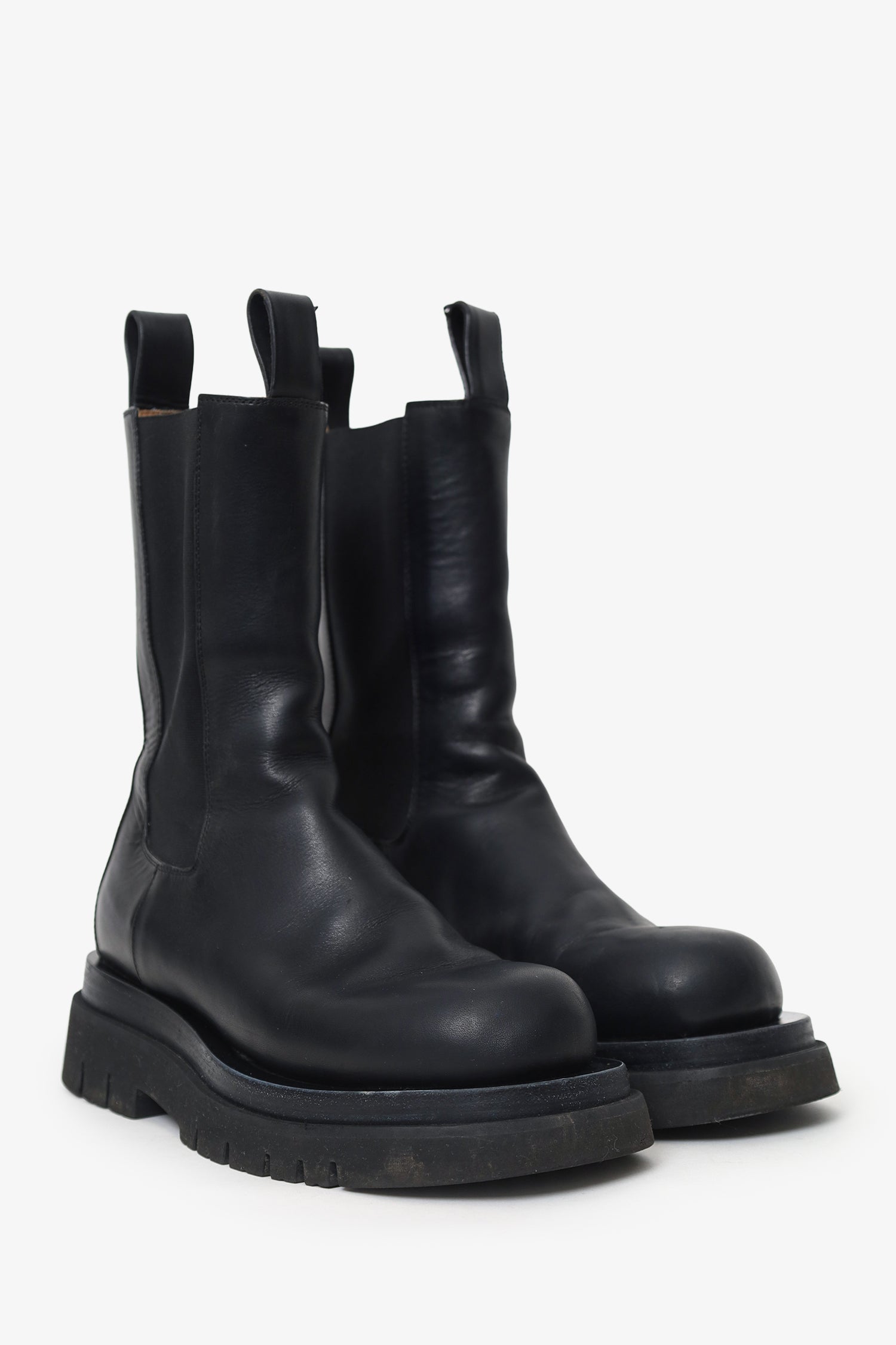 Bottega Veneta Black Leather Lug Boots. Pull-on. Round toe. Front and rear pull tabs. Tonal stitching.