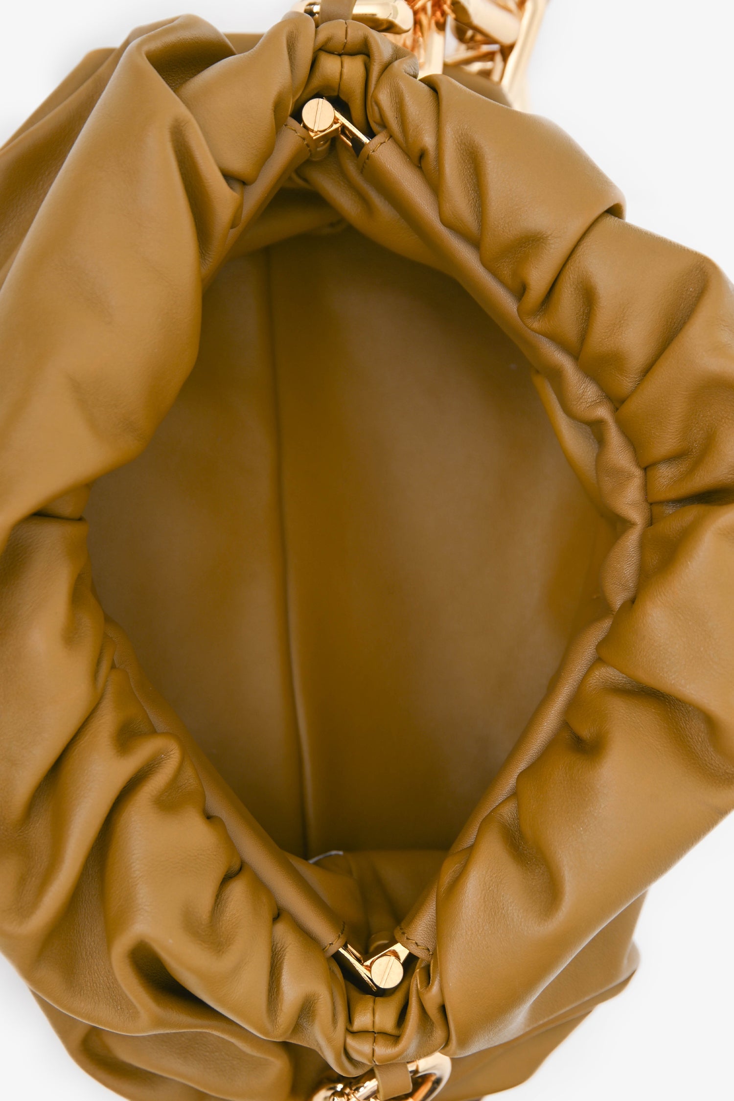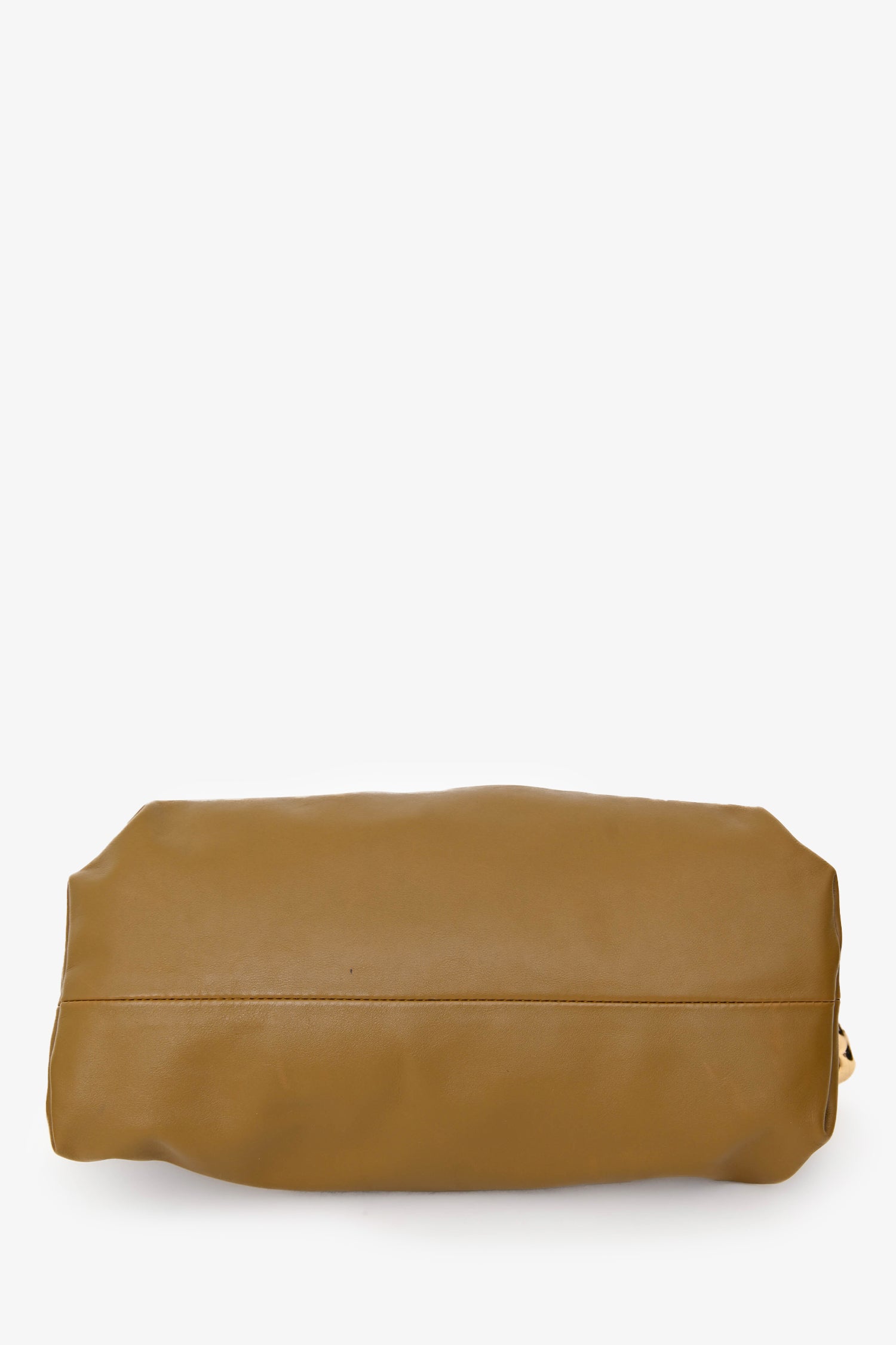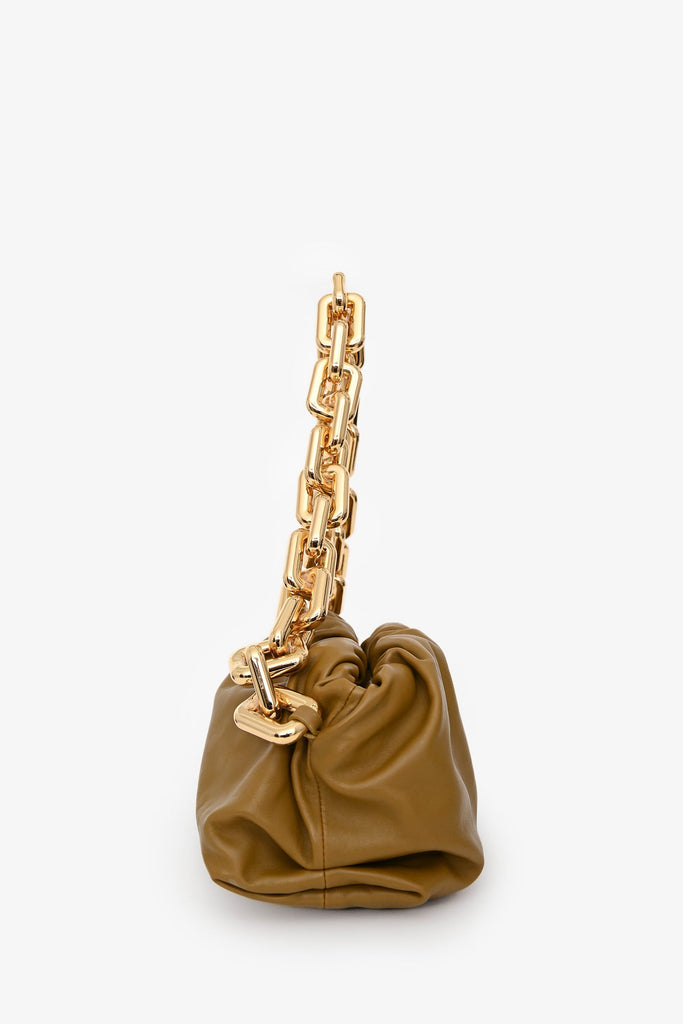 Bottega Veneta Brown Leather Chain Pouch. Concealed top hinge opening. Chain-link shoulder strap. Leather-lined interior. Gold-tone hardware. Tonal stitching.