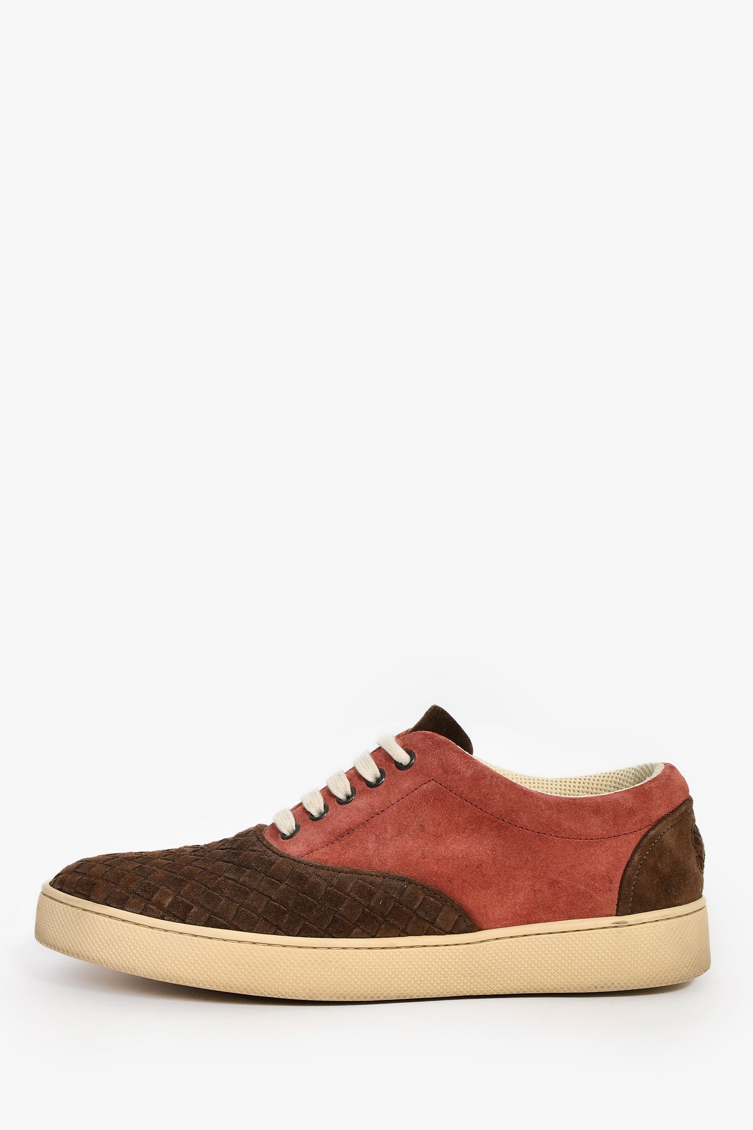 Bottega Veneta Burgundy/Brown Suede Leather Intrecciato Sneakers. Slip-on. Round toe. Lace-up closure. Tonal stitching.