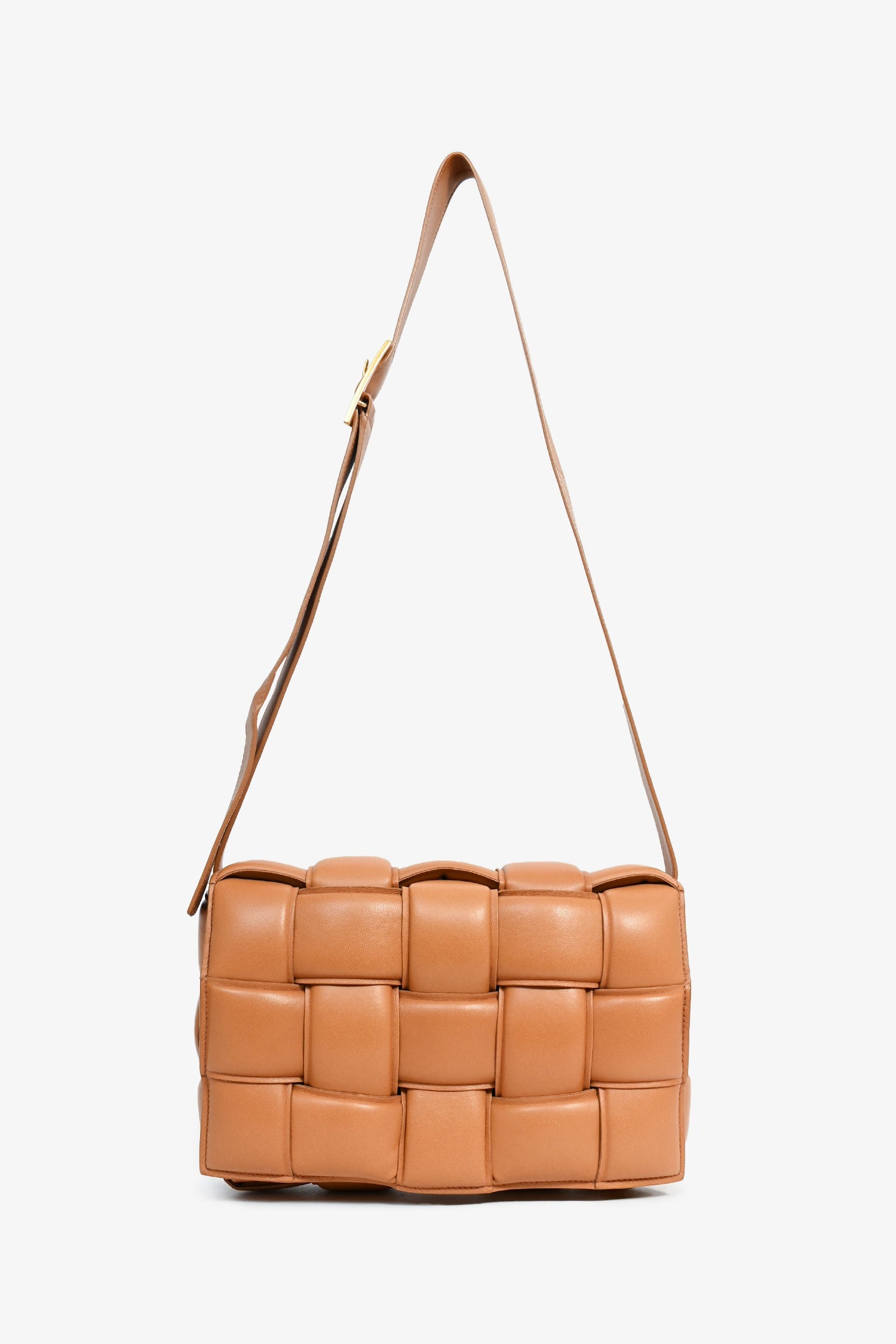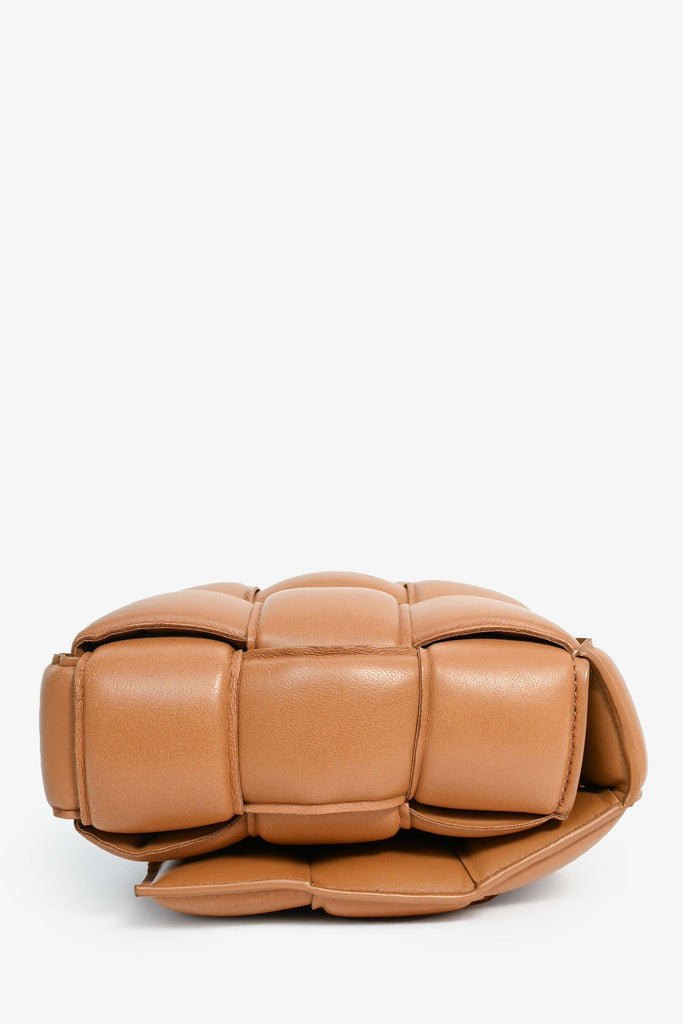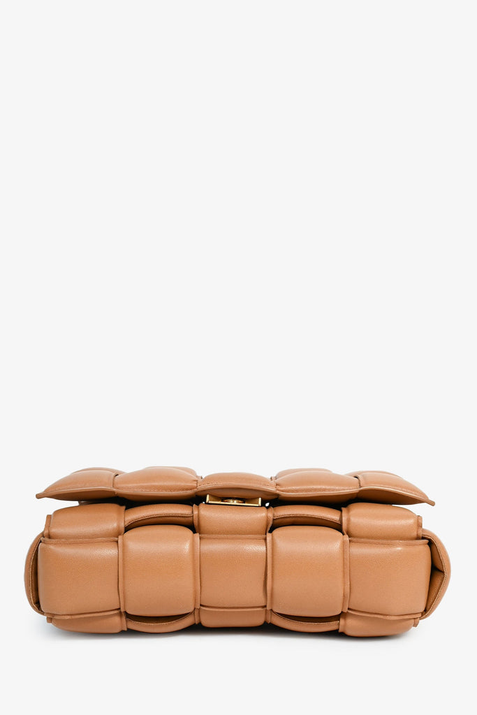 Bottega Veneta Camel Padded Cassette Crossbody Bag. Front fold-over flap with a slide-up closure. Interior compartment with a wall zip pocket. Adjustable strap. Gold-tone hardware. Unlined. Tonal stitching.