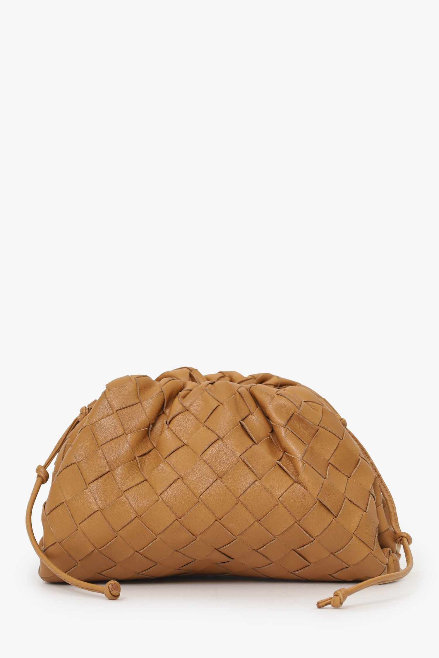 Bottega Veneta Caramel Intrecciato Mini Pouch Bag. Top magnetic closure. Leather crossbody strap. Lined interior. Gold-tone hardware. Tonal stitching.