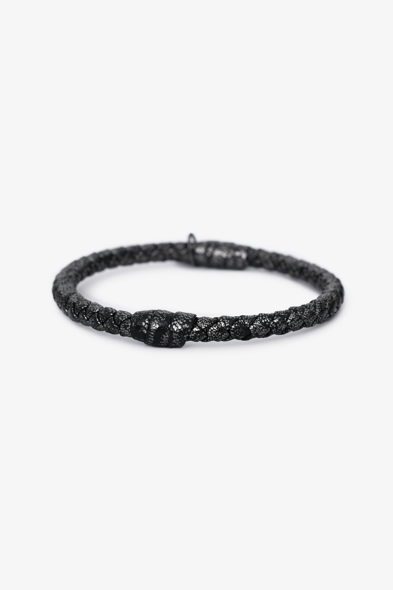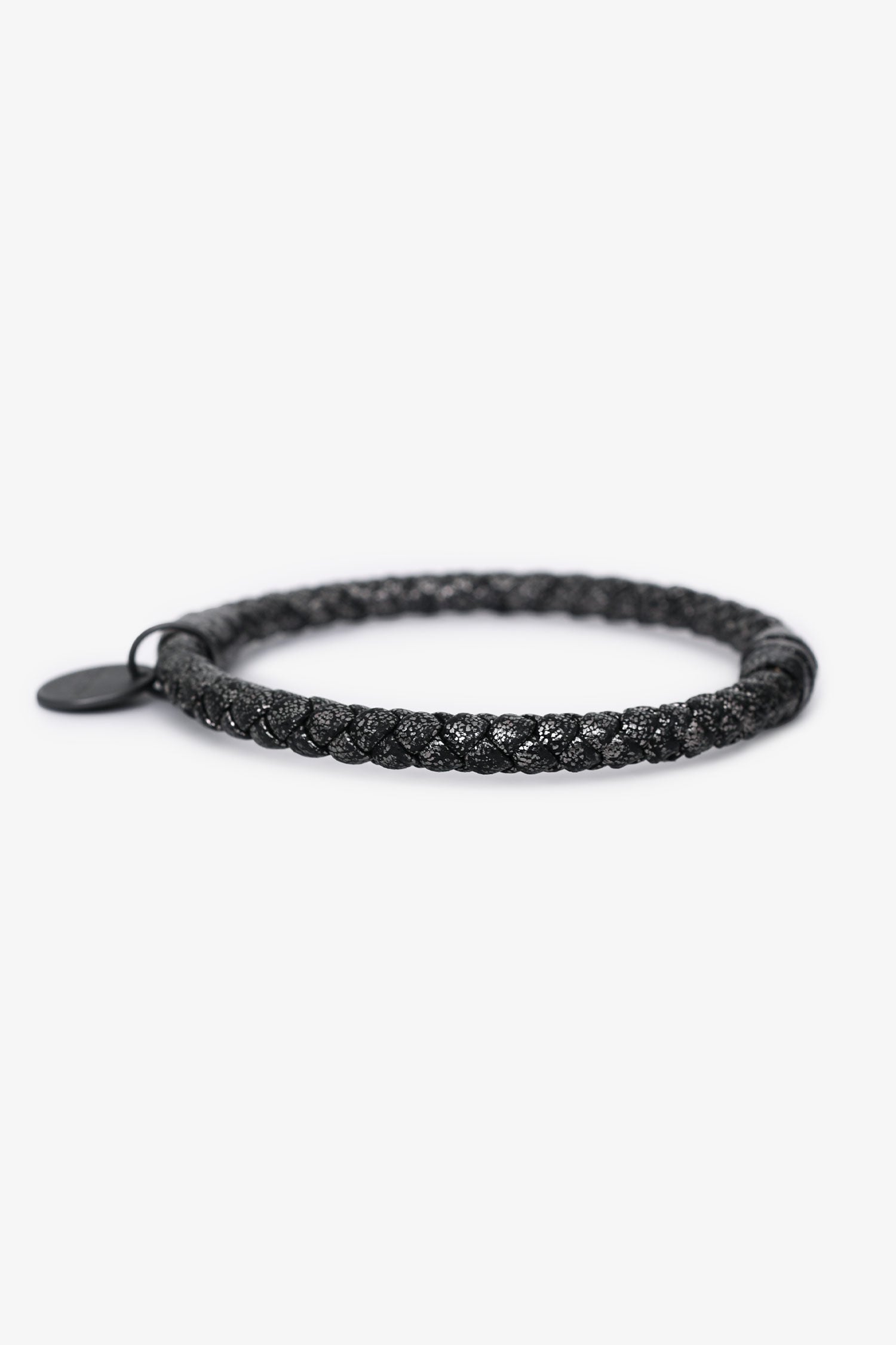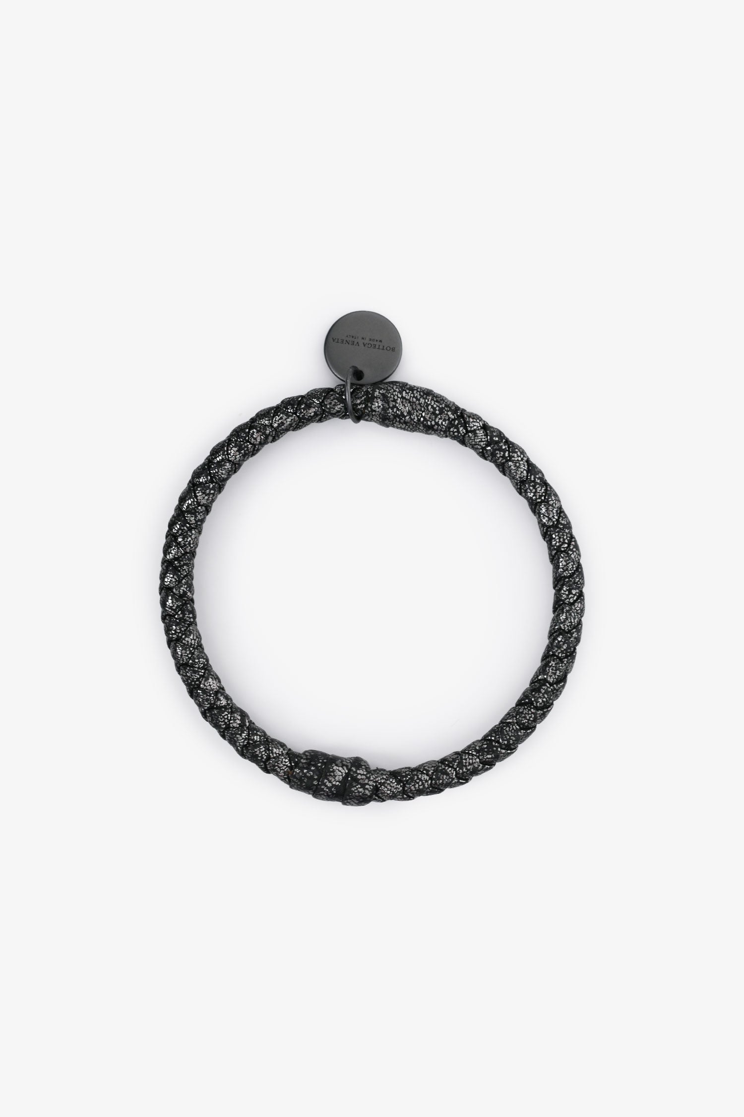 Bottega Veneta Dark Grey Metallic Leather Intrecciato Bracelet. Pull-on. Tonal hardware. Tonal stitching.
