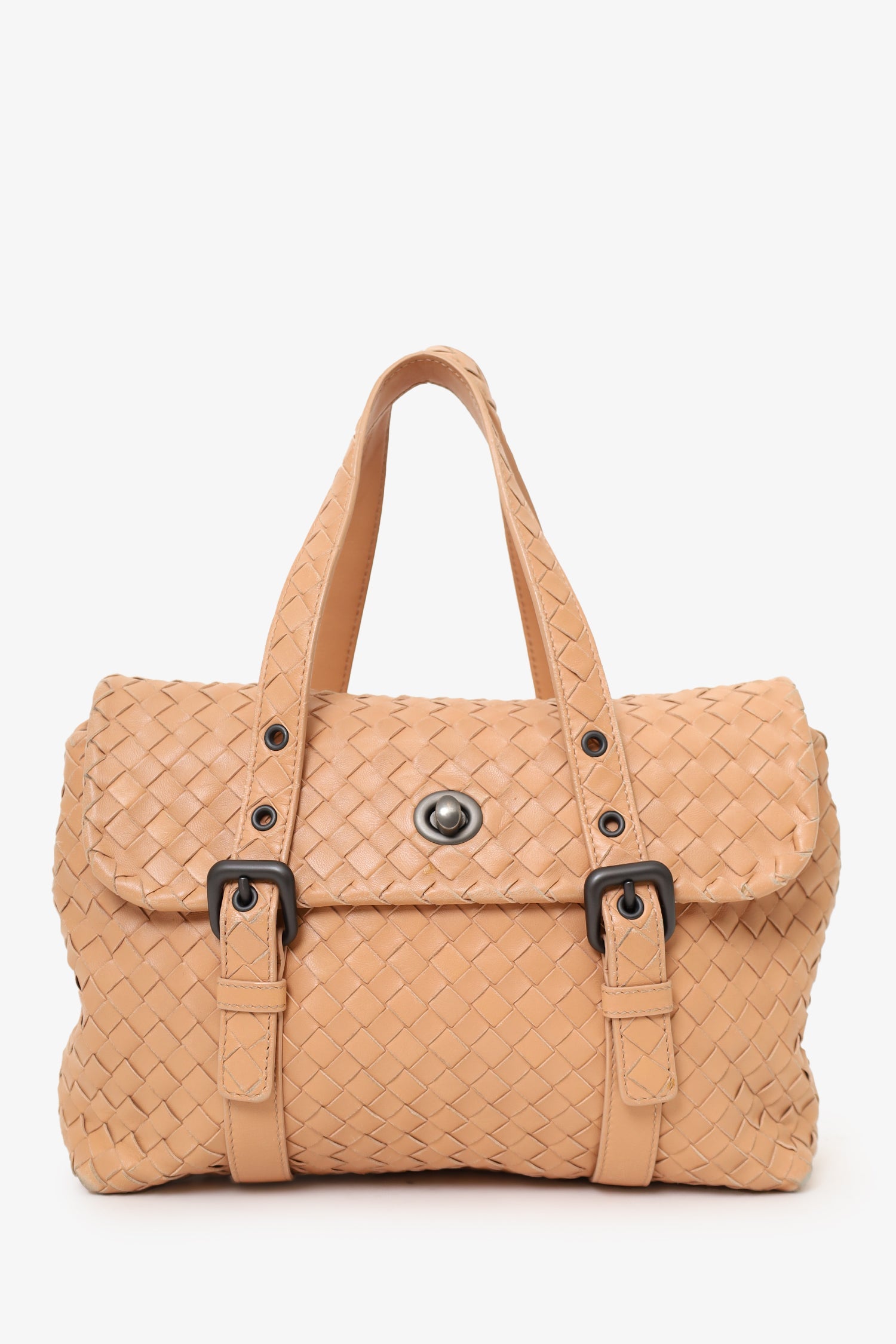 Bottega Veneta Pink Intrecciato Leather 2way Bag Leather Shoulder Bag With Strap. Front fold-over flap with turn-lock closure. Twin handle straps with adjustable strap drop (adjustable buckle closure). Removable crossbody strap. Suede-lined interior. Single interior zip pocket. Gunmetal hardware. Tonal stitching.