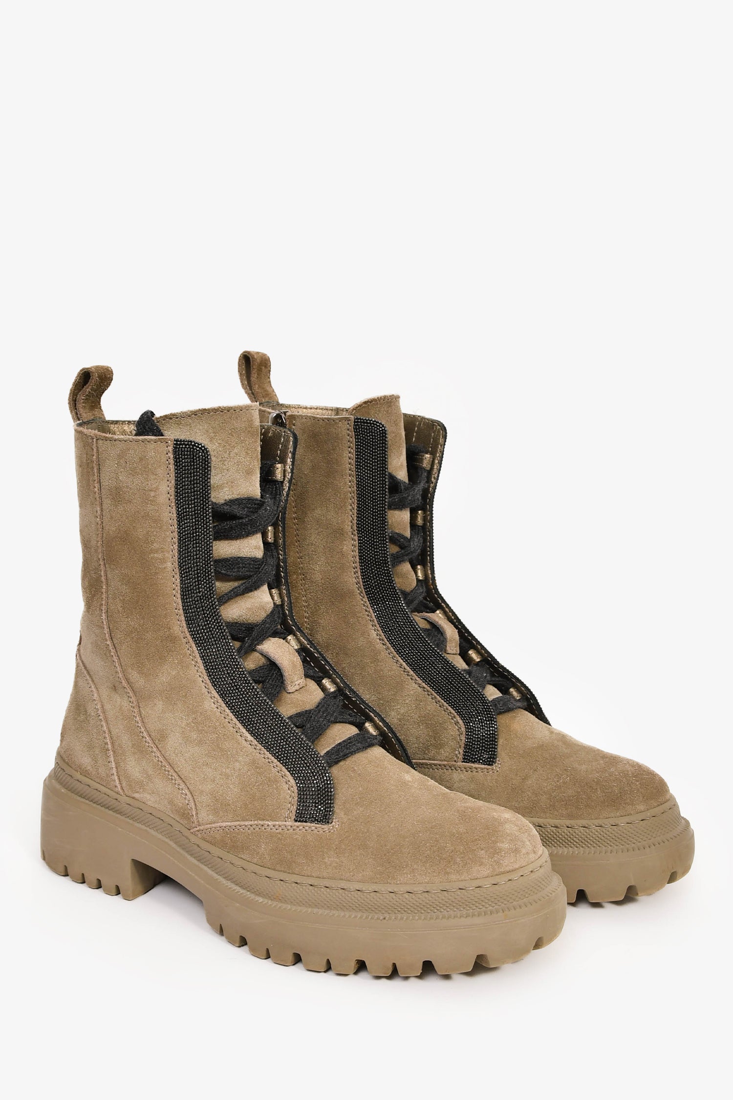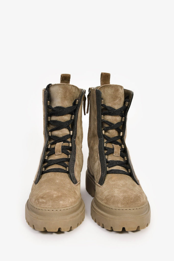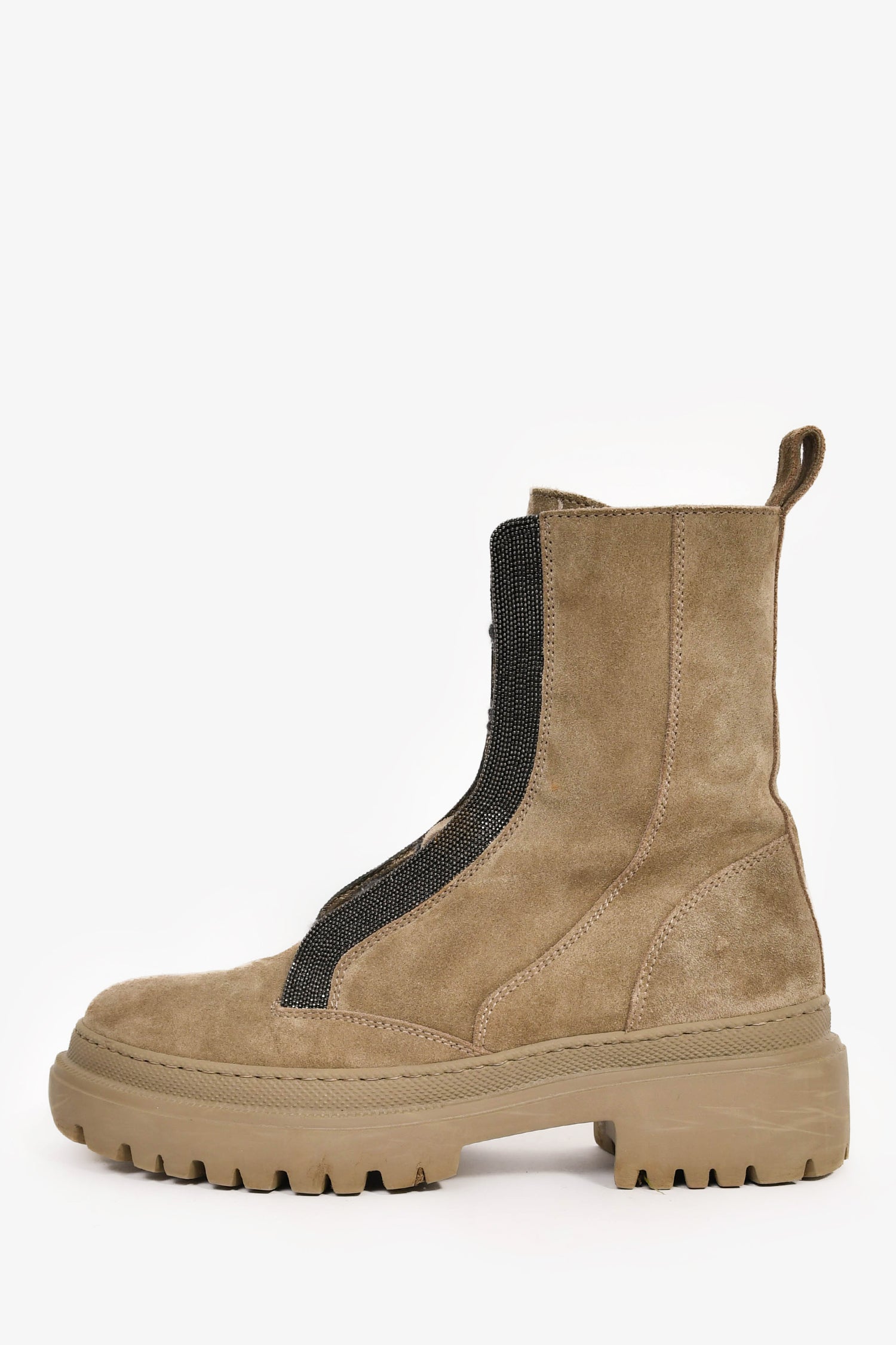 Brunello Cucinelli 2021 Taupe Monili Ankle Boots. Pull-on. Round toe. Side zip and lace-up closure. Tonal stitching.
