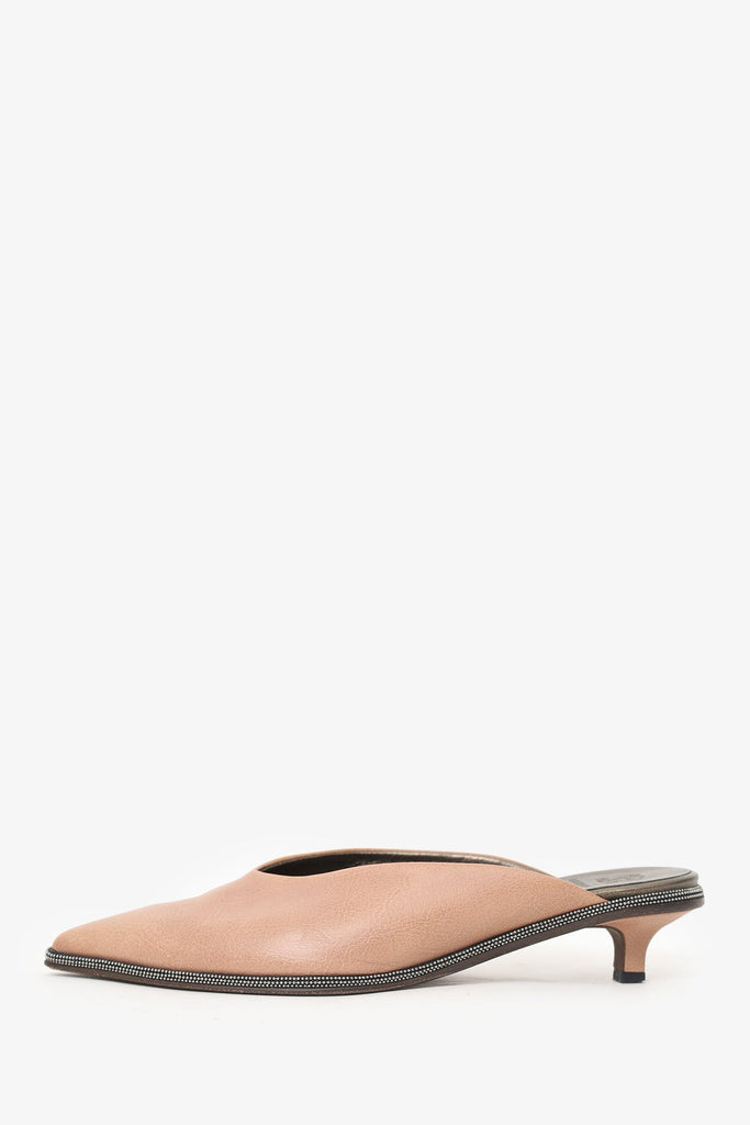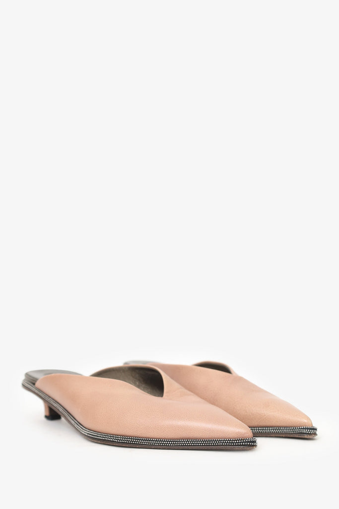Brunello Cucinelli Beige Leather Beaded Pointed Toe Mule. Slip-on. Pointed-toe. Beaded trim. Silver-tone hardware. Tonal stitching.