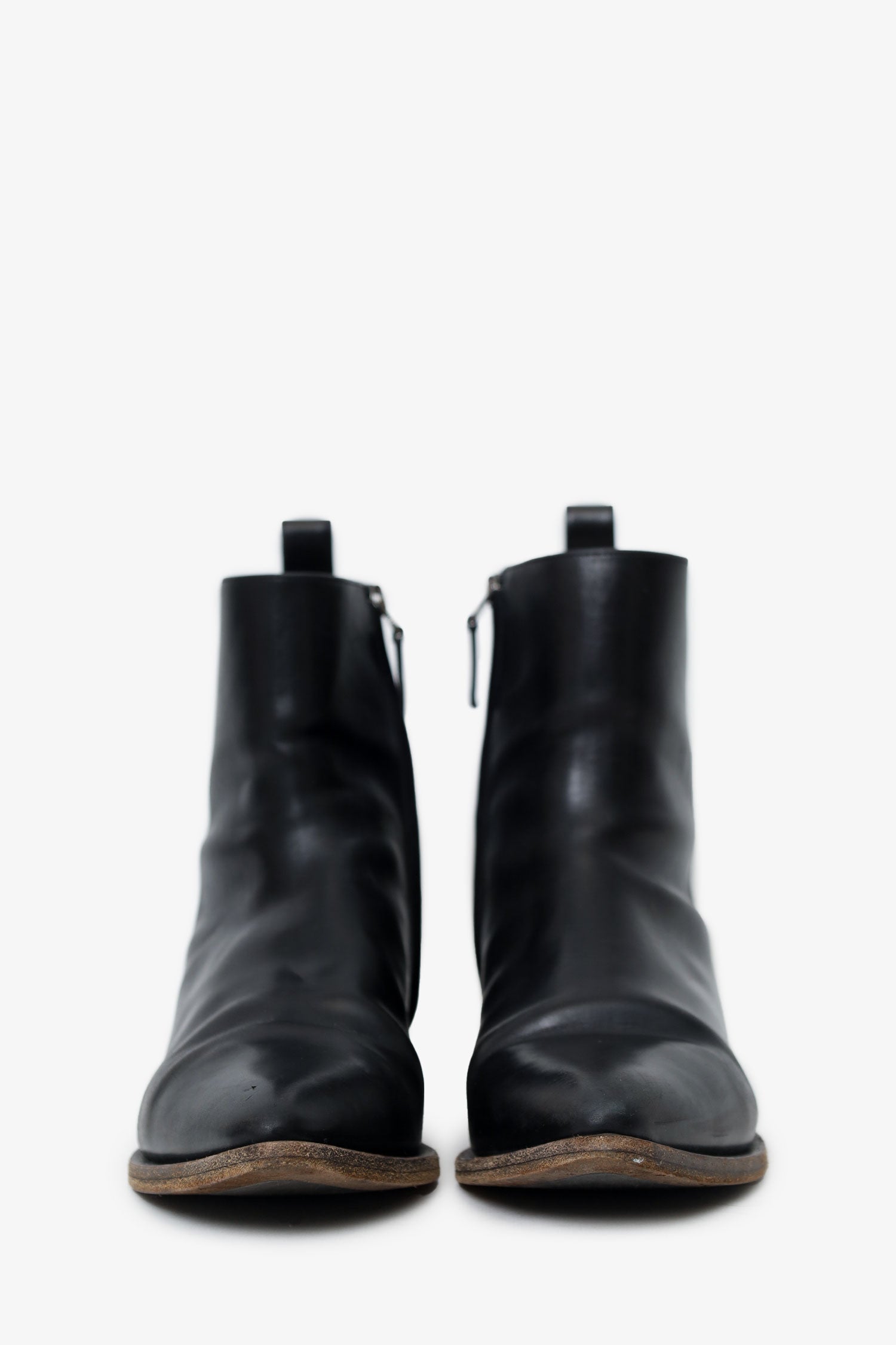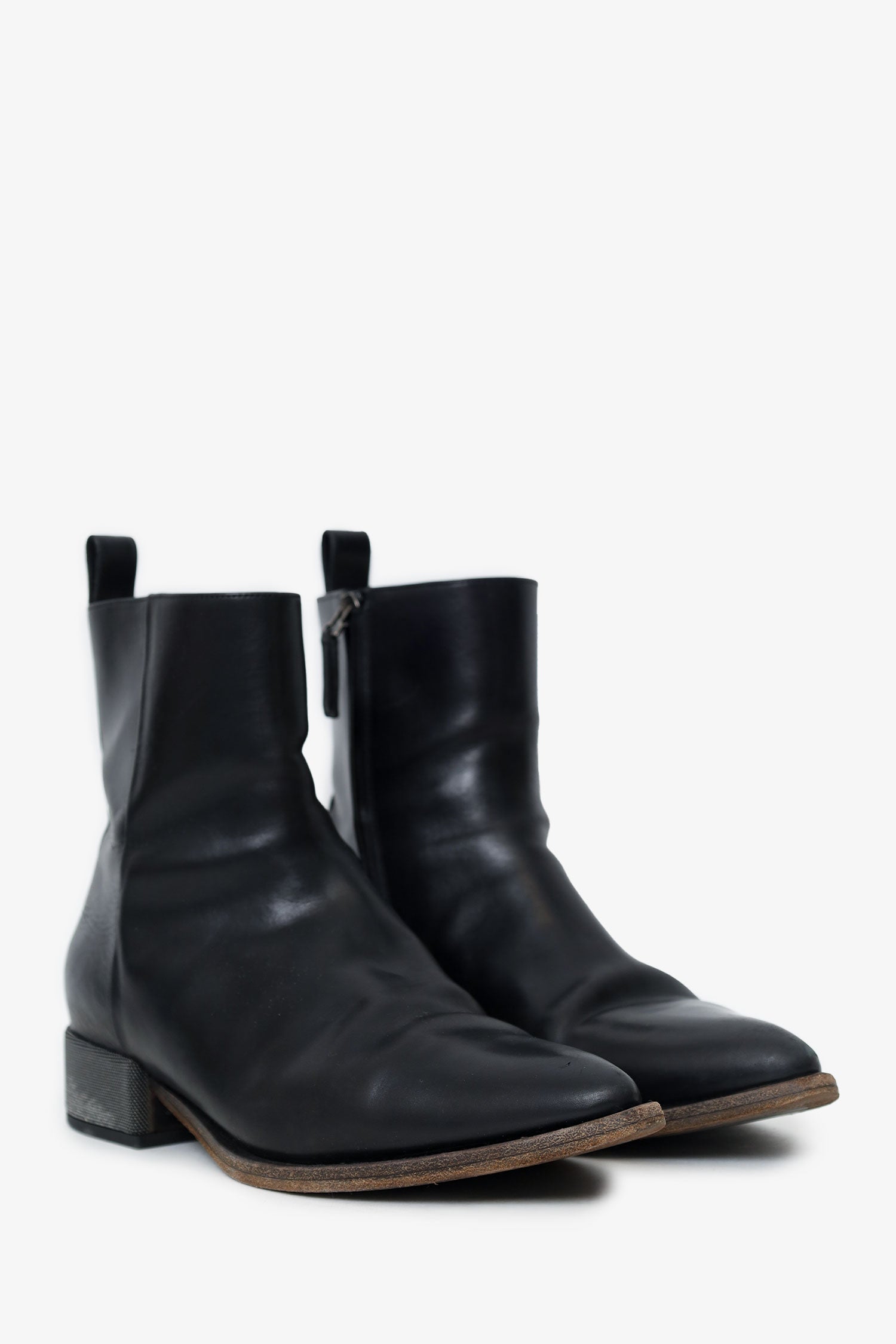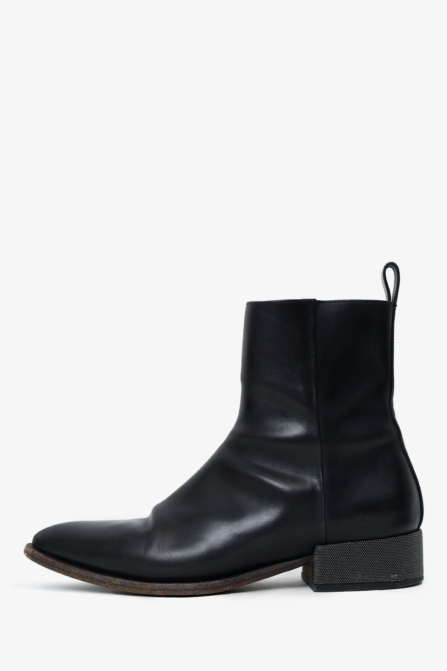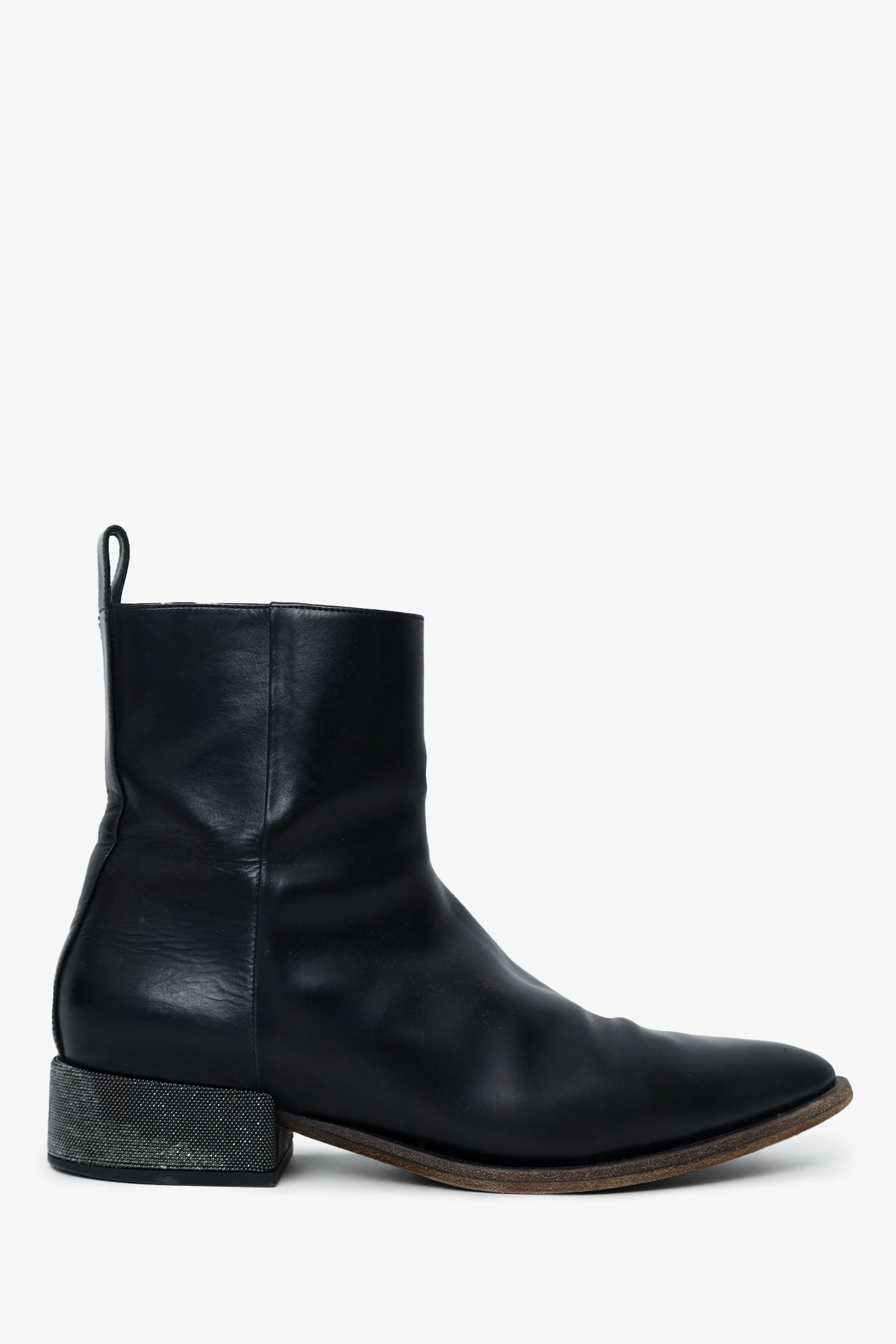Brunello Cucinelli Black Leather Pointed Beaded Heel Ankle Boots. Pull on. Side zip closure. Rear pull tab. Pointed toe. Silver-tone hardware. Tonal Stitching.