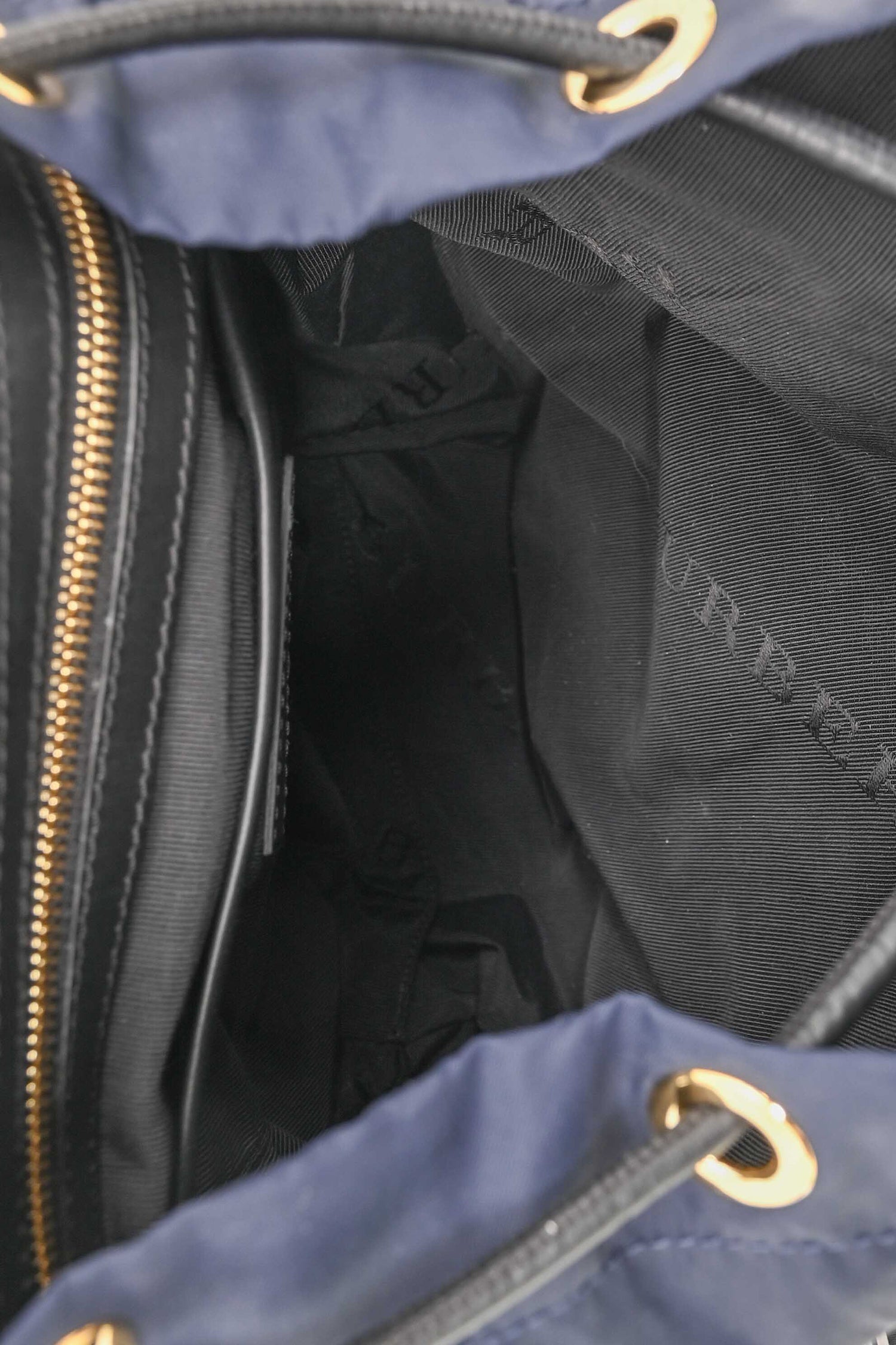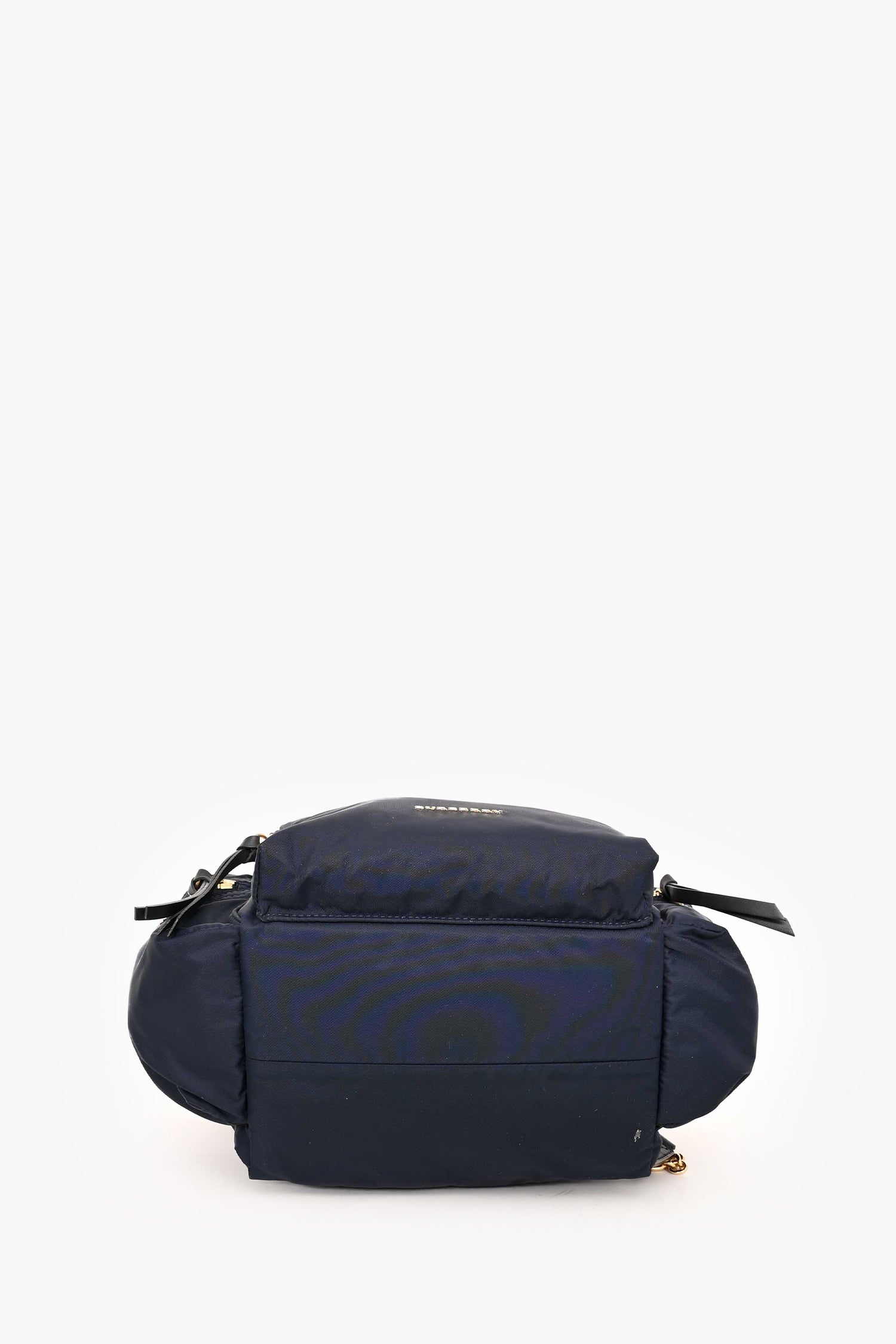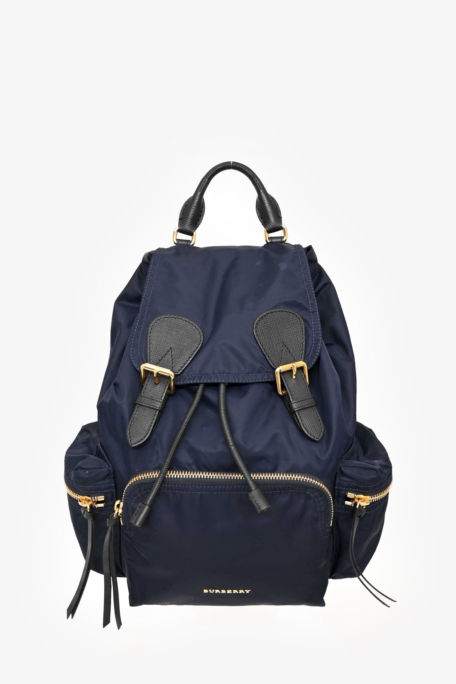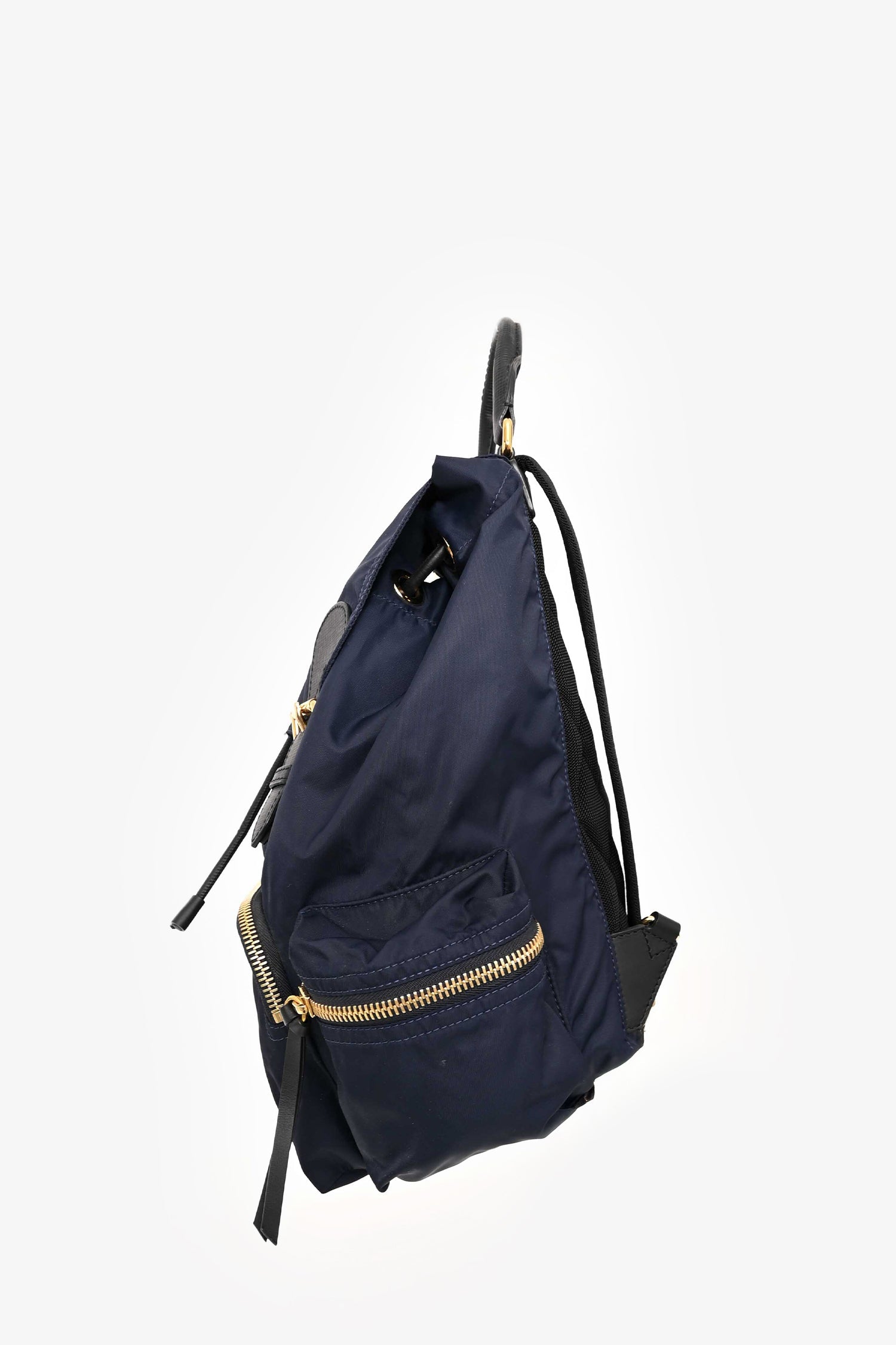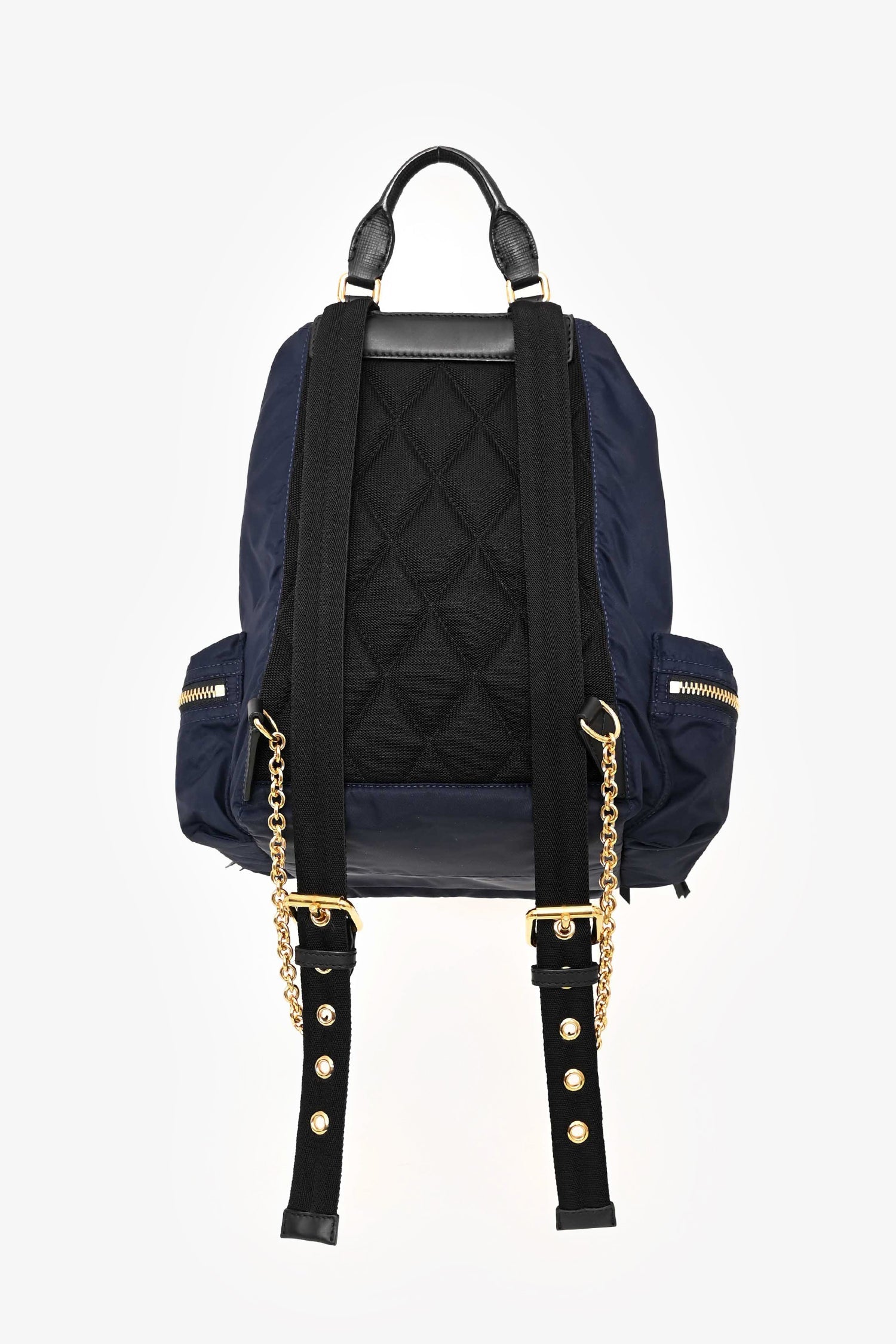 Burberry Navy Nylon Gold Chain Backpack. Flap with drawstring and snap closure. Adjustable shoulder straps and leather top handle. 3 exterior zip pockets; 1 interior zip pocket; 1 interior slip pocket. Quilted backing. Gold-tone hardware. Tonal stitching.