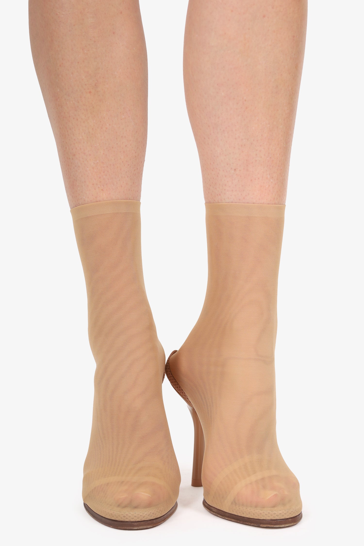 Burberry Tan Mesh 110mm Ankle Boots. Pull-on. Pointed-toe. Mesh body. Tonal stitching.