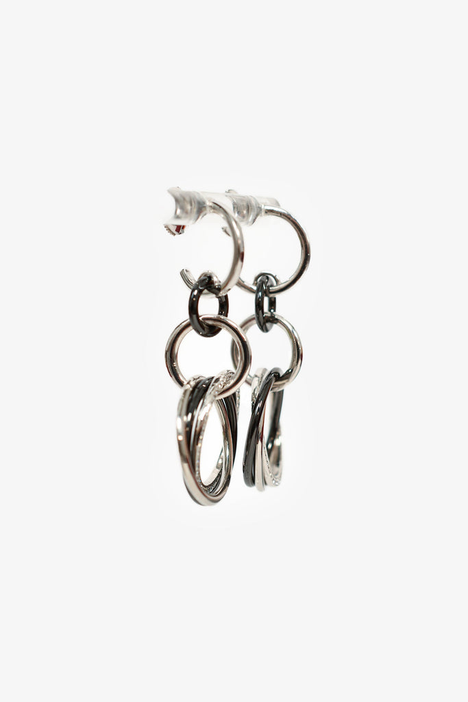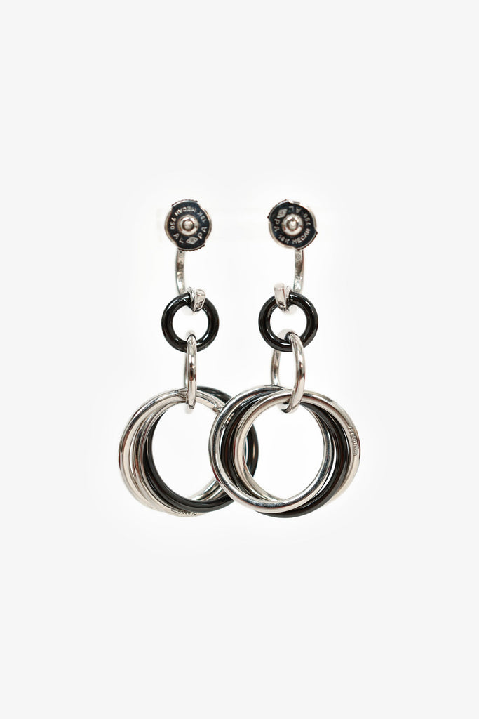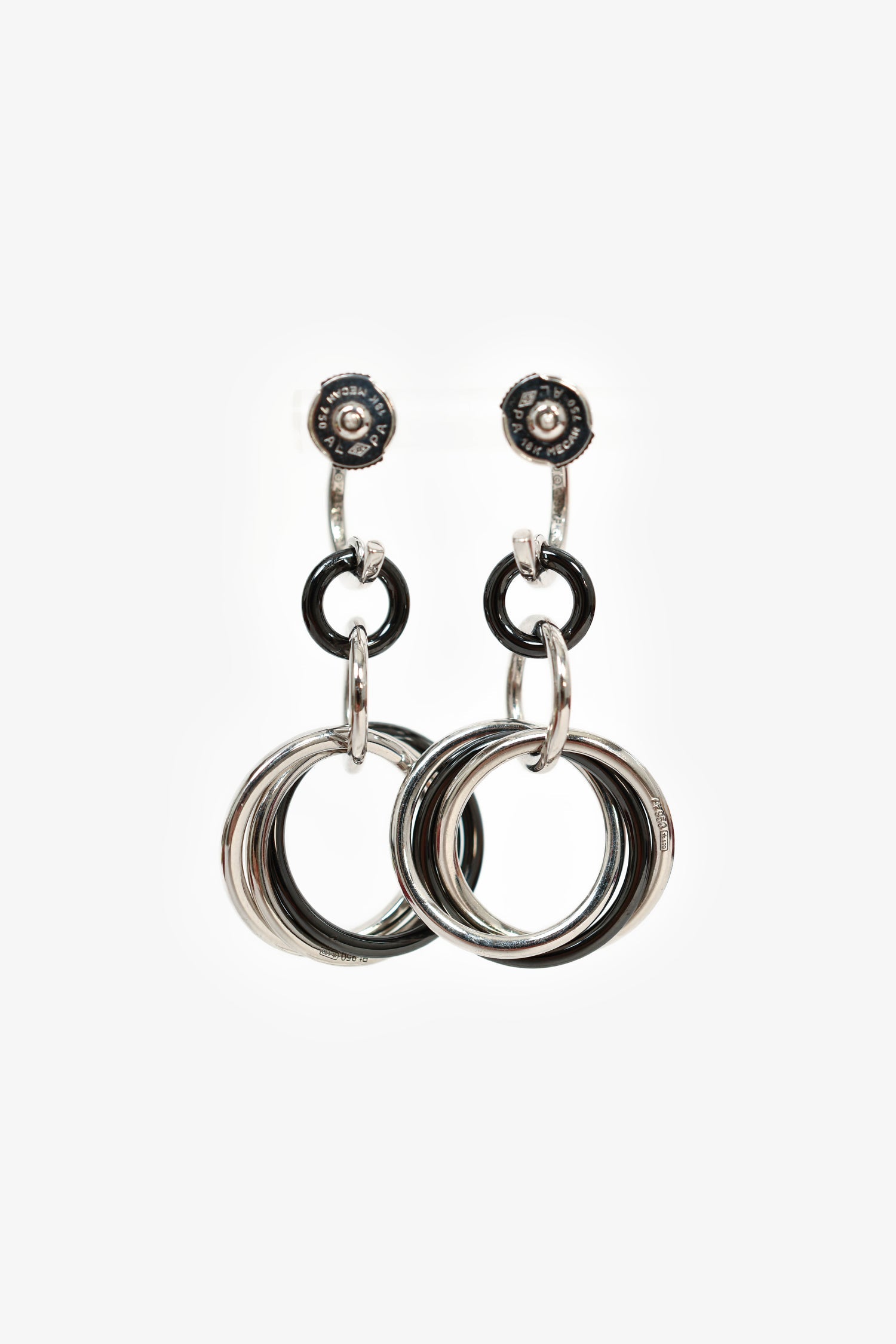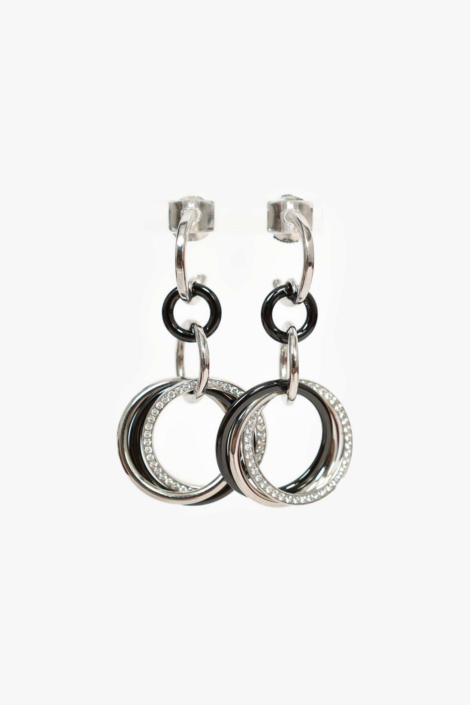 Cartier 18K White Gold/Black Ceramic Diamond Trinity Earrings. 18K White Gold. Black Ceramic. Encrusted diamonds. Rounded post-stud closure.