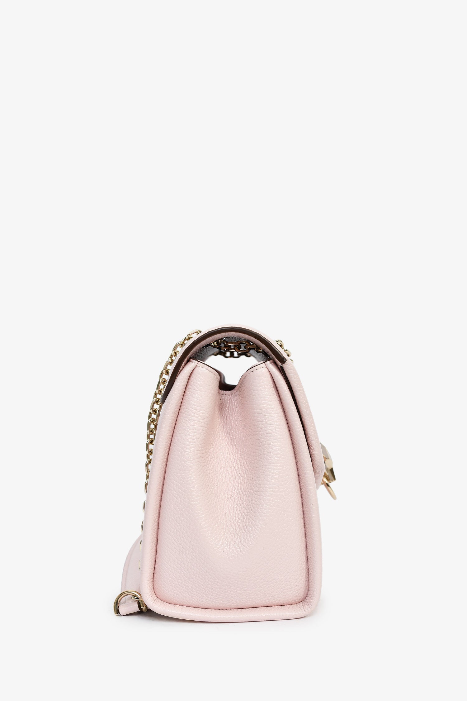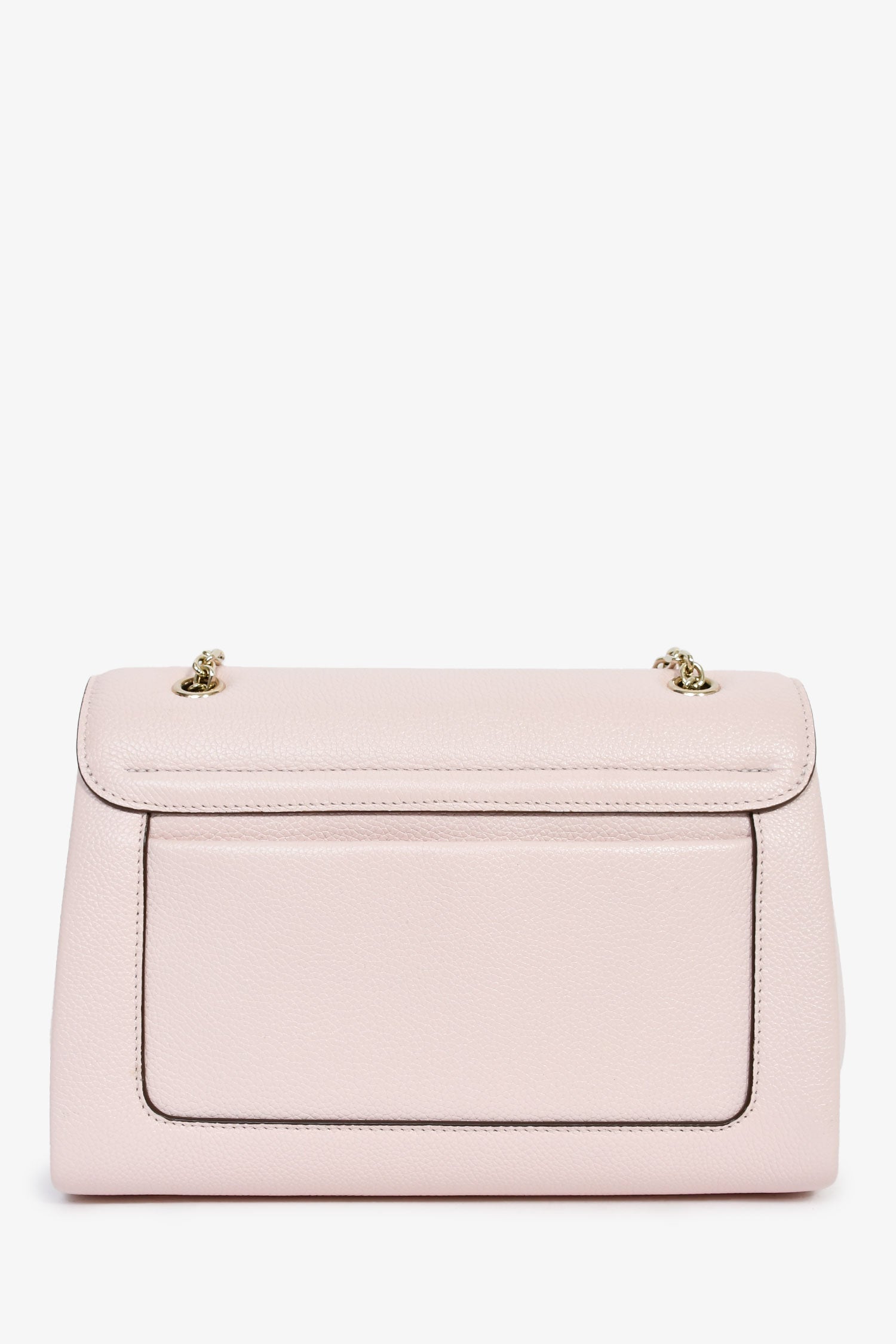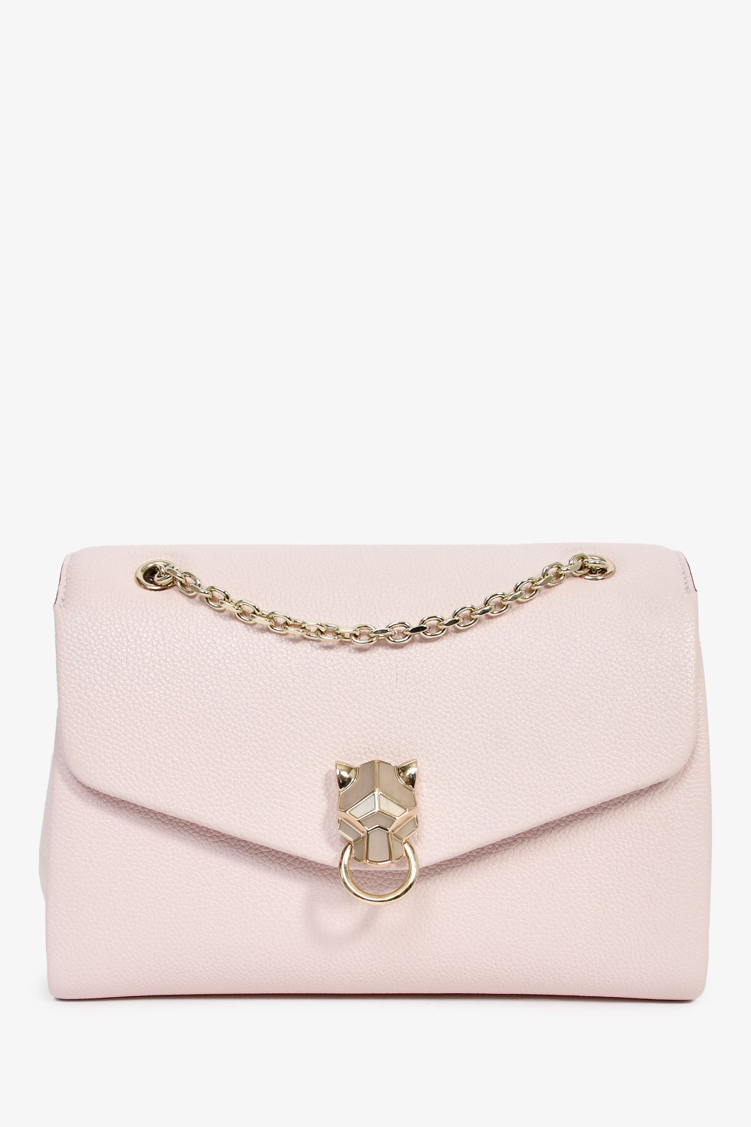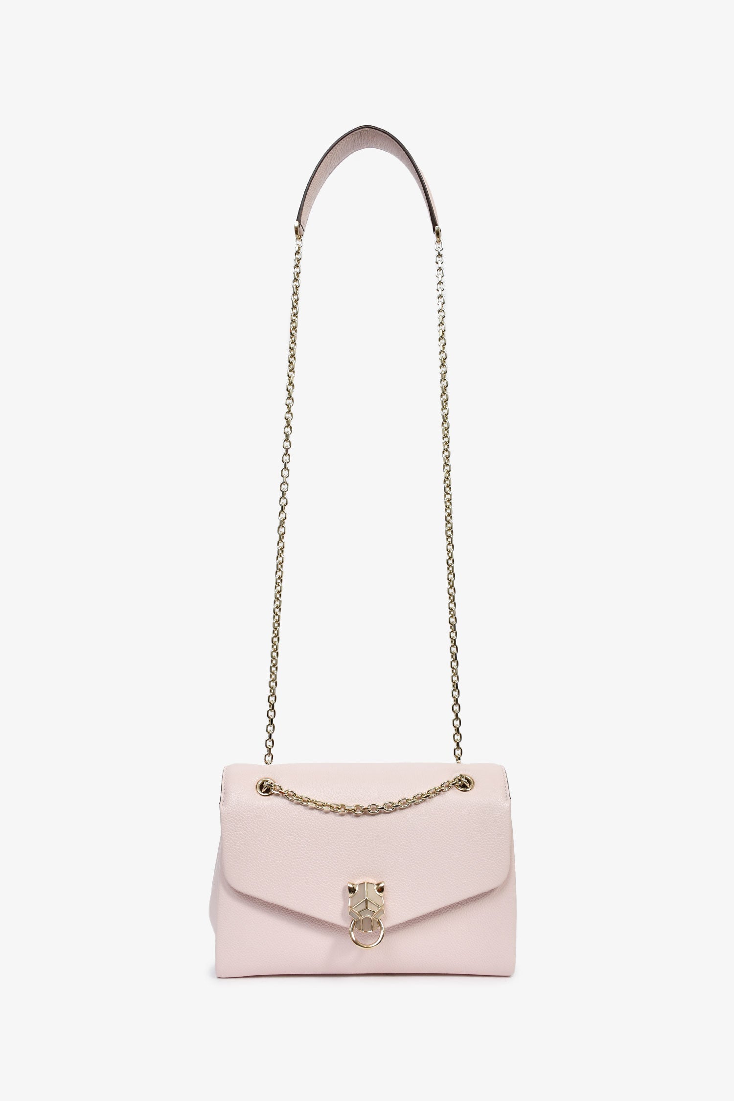 Cartier Pink Leather Small Panthere Graphique Shoulder Bag. Front fold-over flap. Chain-link and leather shoulder strap. 3 interior compartments. 1 mirror slot. Gold-tone hardware. Tonal stitching.
