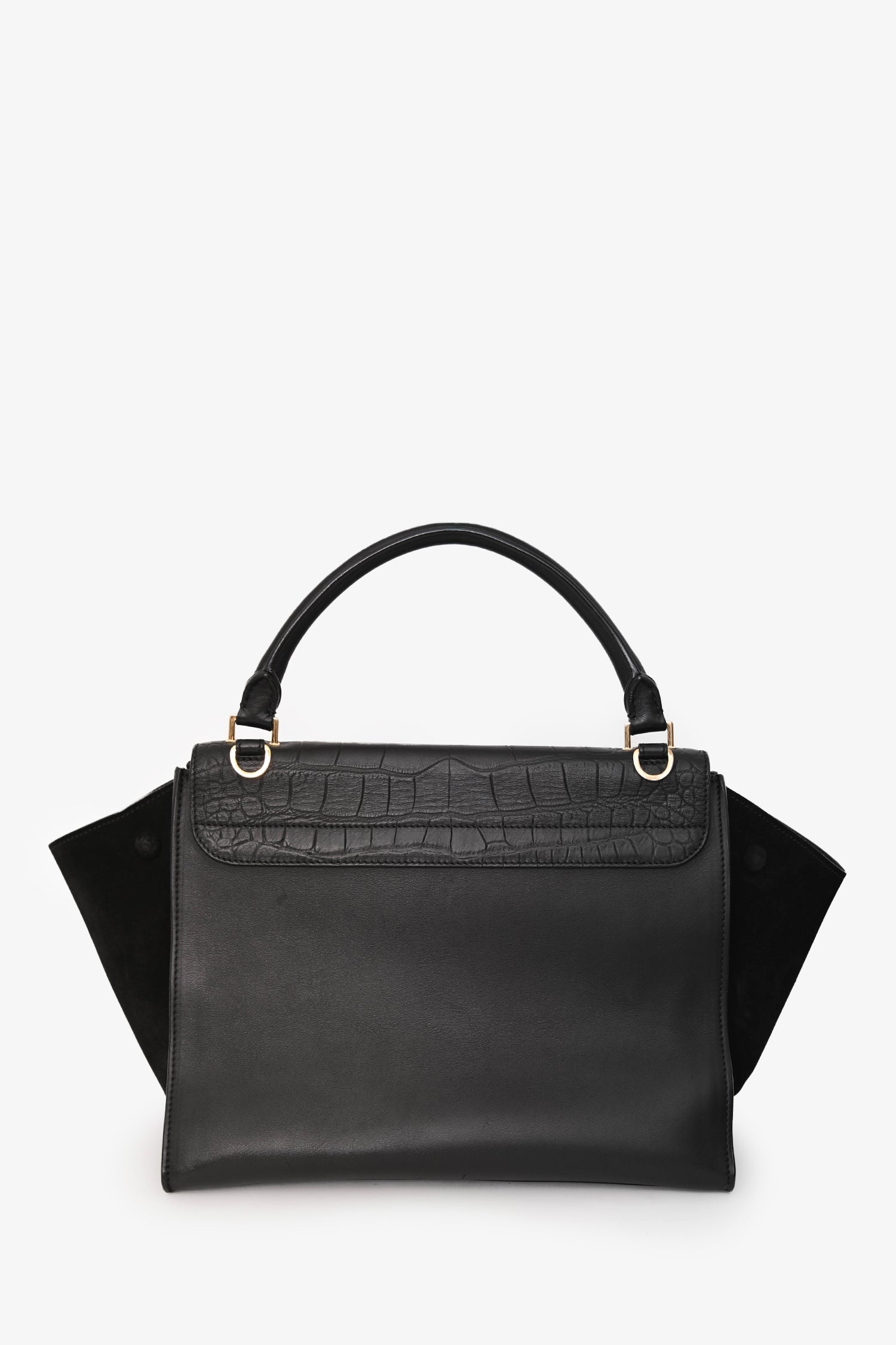 Celine Black Croc-Embossed Leather Medium Trapeze Shoulder Bag. Front fold-over flap with clasp closure. Single top handle. Detachable shoulder strap. Suede sides with snap closures. 1 interior zip pocket. Main compartment with zipper closure. 1 interior slip pocket. Gold-tone hardware. Tonal stitching.