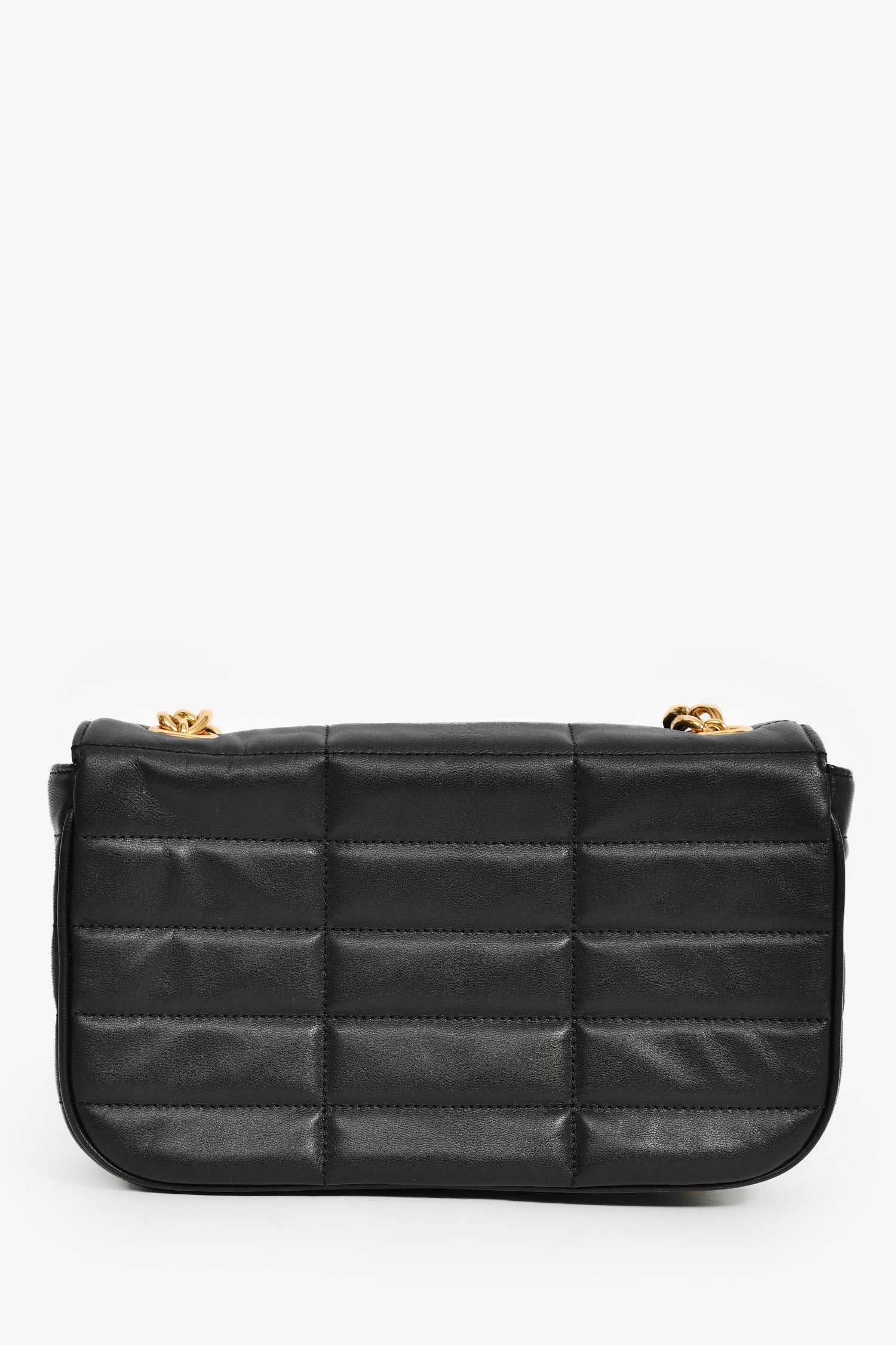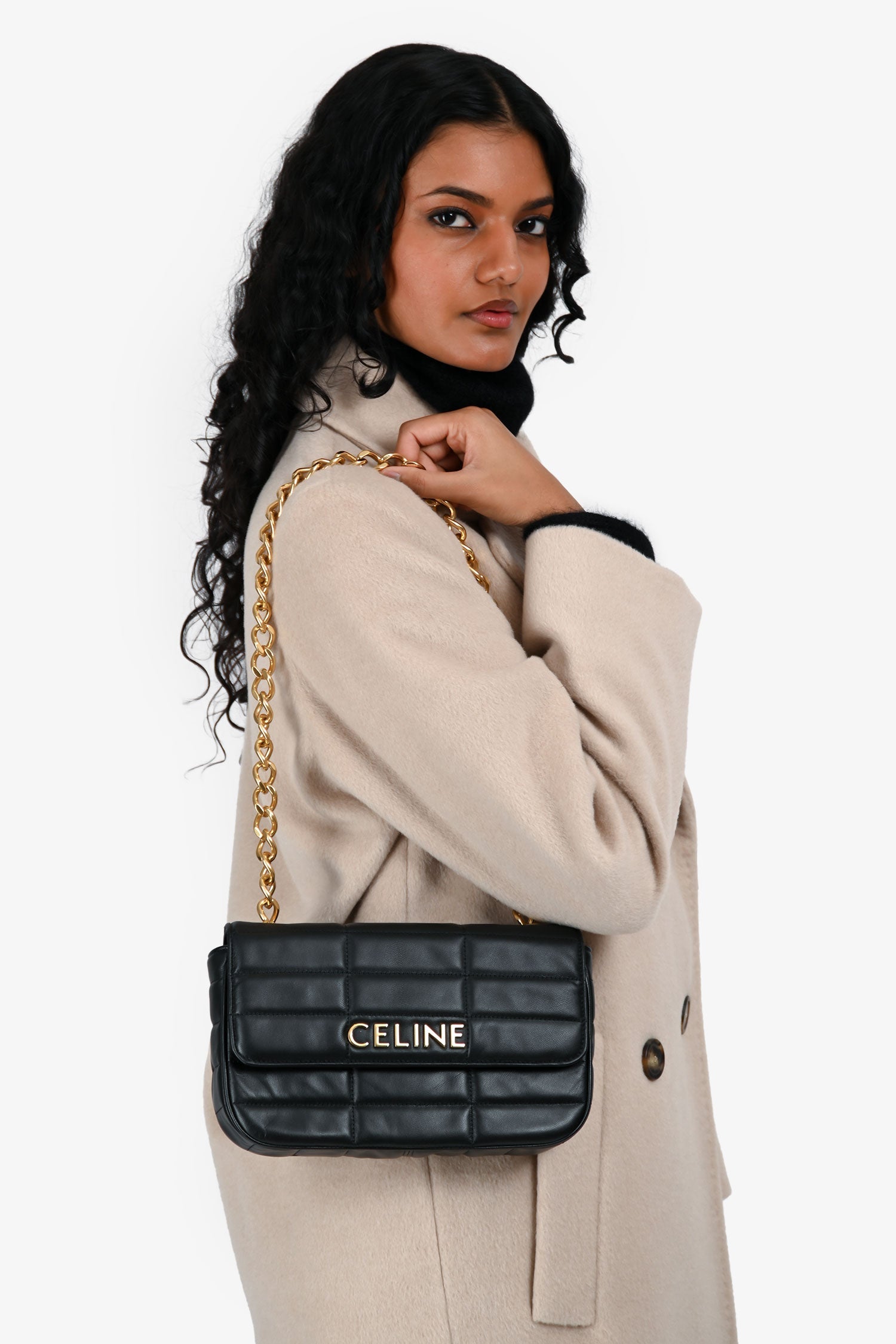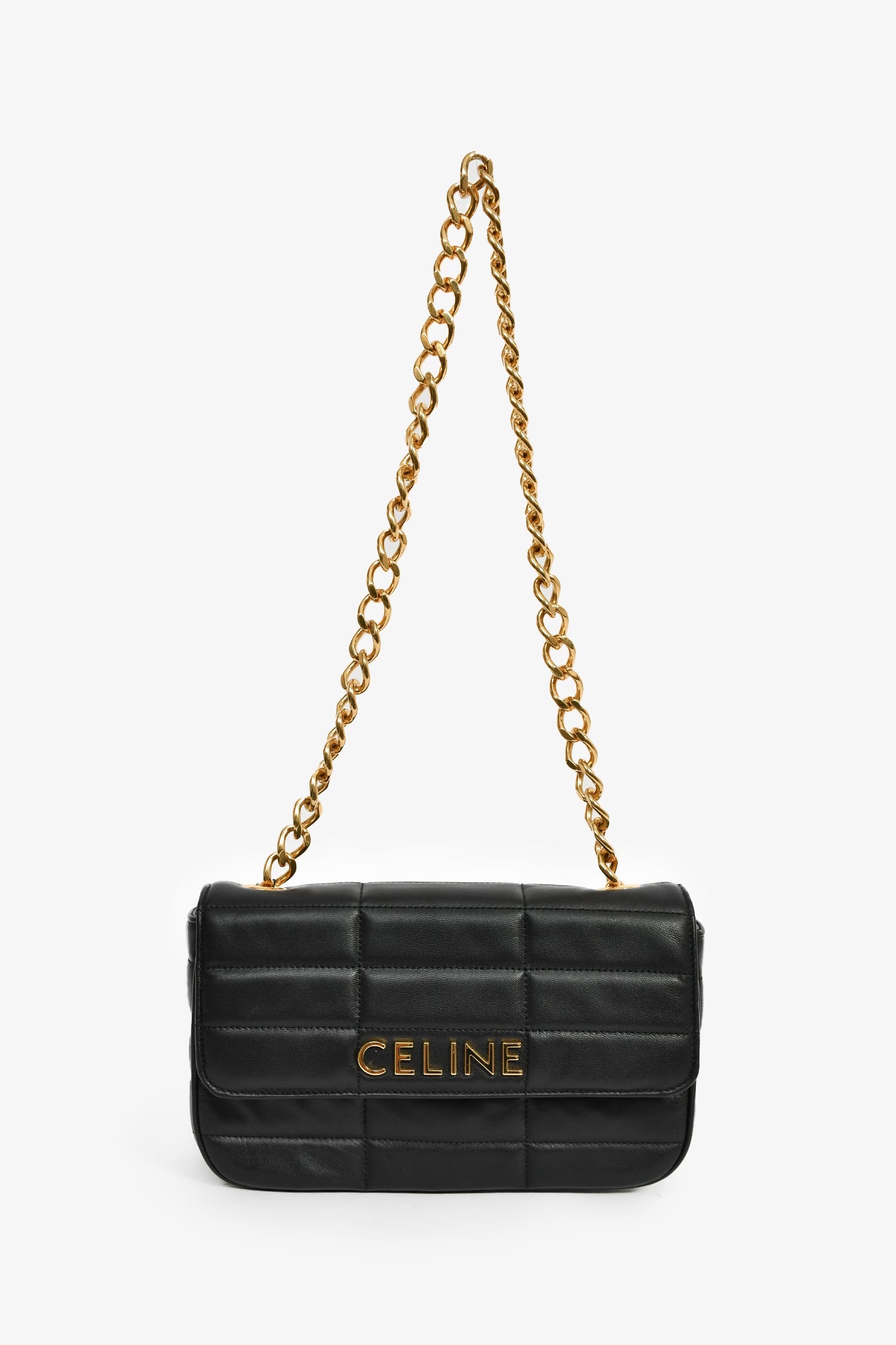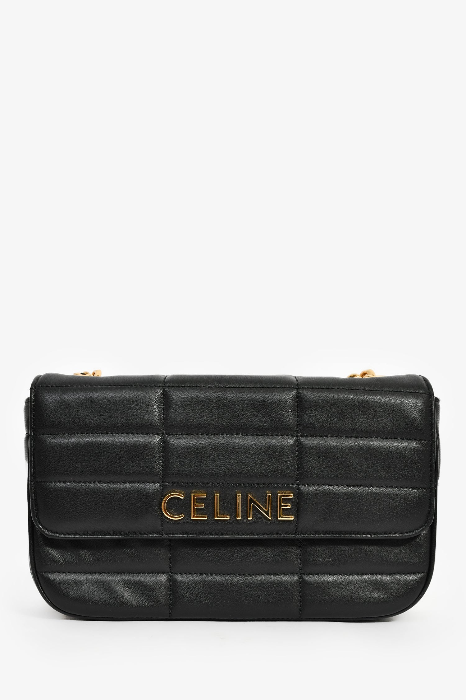 Celine 2022 Black Leather Metalasse Logo Shoulder Bag. Fold-over flap with a snap closure. Chain-link shoulders strap. Lined interior with a card pocket. Gold-tone hardware. Tonal stitching.
