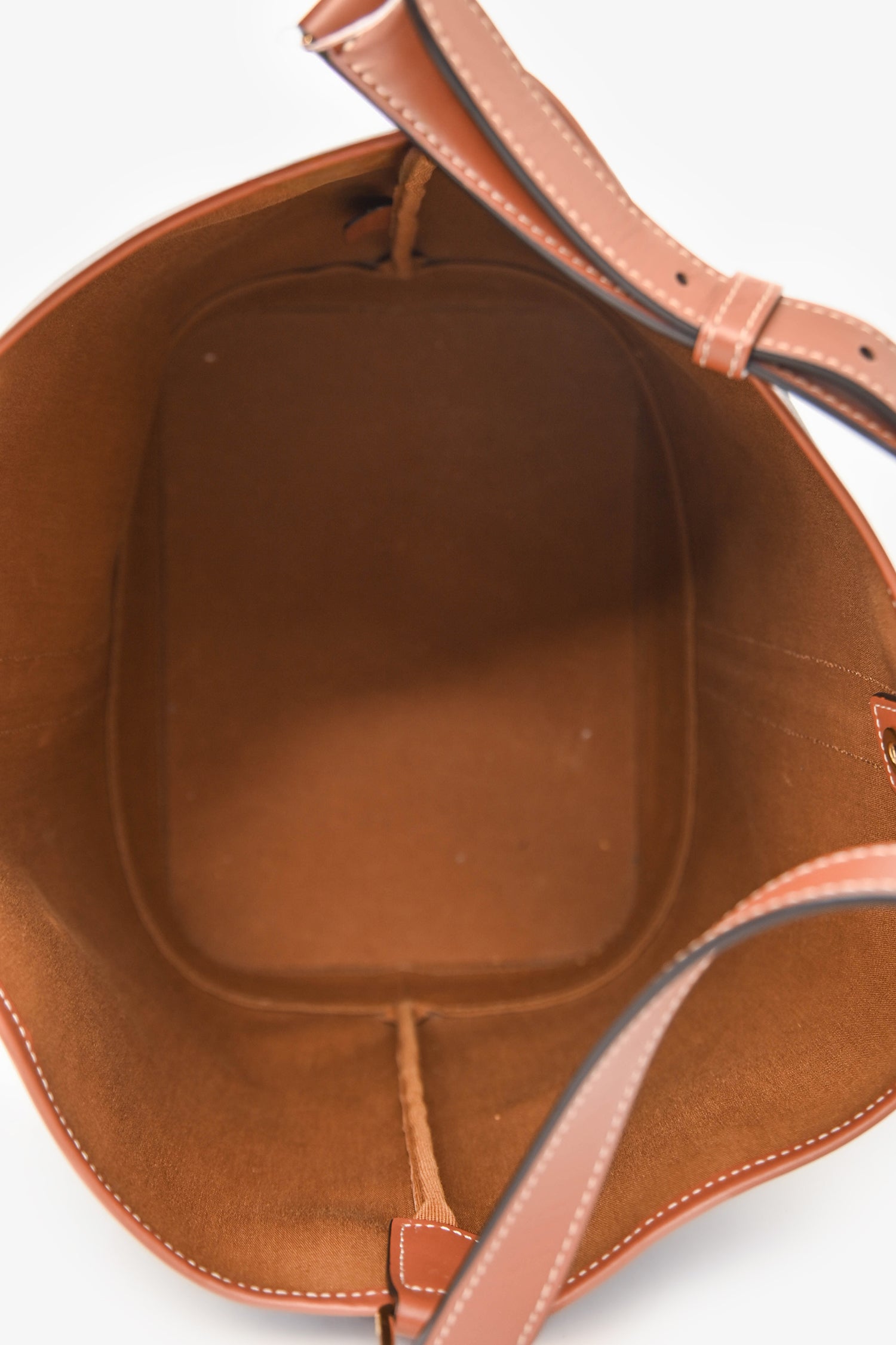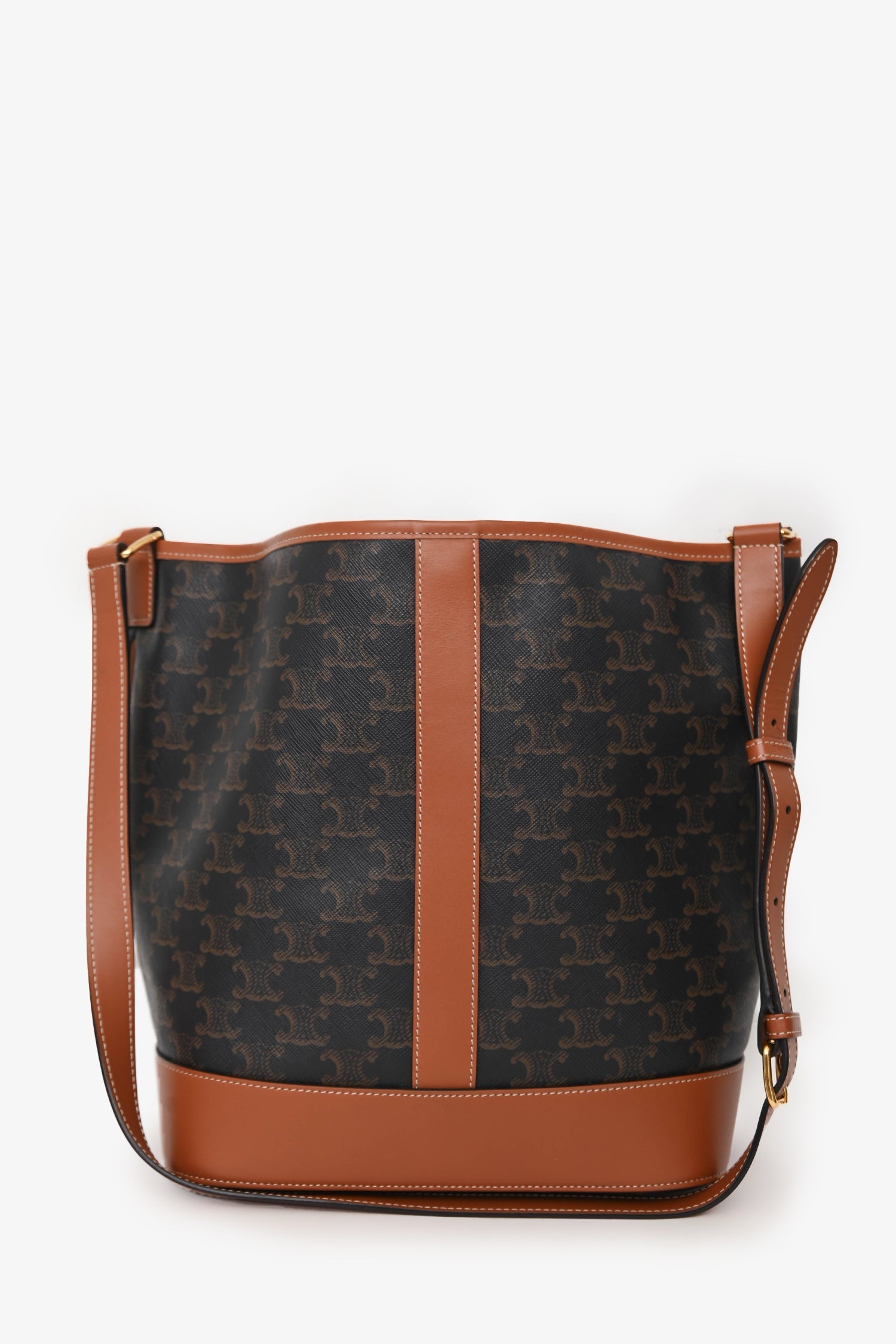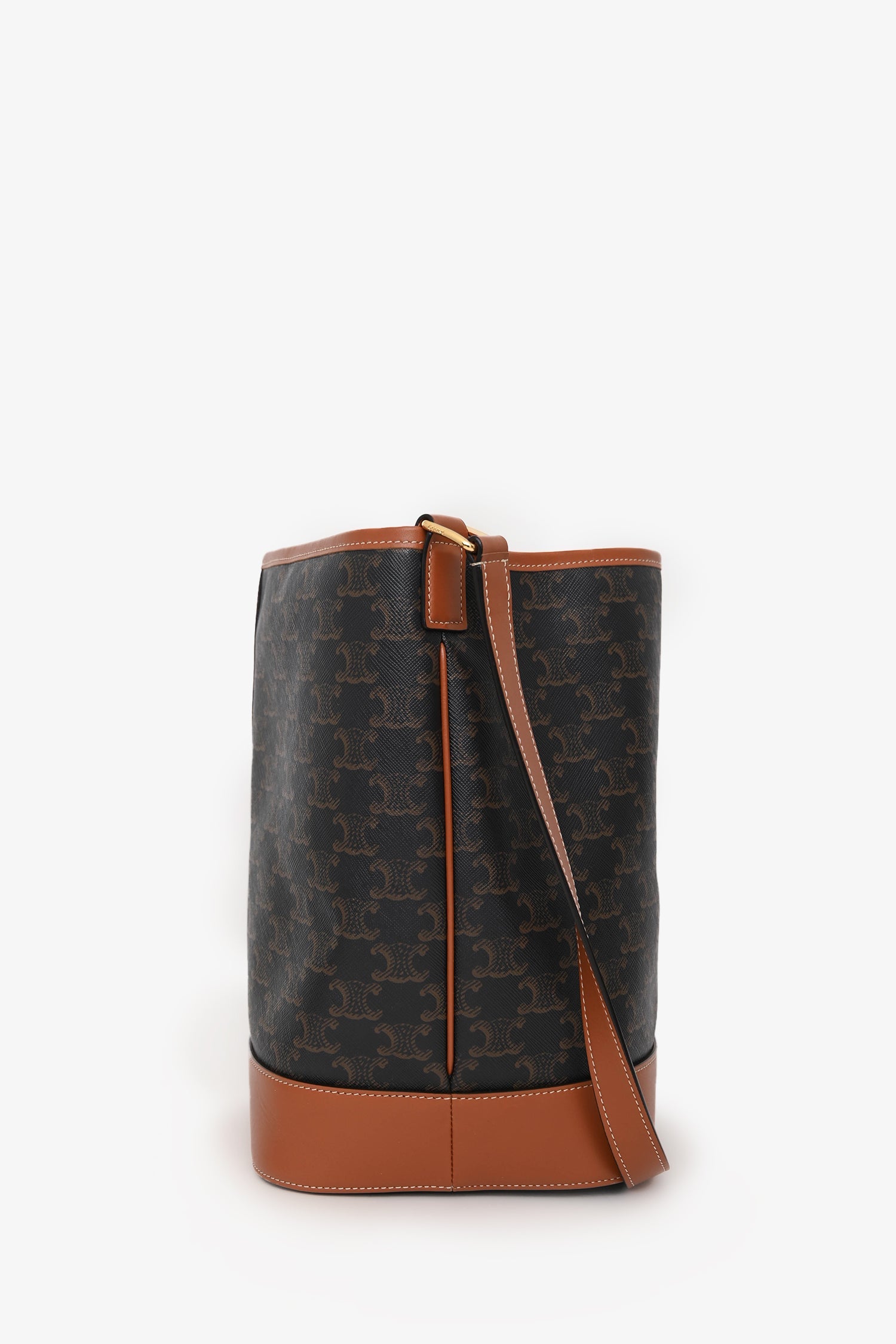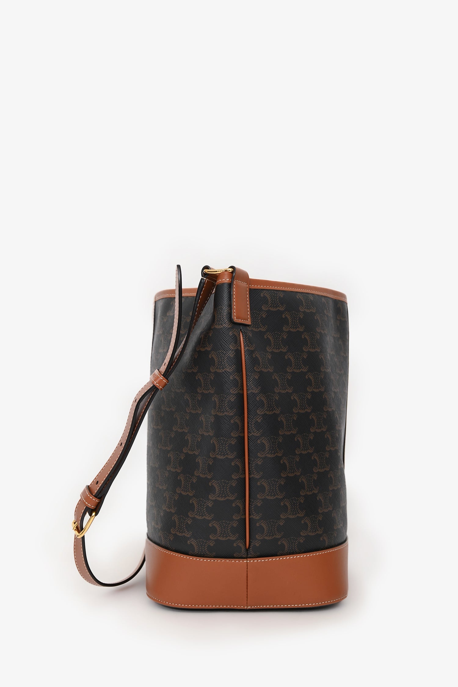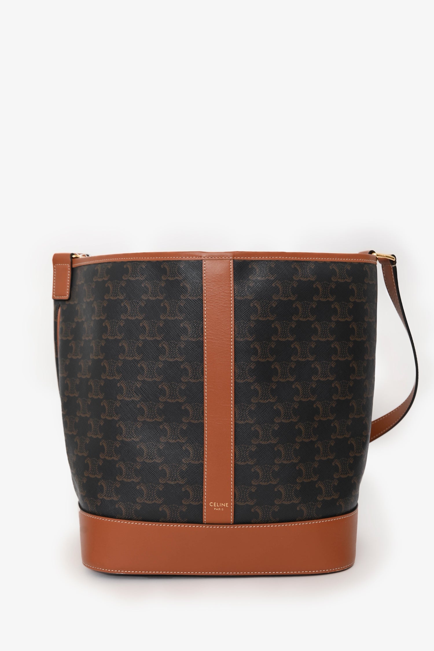 Celine Brown Triomphe Canvas and Leather Medium Bucket Bag. Open top with single snap closure. Adjustable shoulder strap. 1 main compartment. Gold-tone hardware. Contrast stitching.