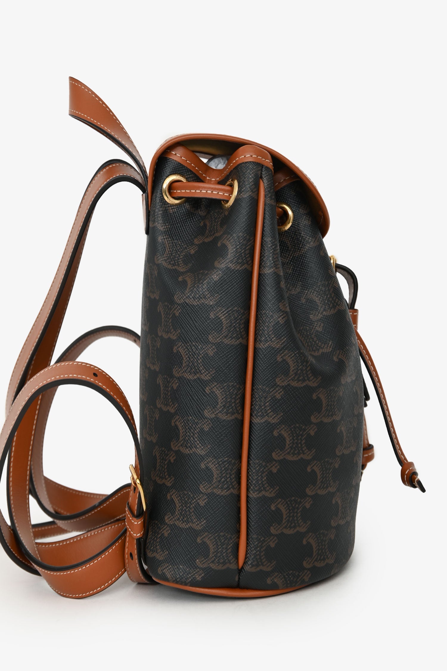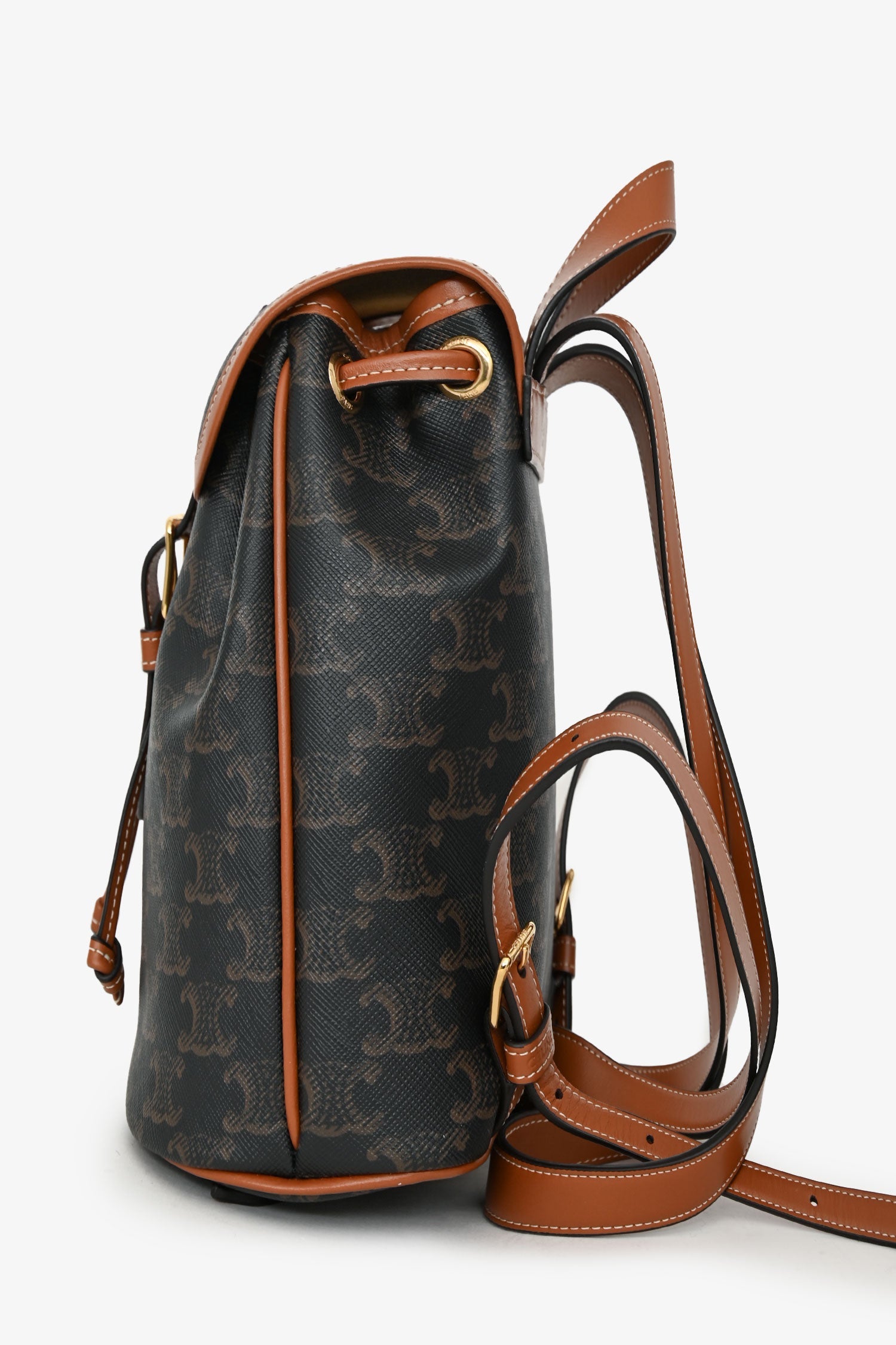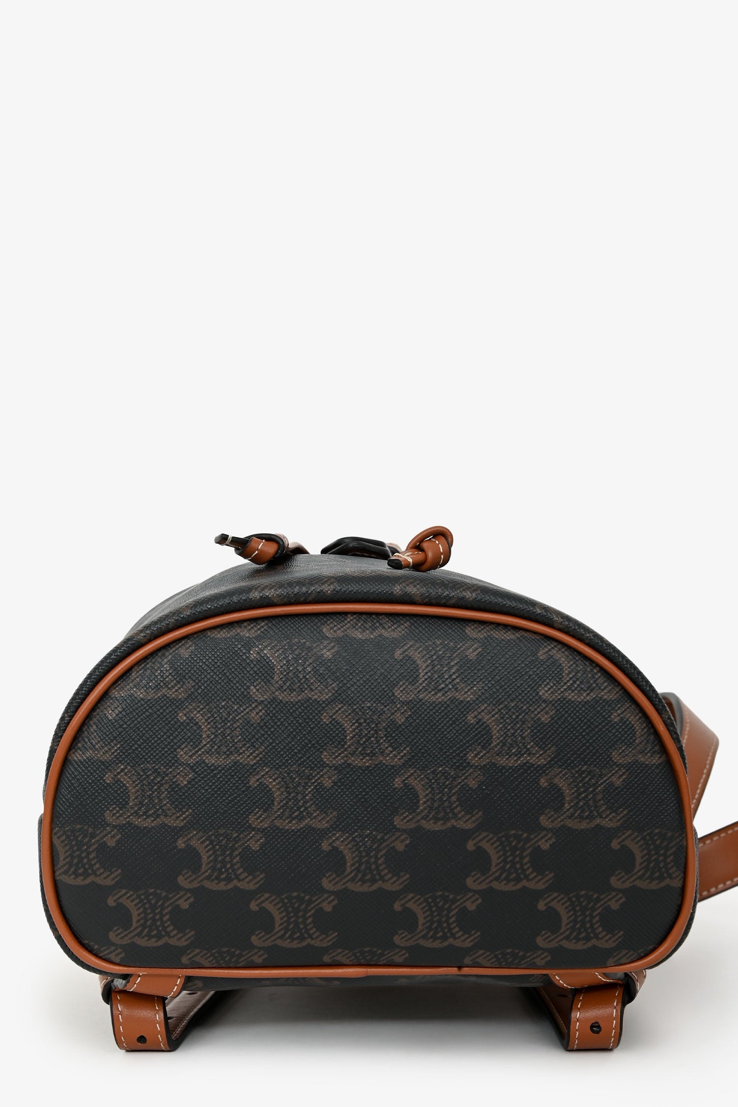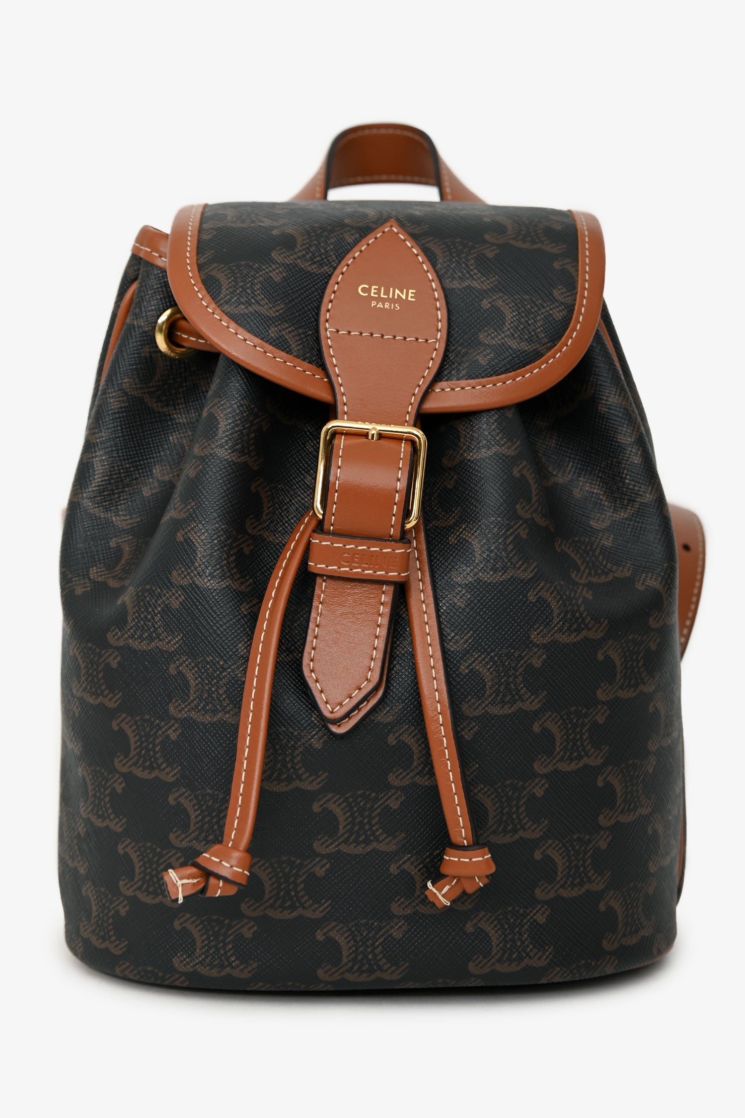 Celine Brown Leather/Canvas Triomphe Mini Backpack. Flap closure with magnetic snap closure and buckle detail. Top adjustable drawstring closure. Adjustable leather shoulder straps; top handle. Single main compartment. Gold-tone hardware. Contrast stitching.
