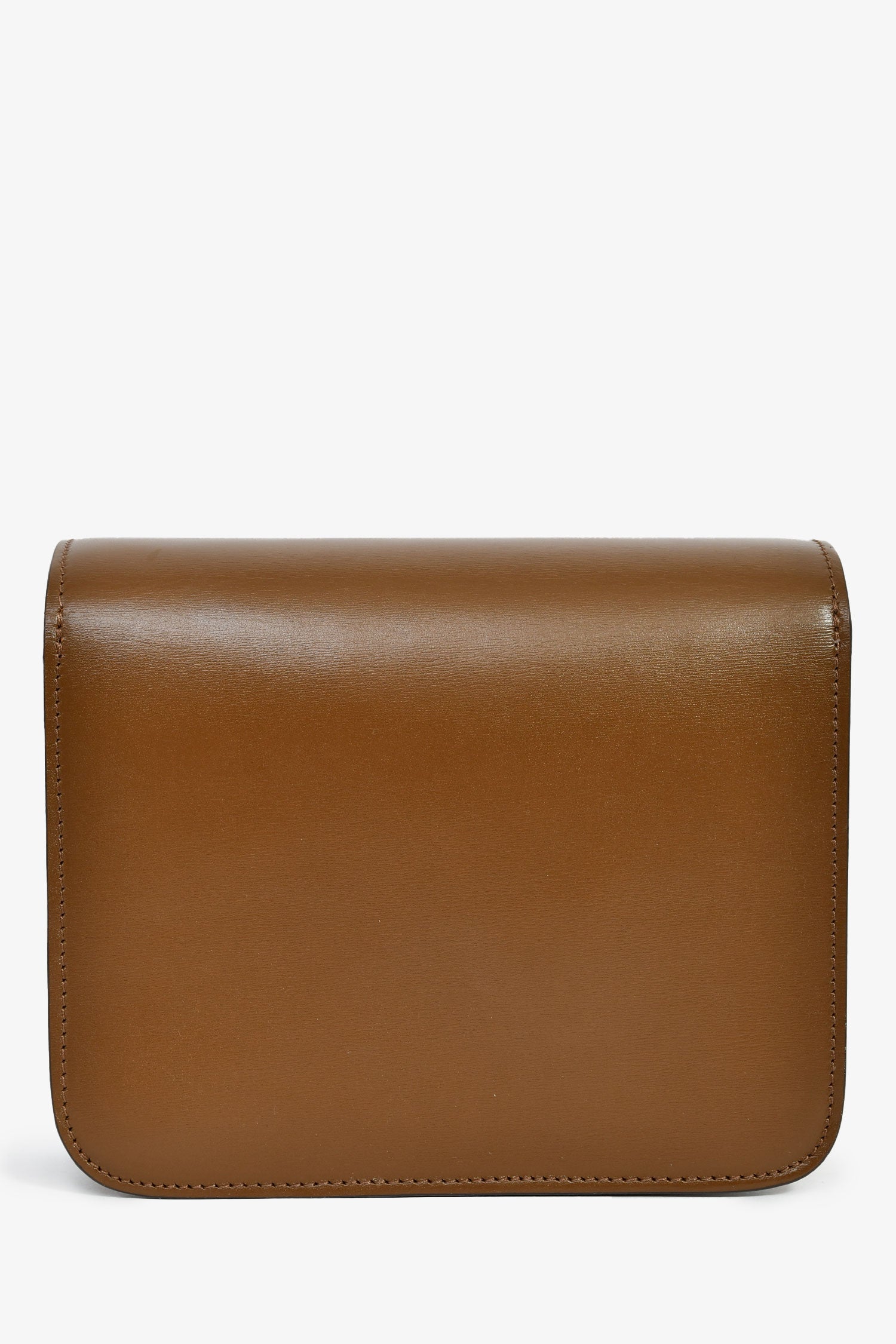 Celine Brown Leather Small Box Bag. Front fold-over flap with a flip-lock closure. Adjustable crossbody strap. 2 interior compartments. Gold-tone hardware. Tonal stitching.