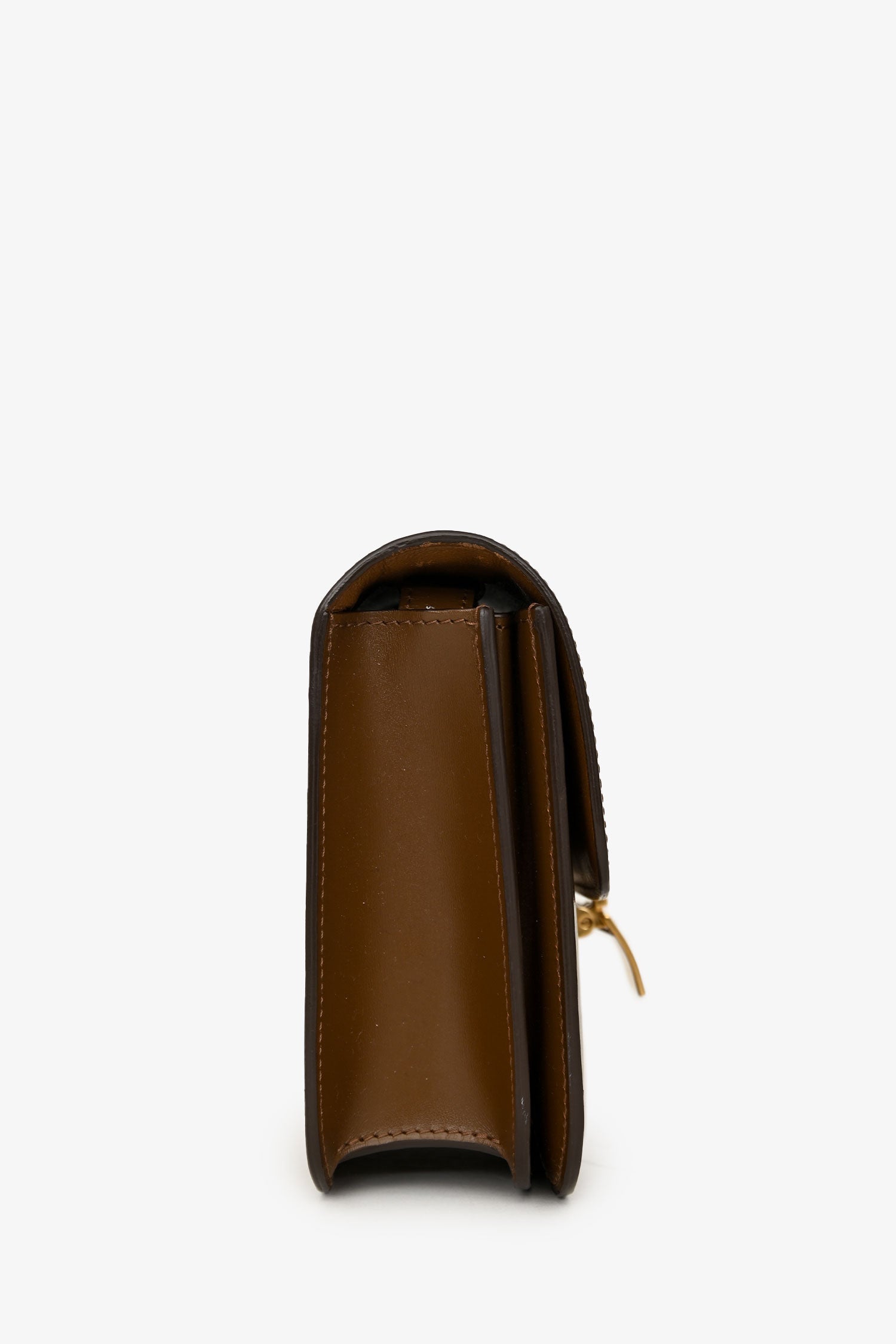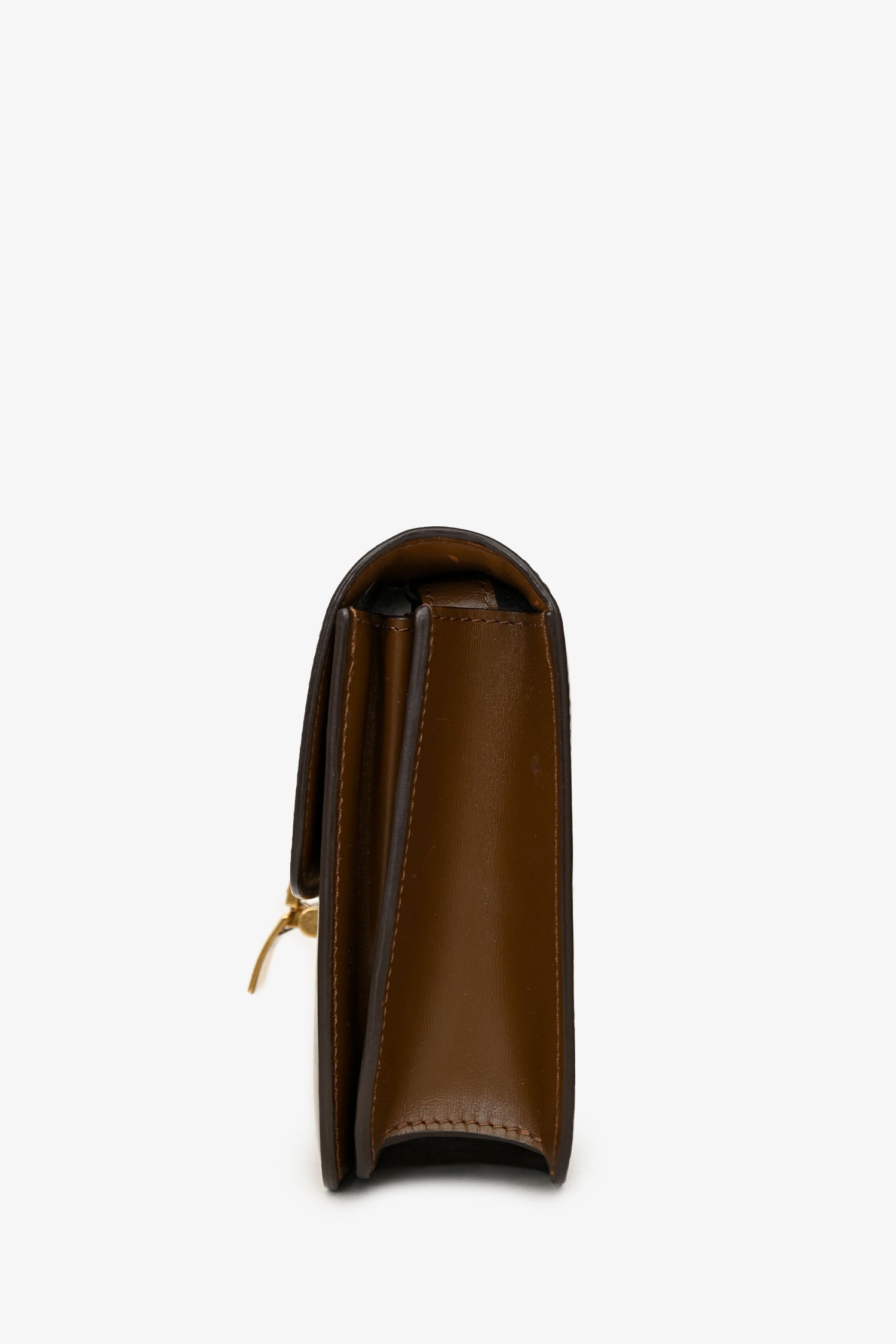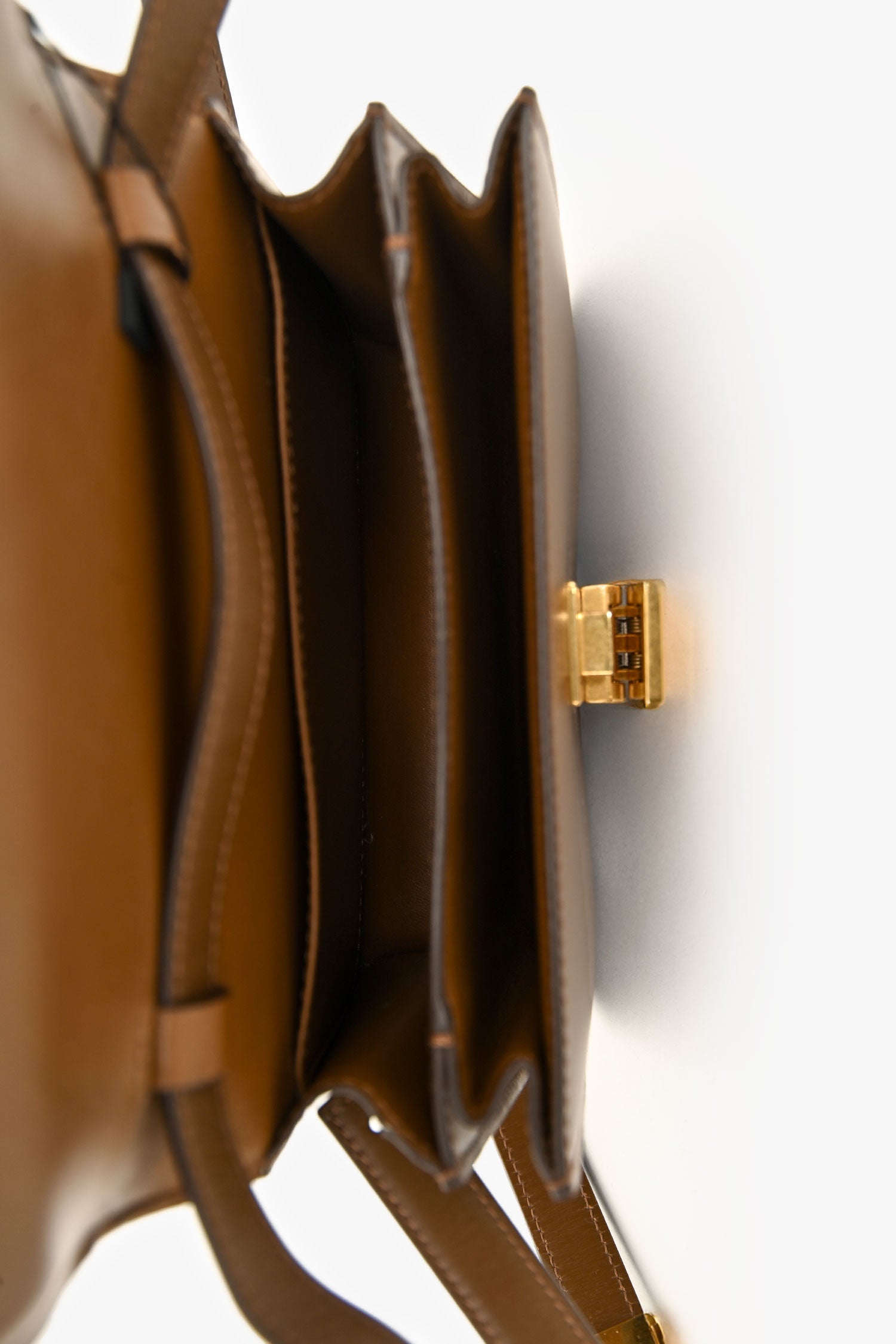 Celine Brown Leather Small Box Crossbody Bag. Front fold-over flap with push-lock closure. Adjustable crossbody strap. Leather-lined interior. 2 interior compartments; separated by a divider. Single interior wall slip pocket. Gold-tone hardware. Tonal stitching.