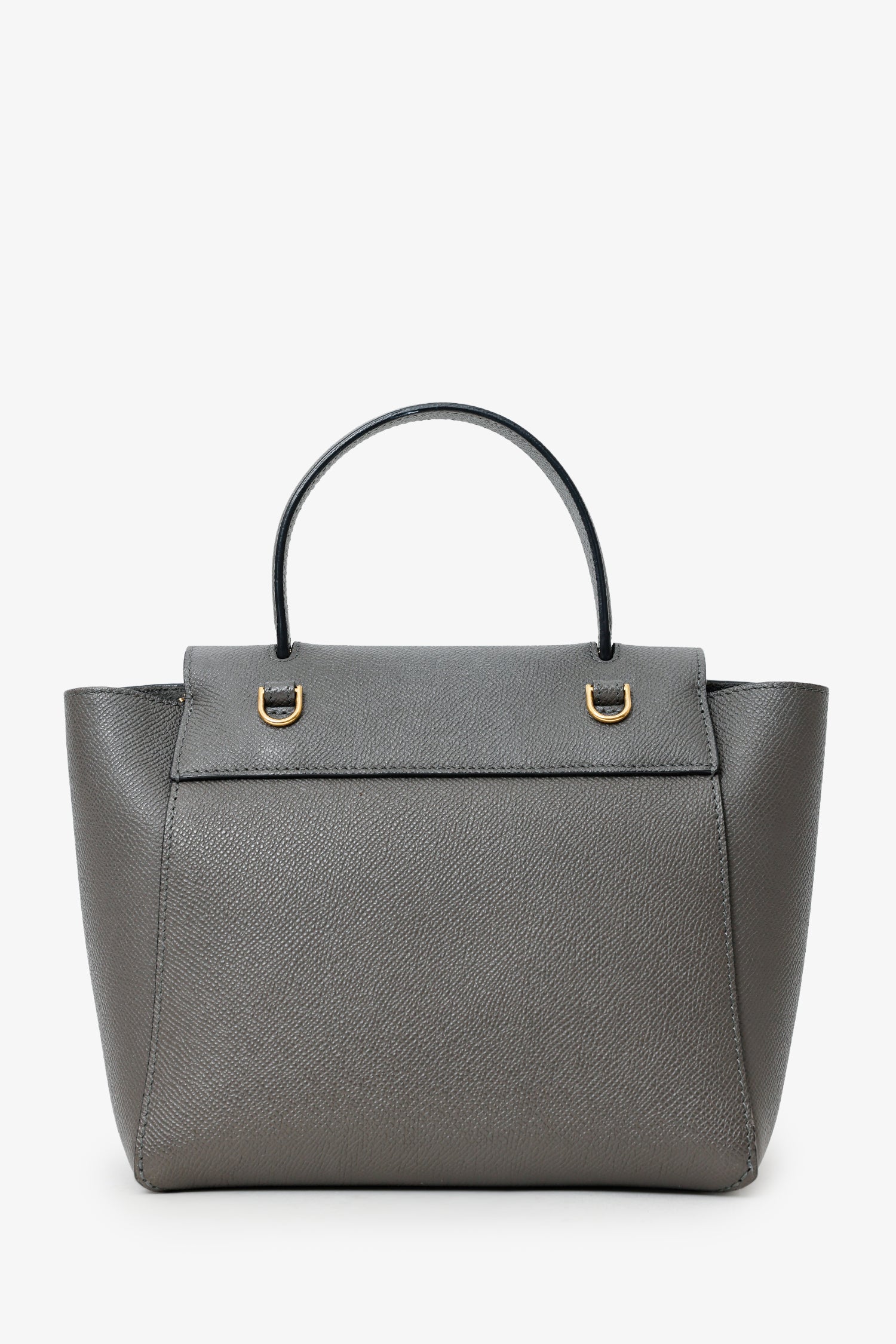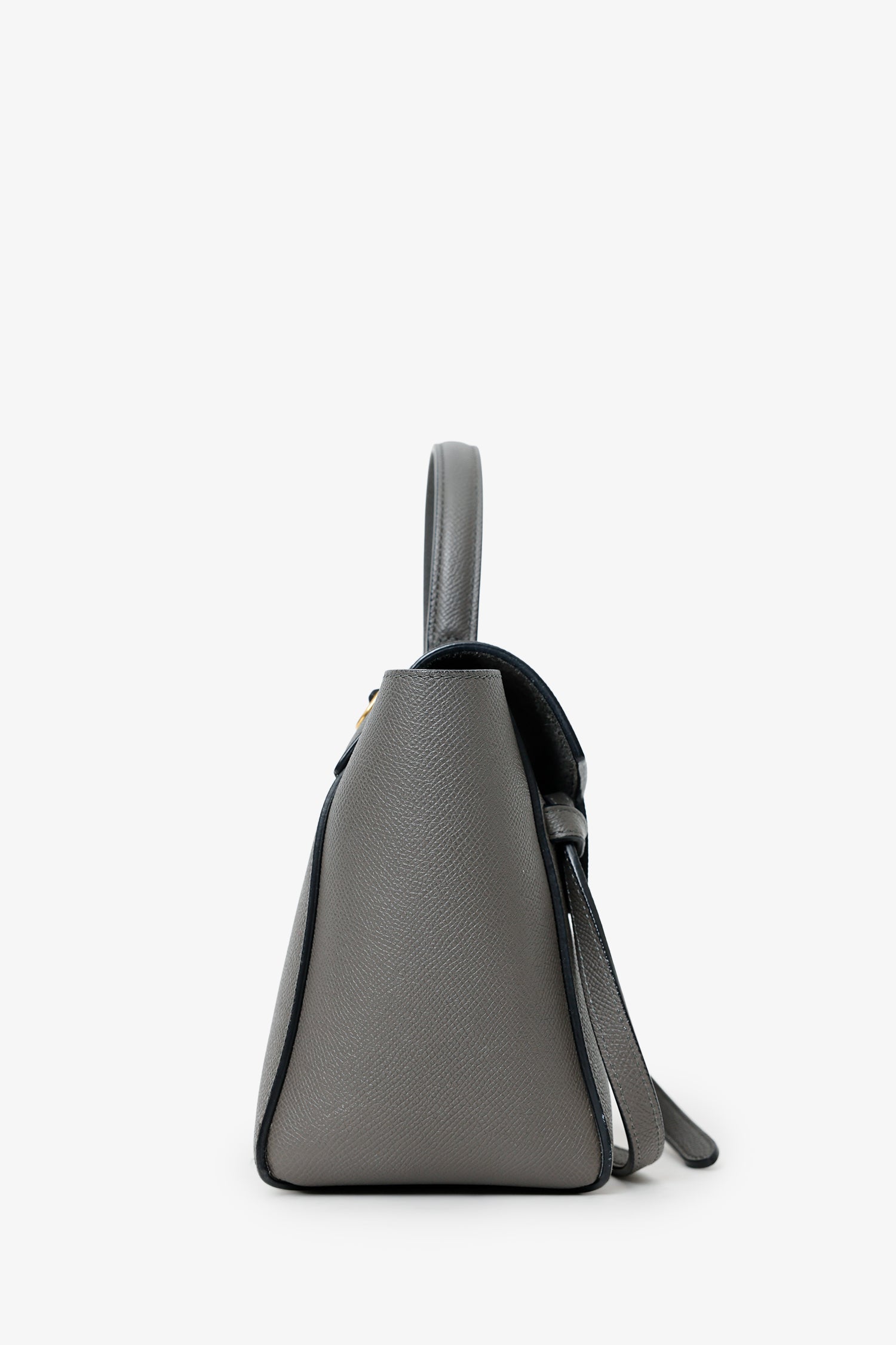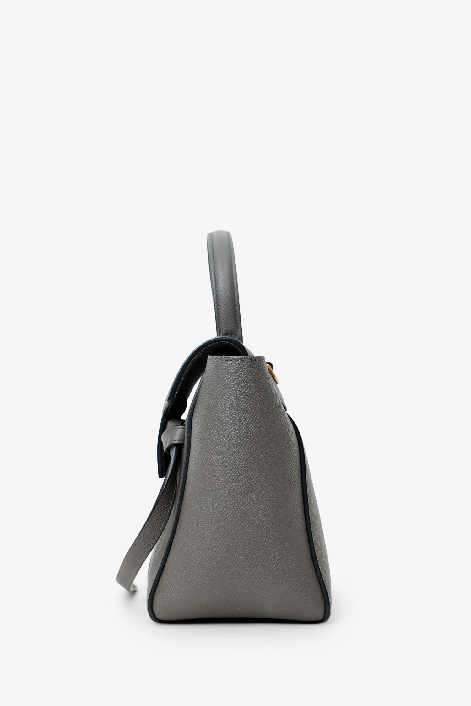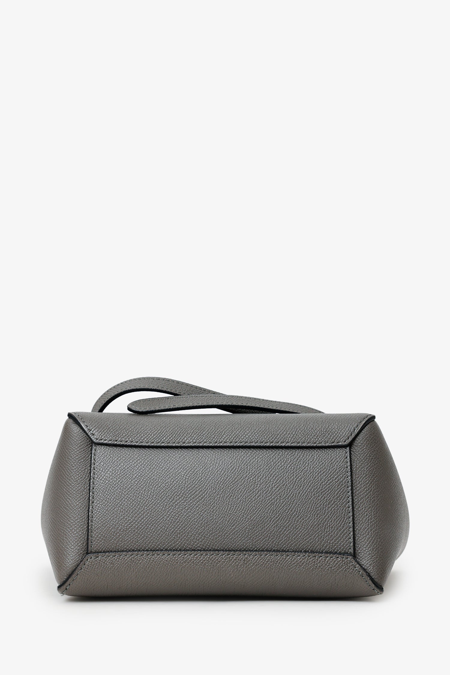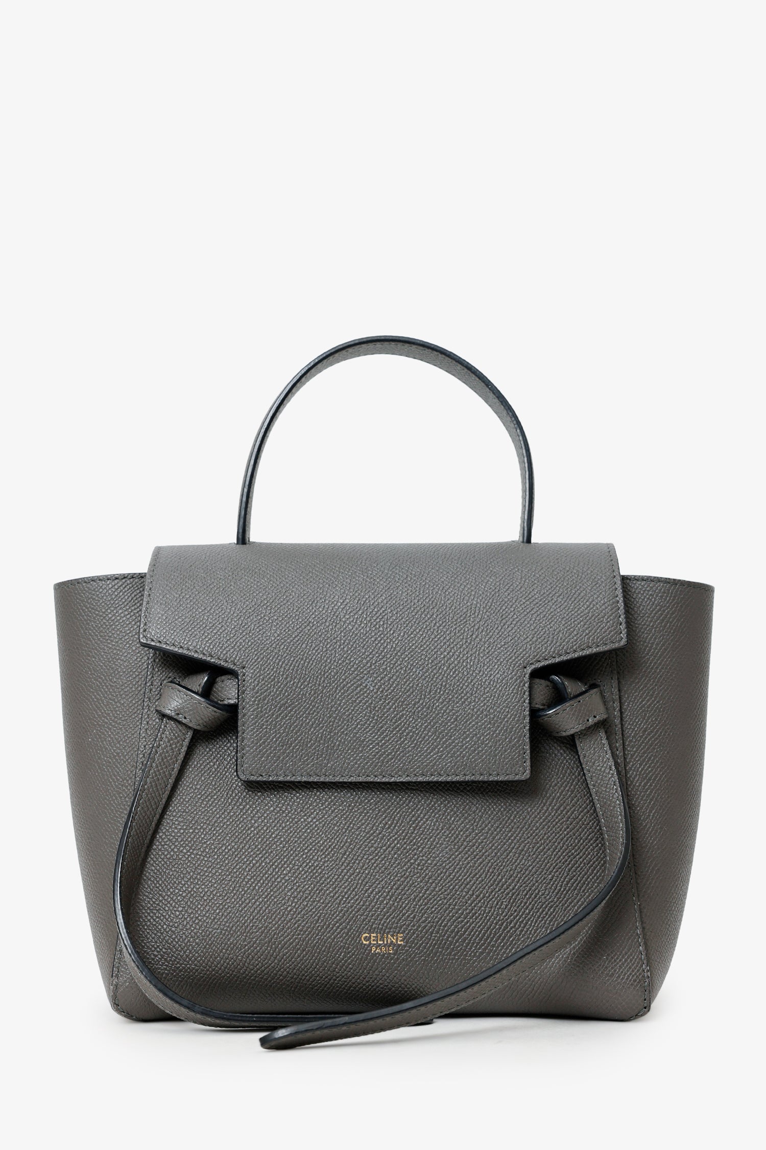 Celine Grey Grained Leather Nano Belt Bag With Strap. Front fold-over flap with snap-button-up closure. Top handle. Removable crossbody strap with adjustable pull-through buckle closure. Open lined interior. Gold-tone hardware. Tonal stitching.