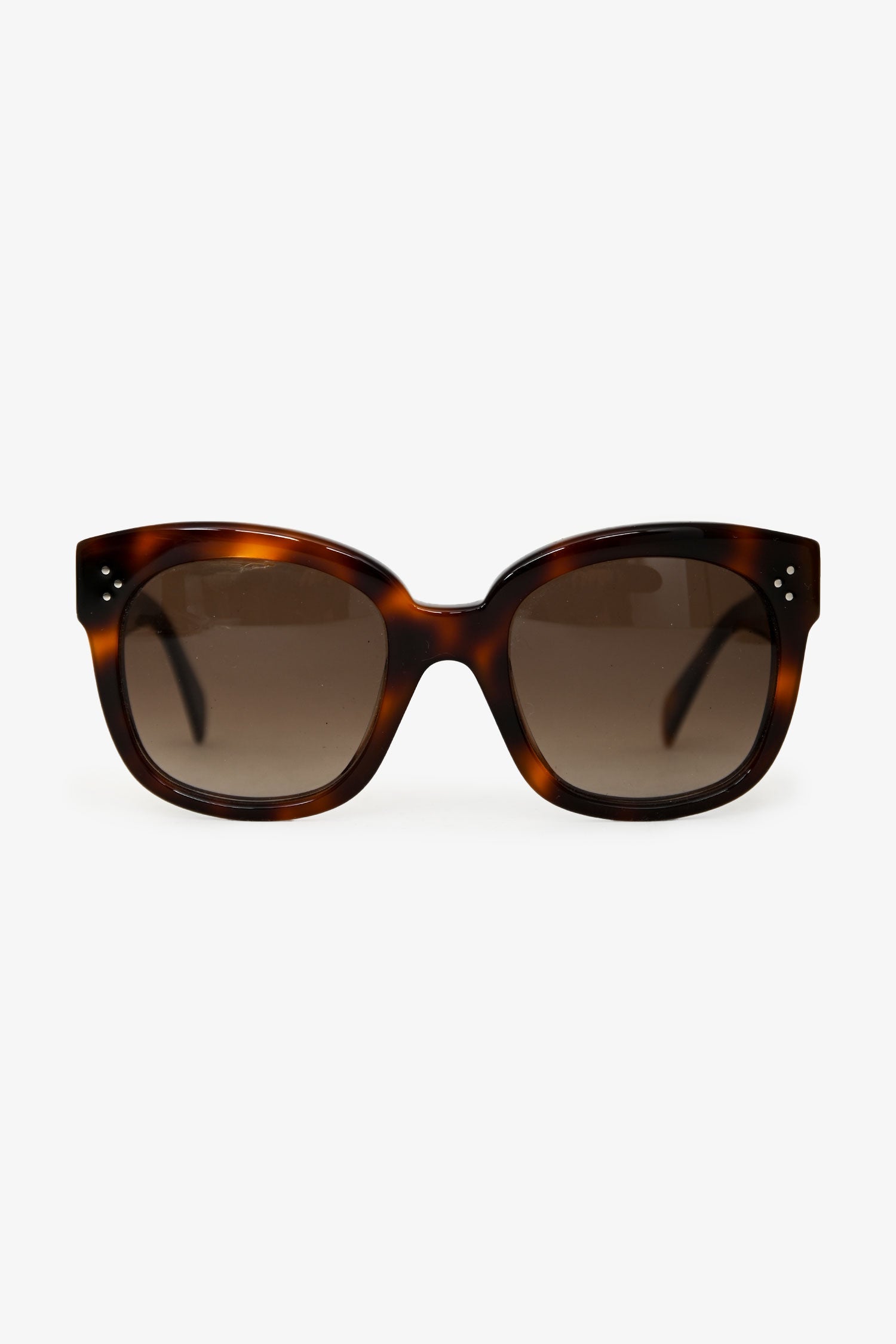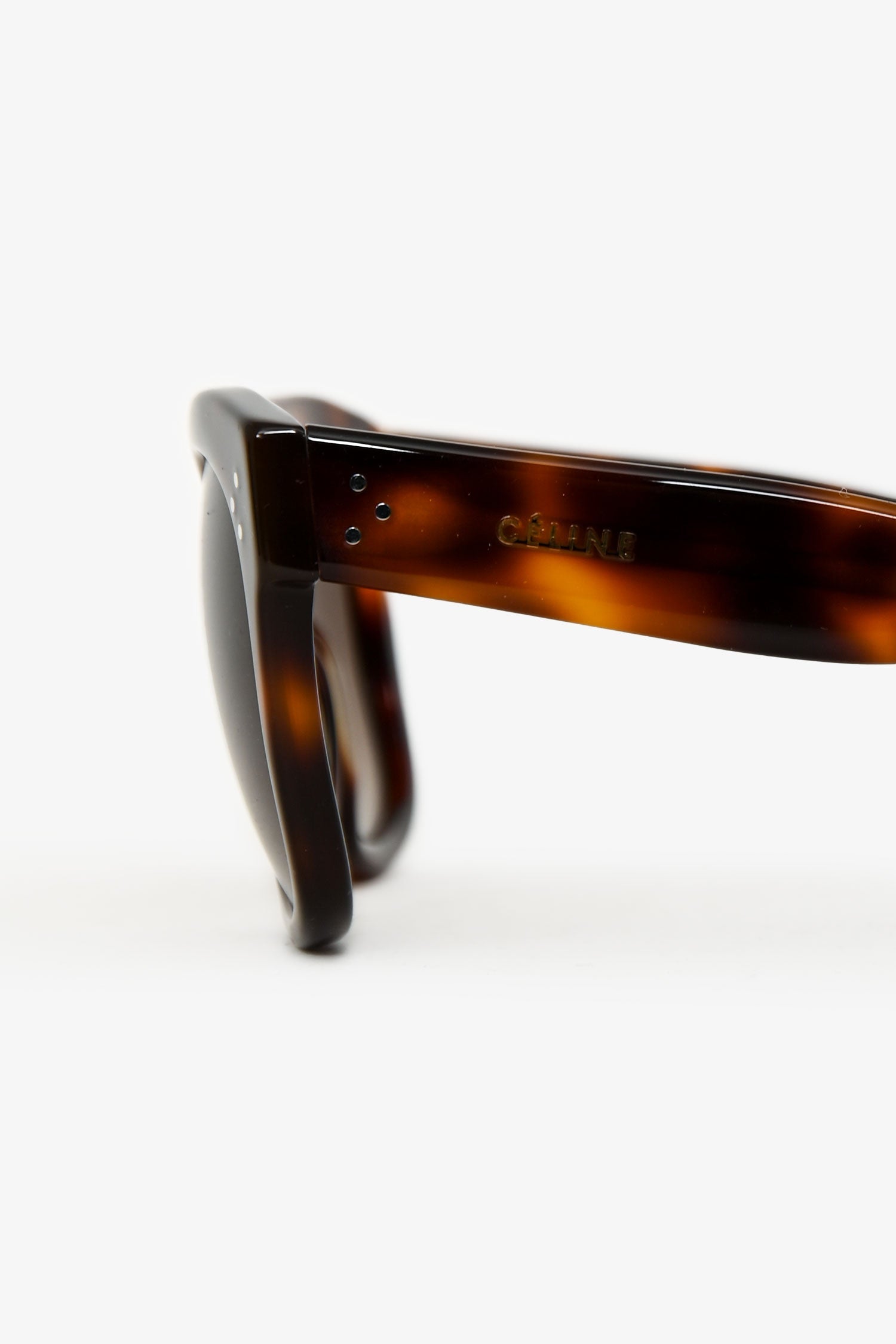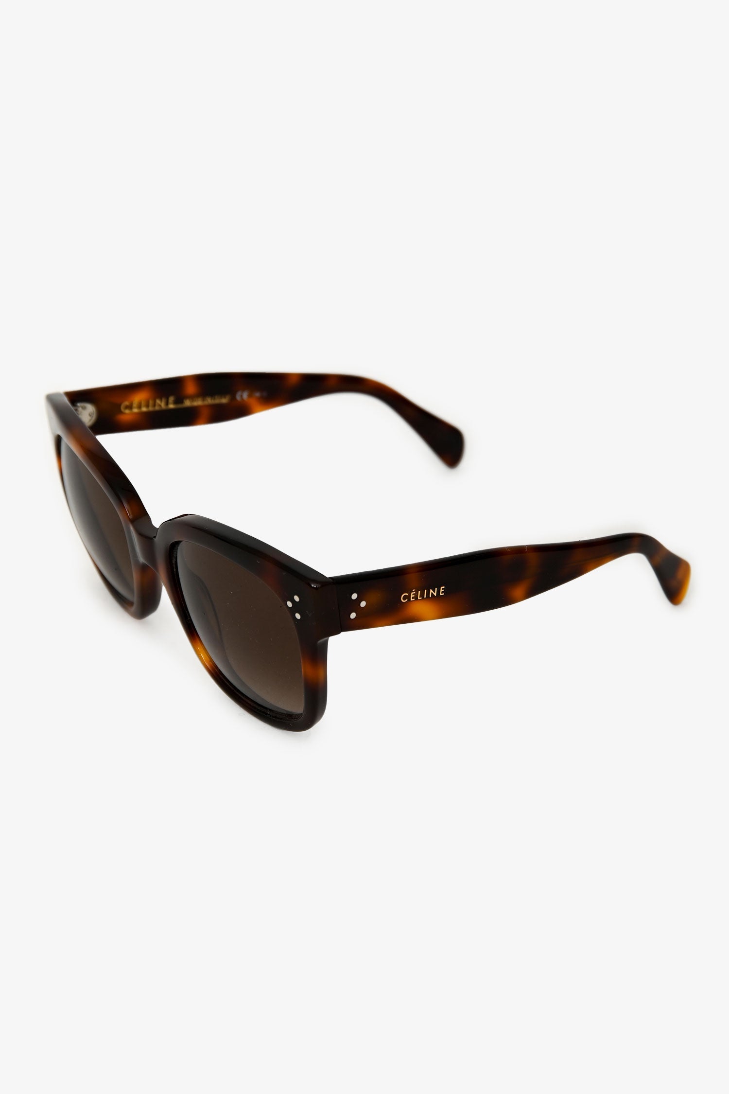 Celine Tortoiseshell Oversized Sunglasses. Built-in nosepads. Gold-tone hardware. Tonal stitching.