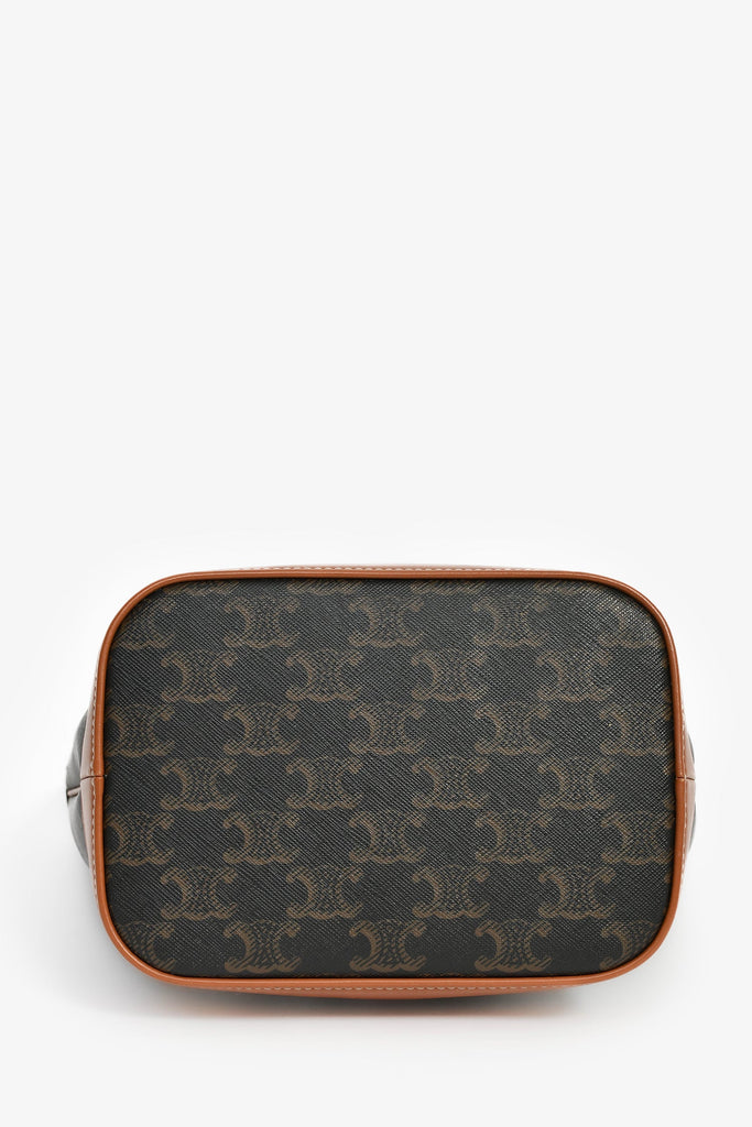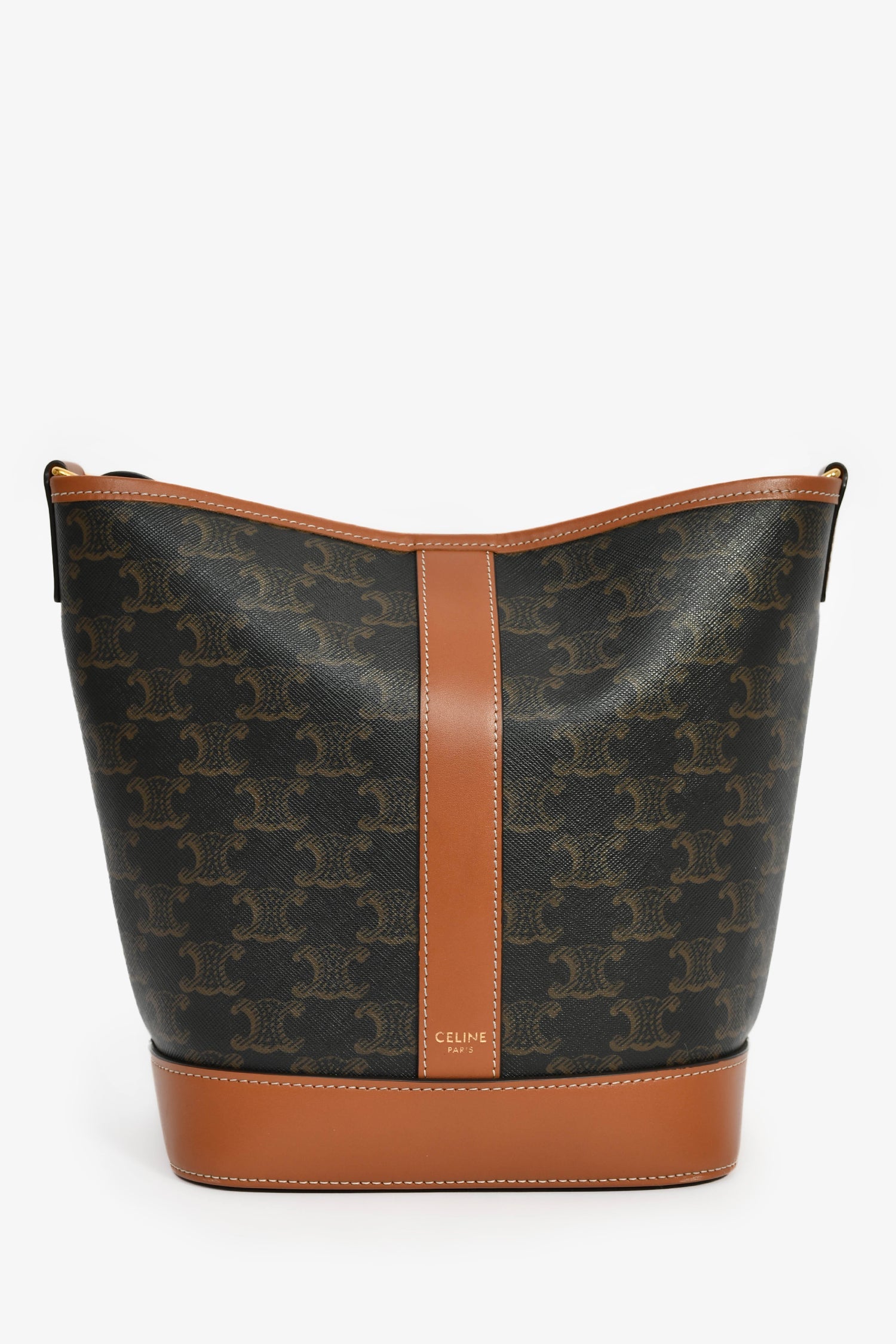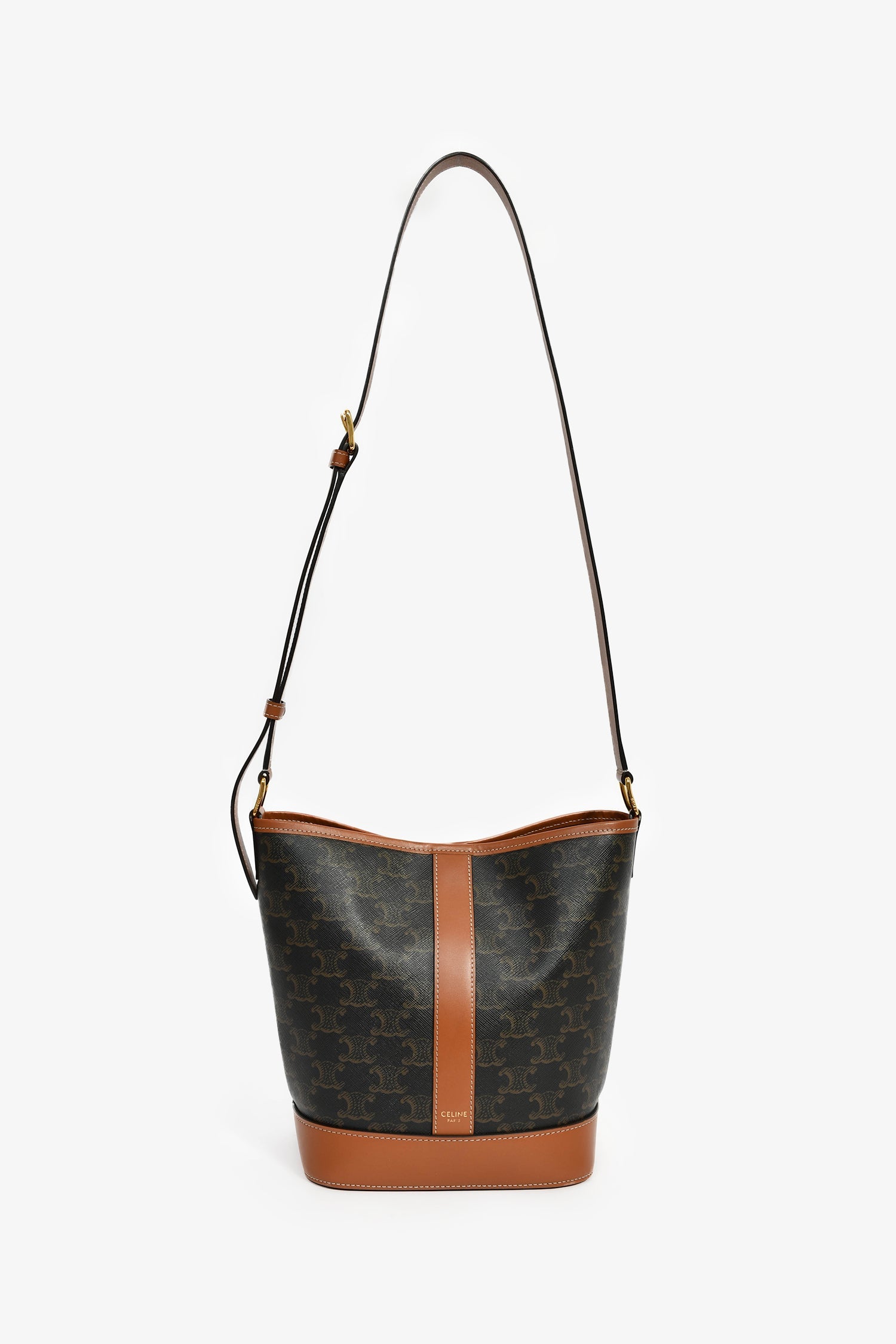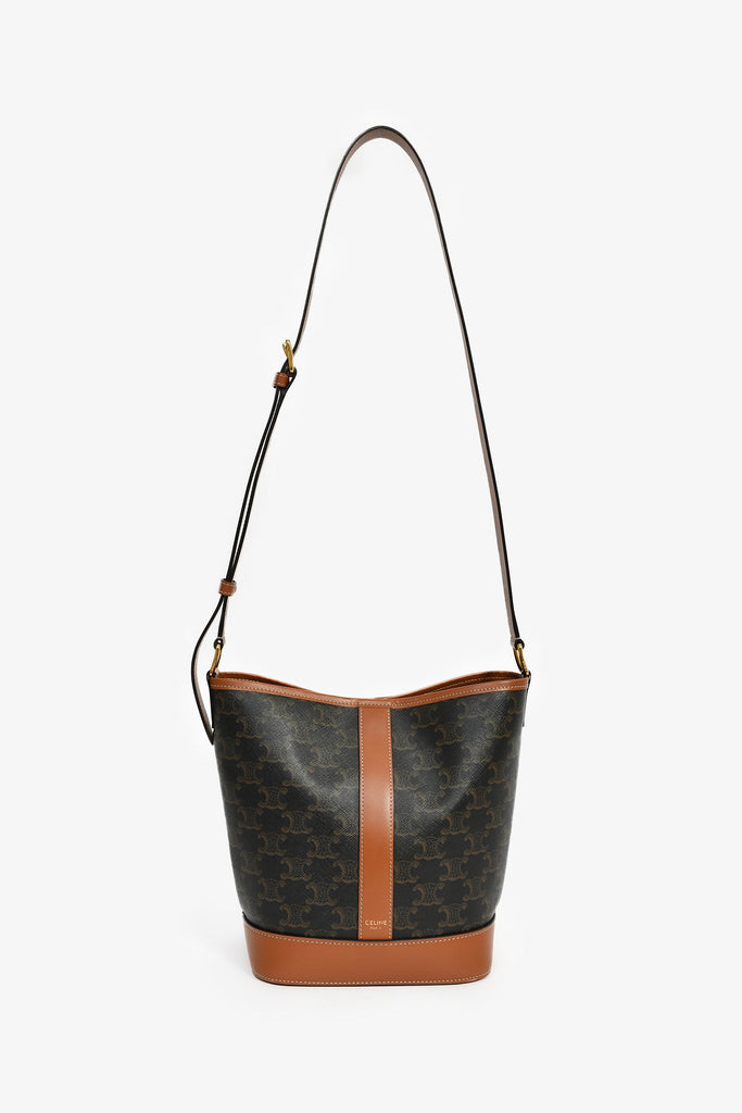 Celine Triomphe Canvas Small Crossbody Bucket Bag. Top interior snap-button closure. Adjustable strap. Lined interior. Open interior. Gold-tone hardware. Tonal stitching.
