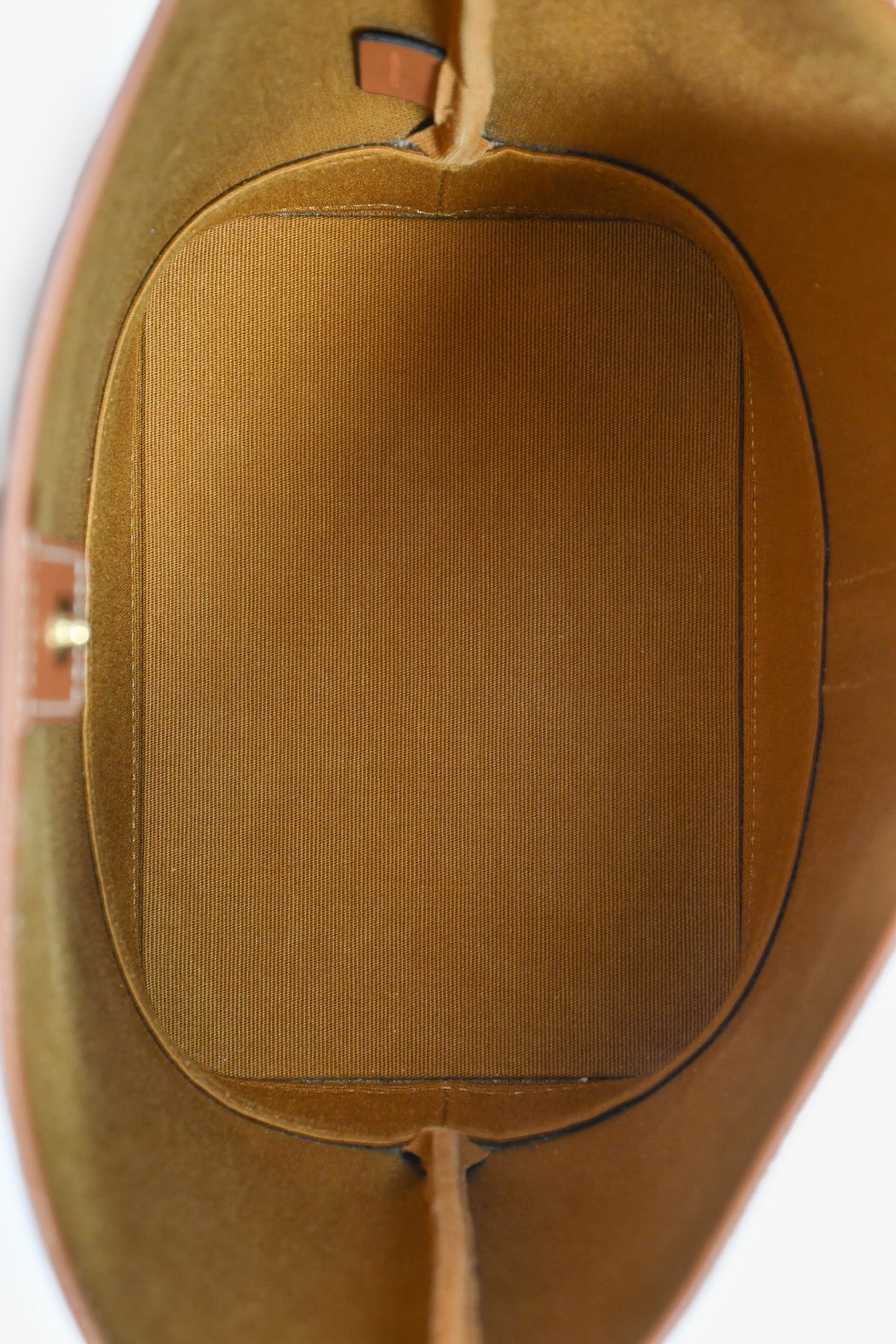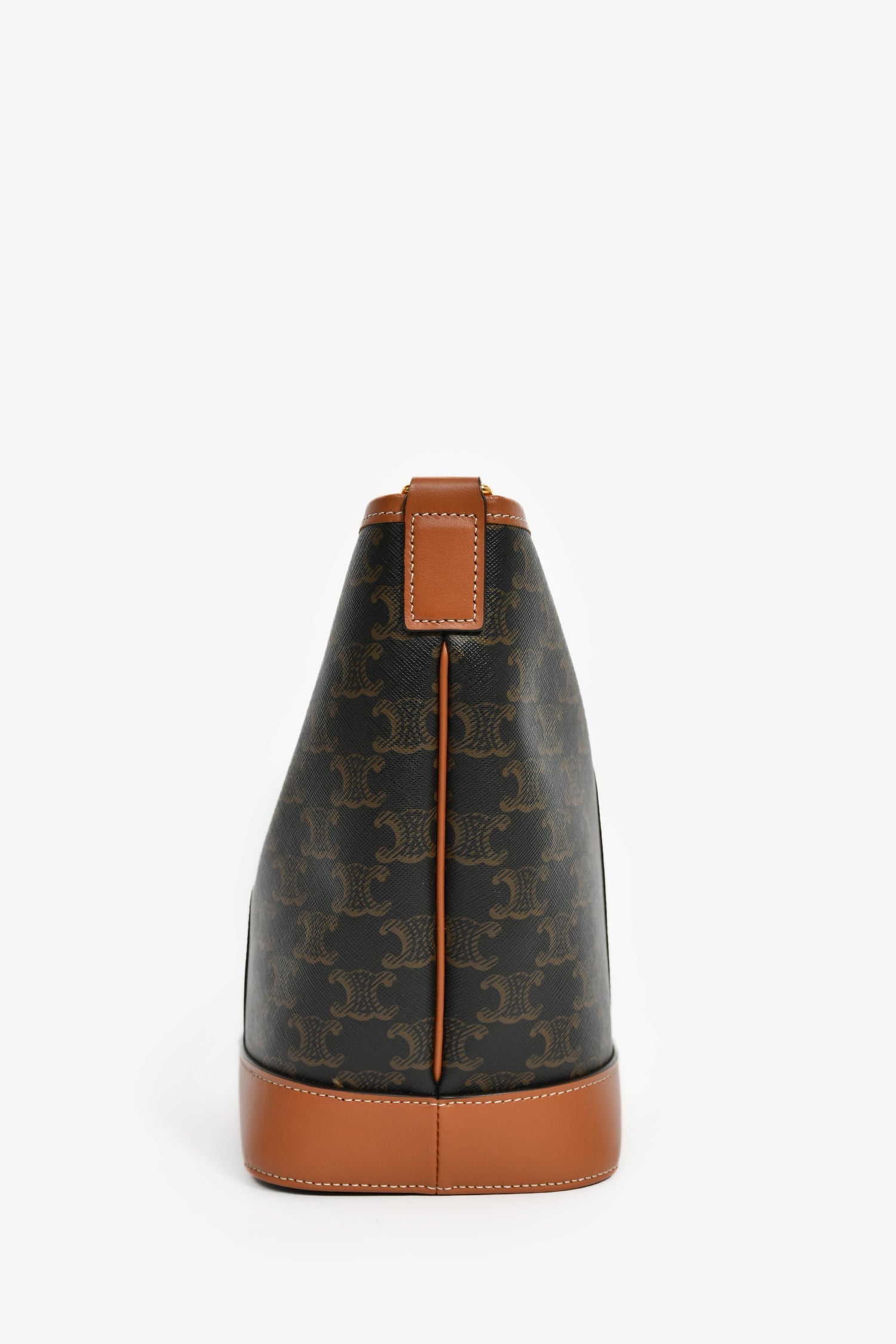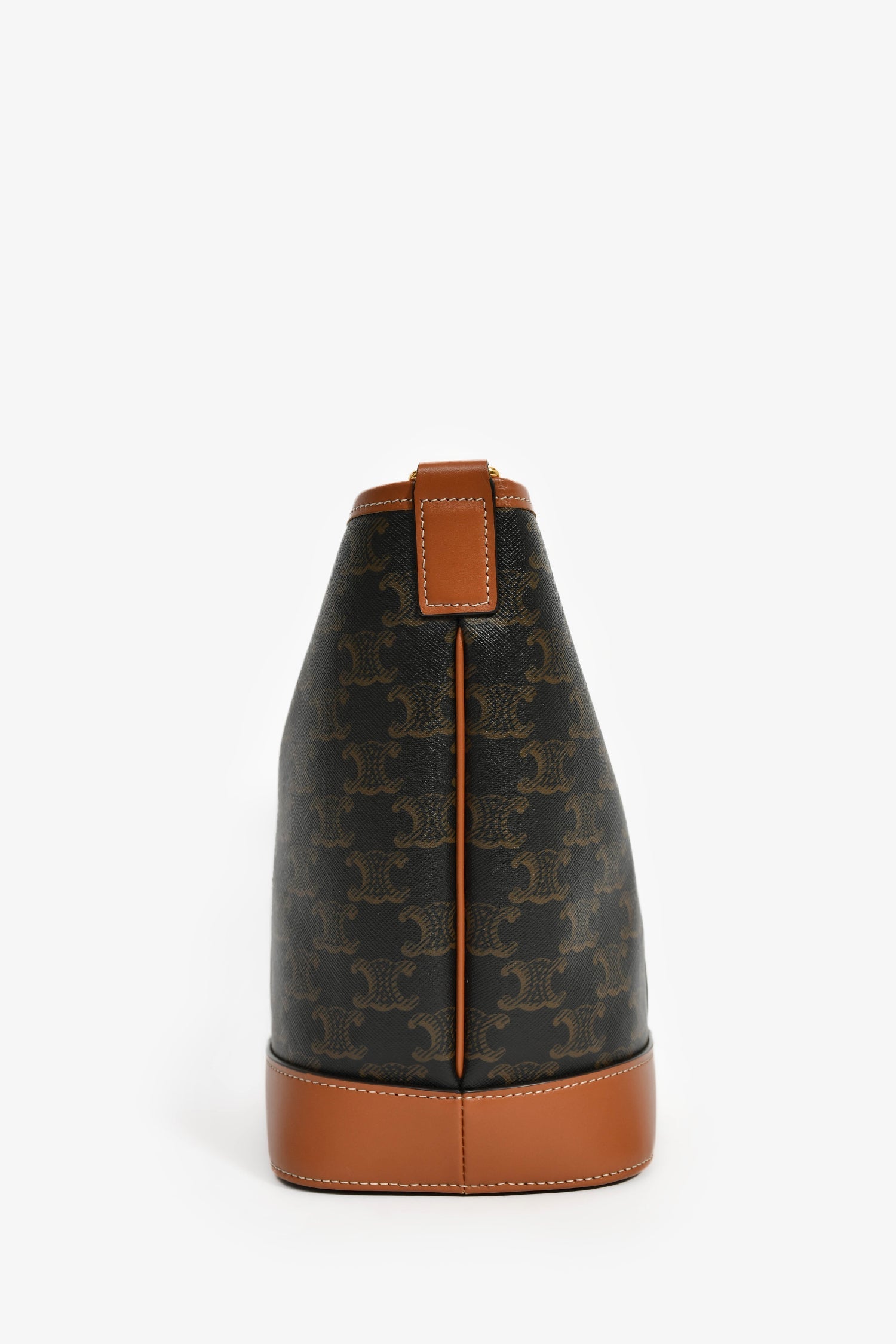 Celine Triomphe Canvas Small Crossbody Bucket Bag. Top interior snap-button closure. Adjustable strap. Lined interior. Open interior. Gold-tone hardware. Tonal stitching.
