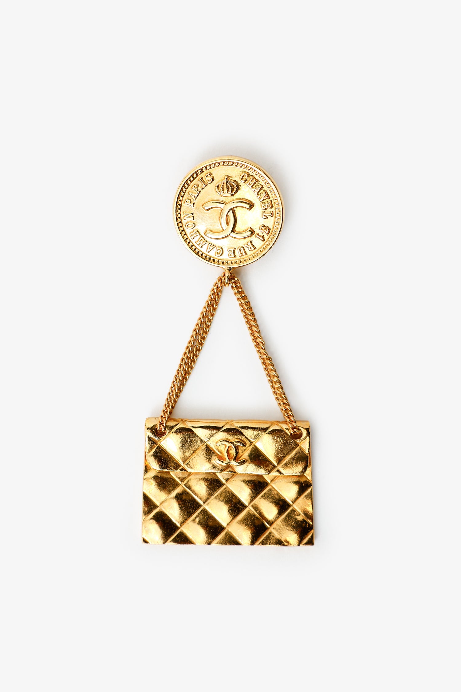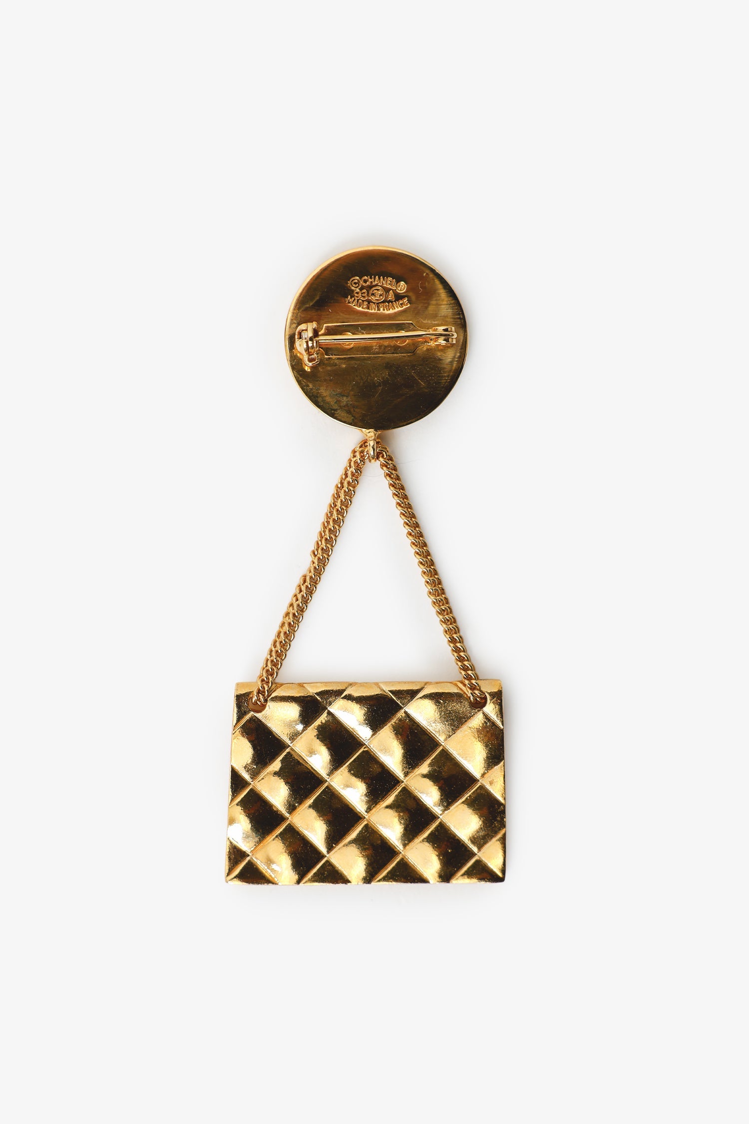 Pre-Loved Chanel™ 1993 Gold-Plated Handbag Brooch. Rear push-pin with turn-lock closure. Gold-tone hardware.