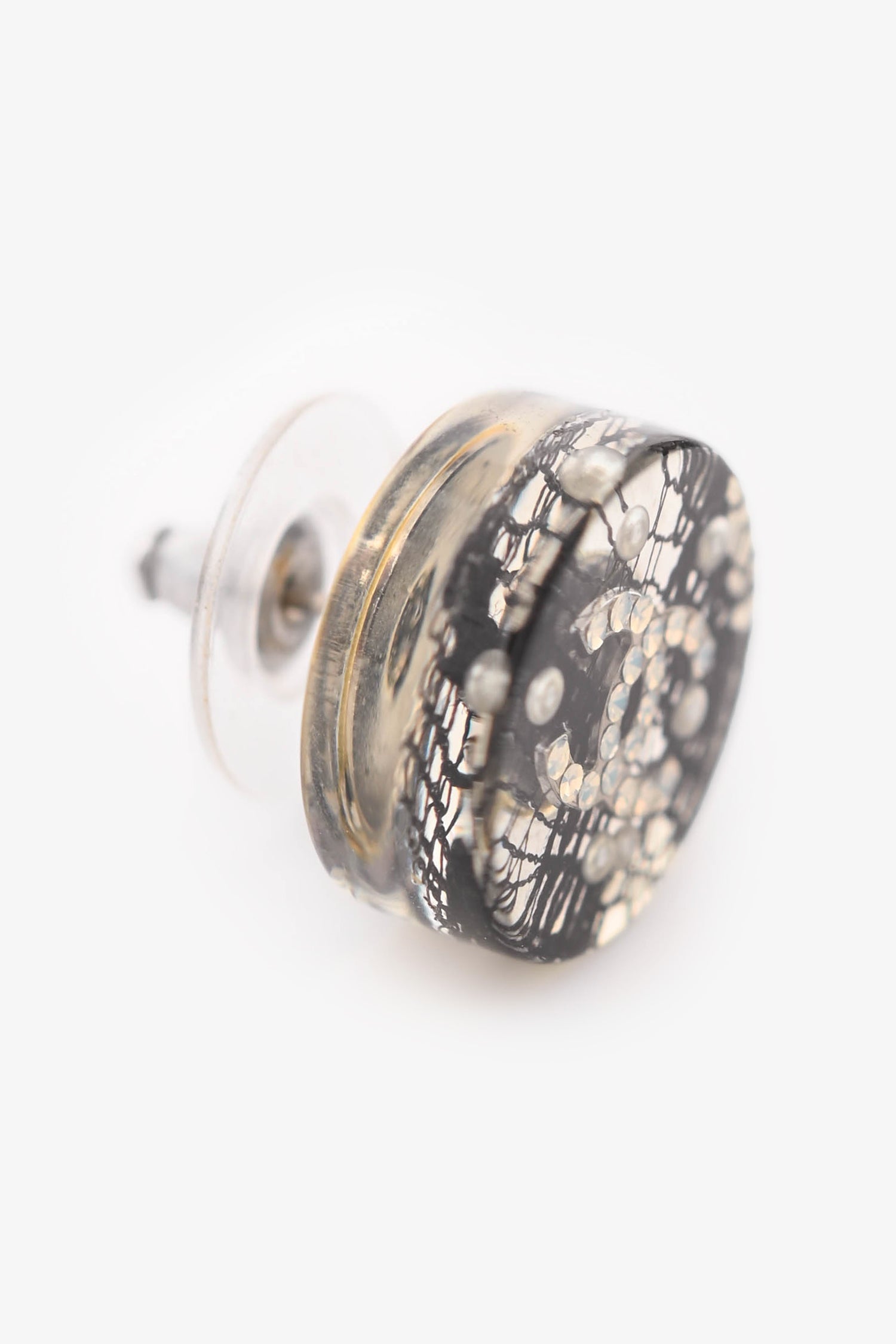 Pre-Loved Chanel™ 2013 Resin Lace CC Rounded Ear Studs. Push-pin closure in the back. Silver-tone hardware.