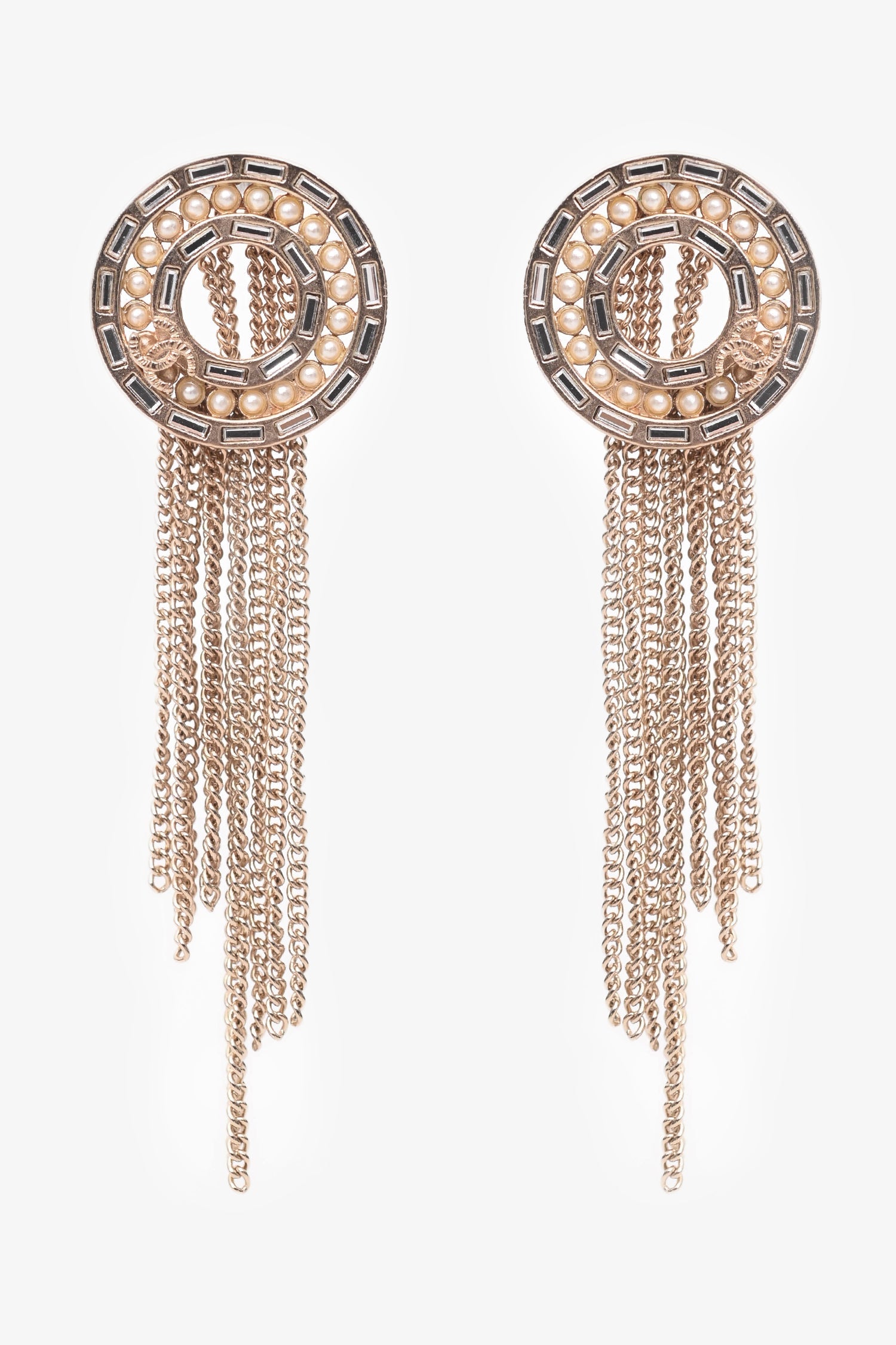 Pre-Loved Chanel™ 2016 Gold Tone Metal/Faux Pearl Tassel Earrings. Push-pin closure in the back. Gold-tone hardware.