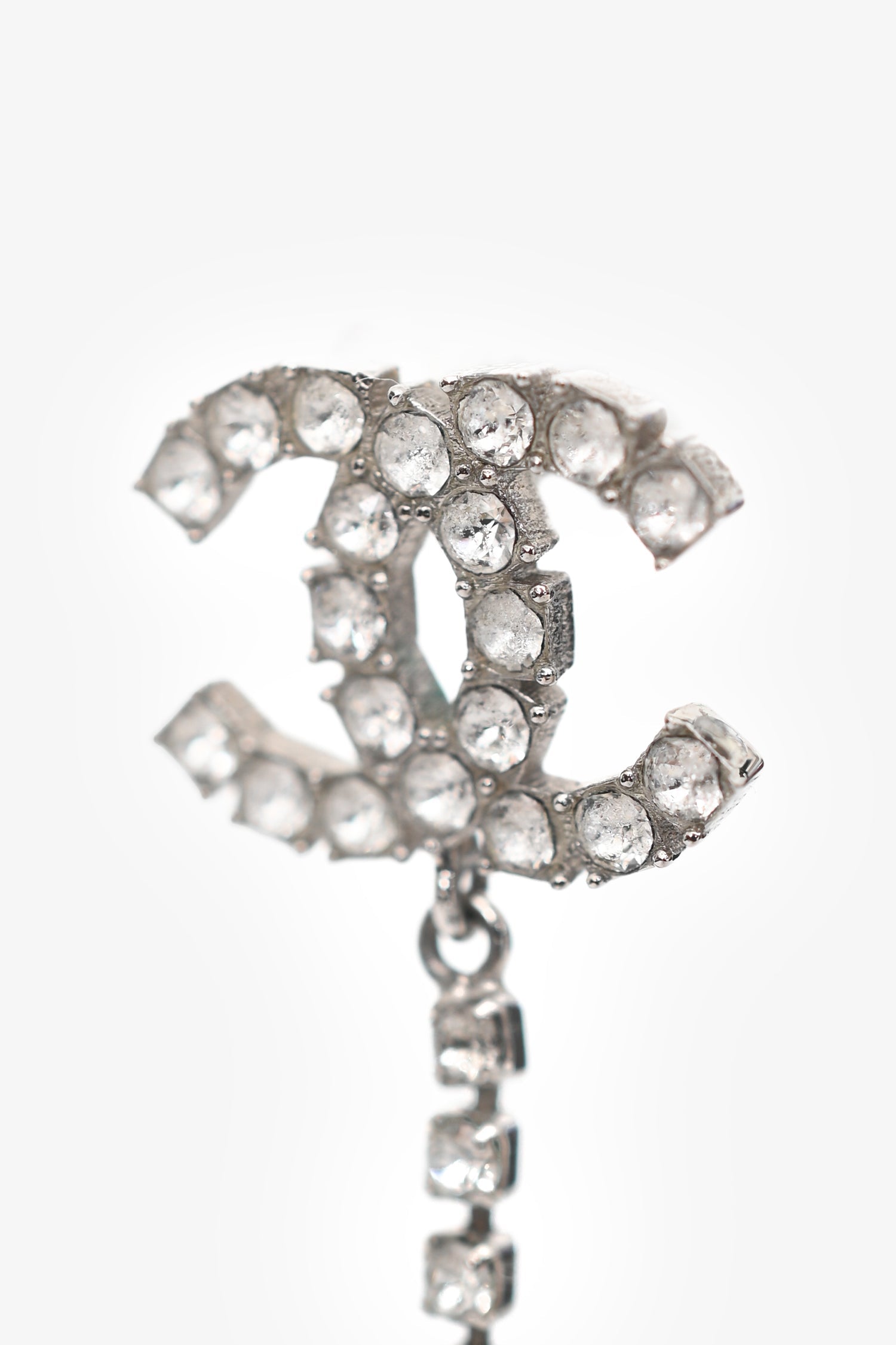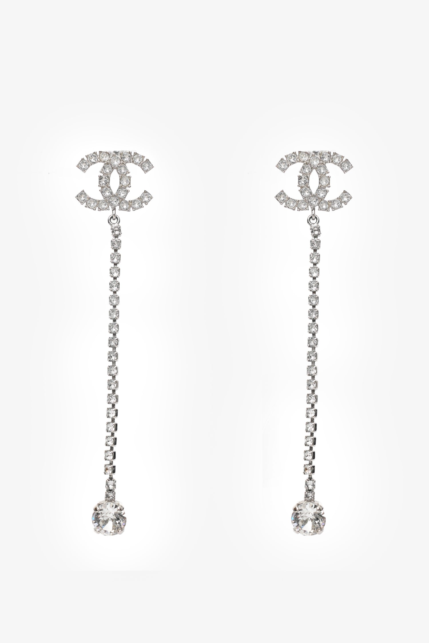 Pre-Loved Chanel™ 2018 Silver Tone Metal CC Crystal Ear Pendants. Push-pin closure. Silver-tone hardware.