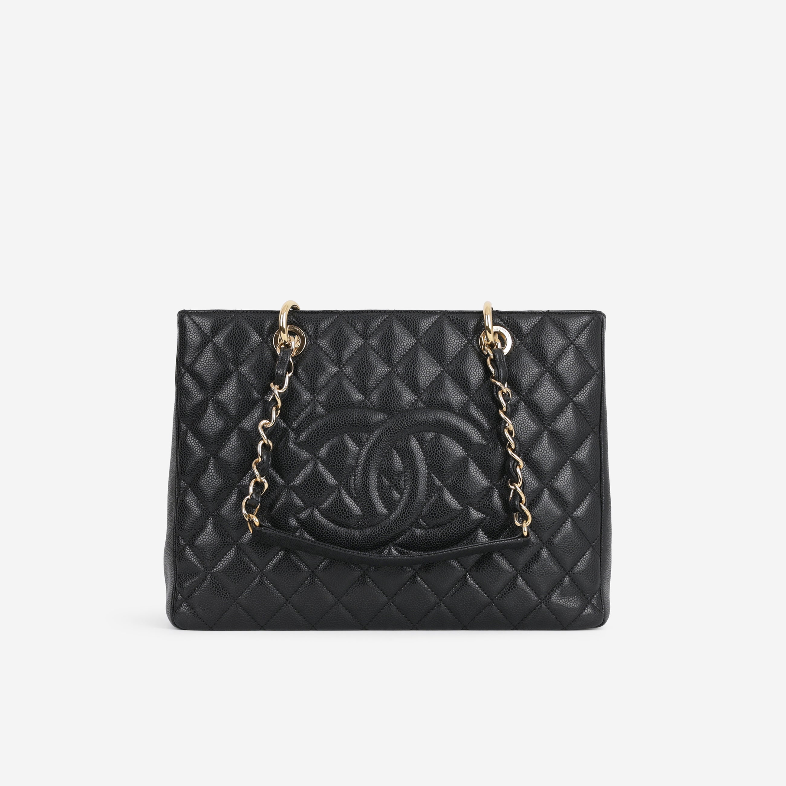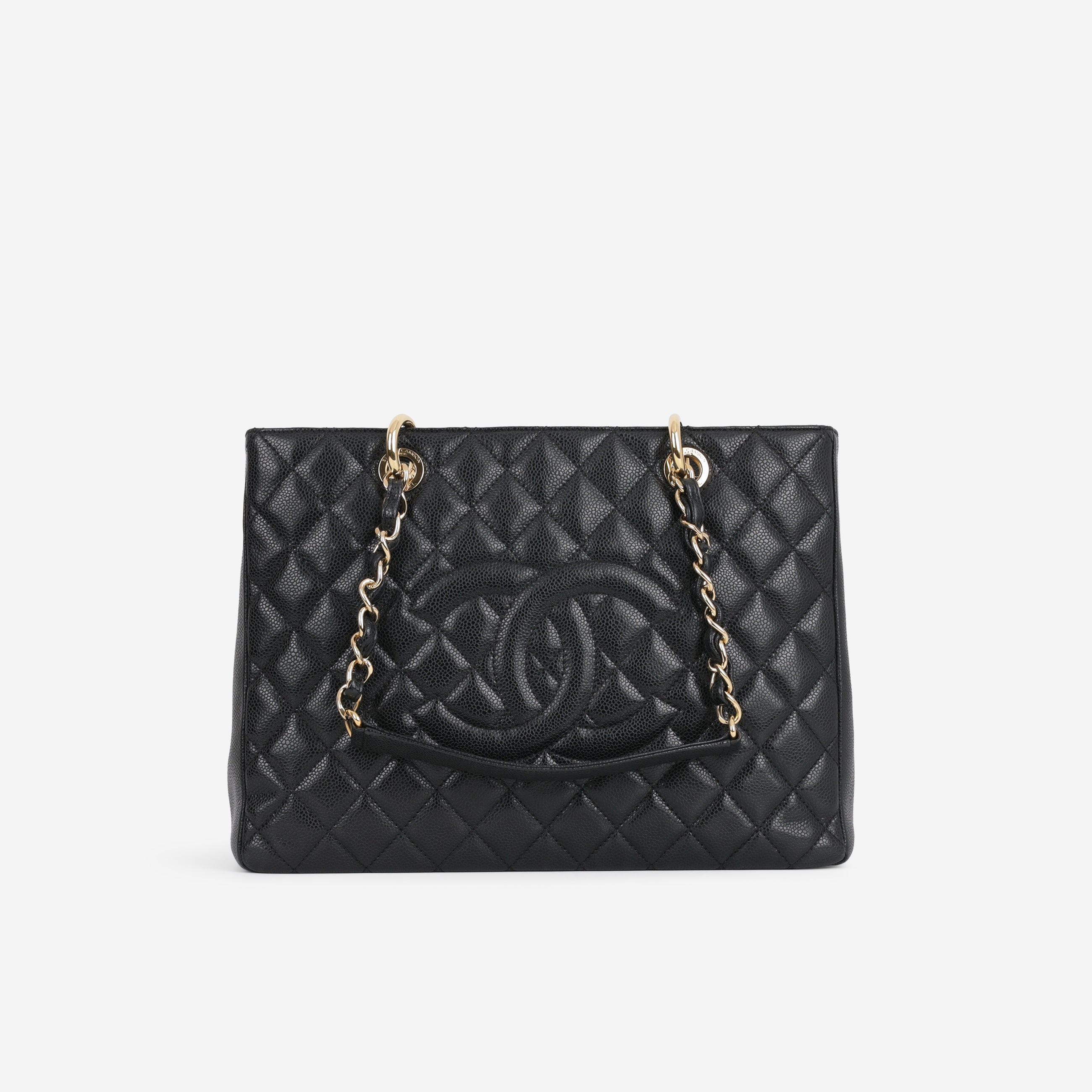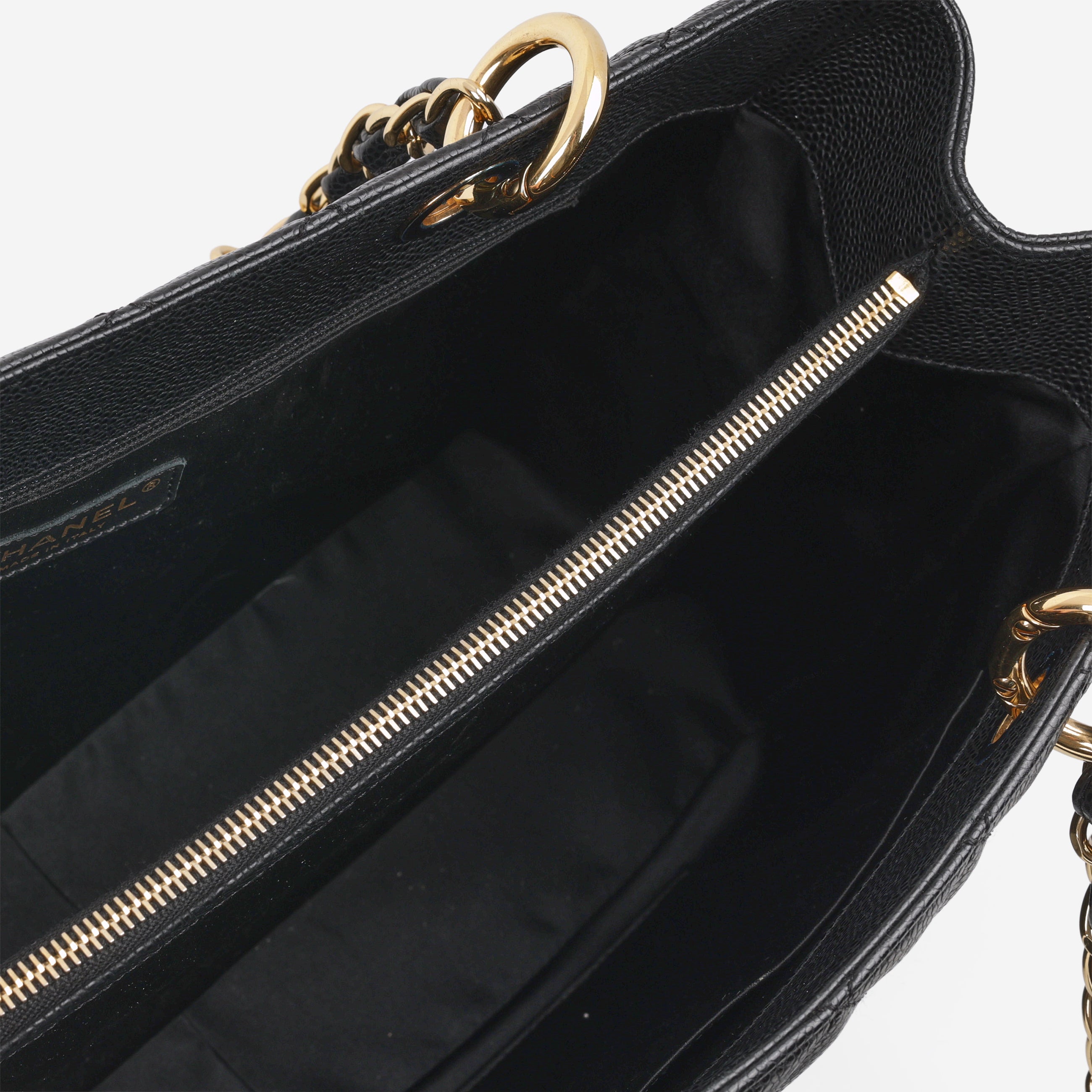 The Chanel GST (Grand Shopping Tote) in black caviar leather with gold hardware from the 2013 production. A classic tote silhouette featuring dual shoulder straps and CC logo detailing.