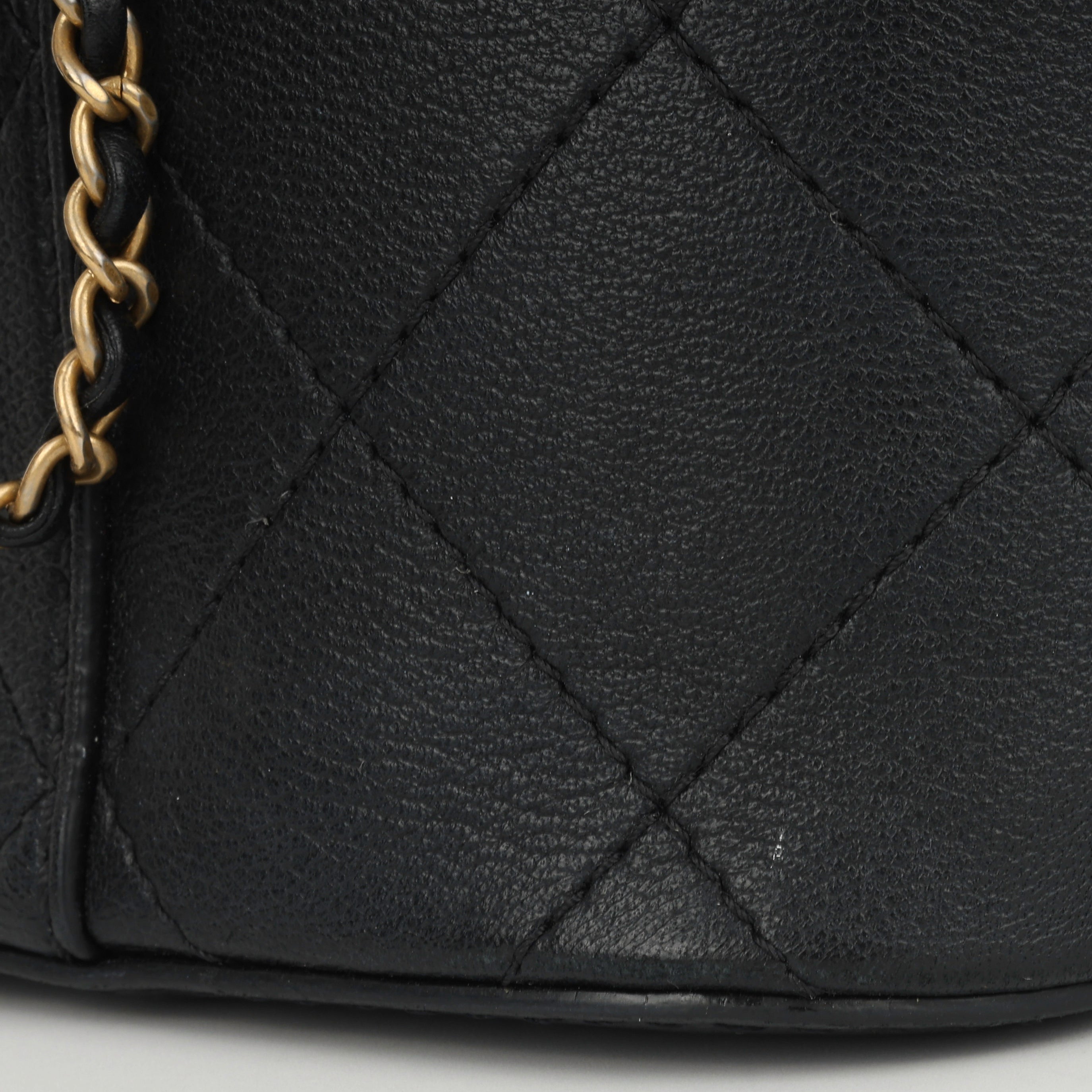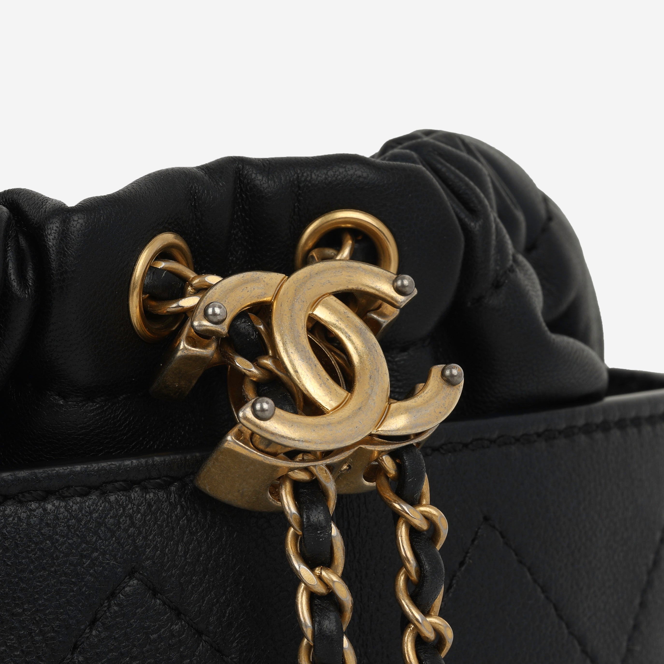 The Chanel Gabrielle Bucket Bag combines classic elegance with a modern look. Made from black quilted calfskin leather, it features Chanel’s signature diamond stitching and a soft drawstring top with the iconic gold CC logo. Its structured base adds stability, while the flexible top allows for easy access. The leather-woven gold chain strap can be worn on the shoulder or crossbody, making it great for both day and night.