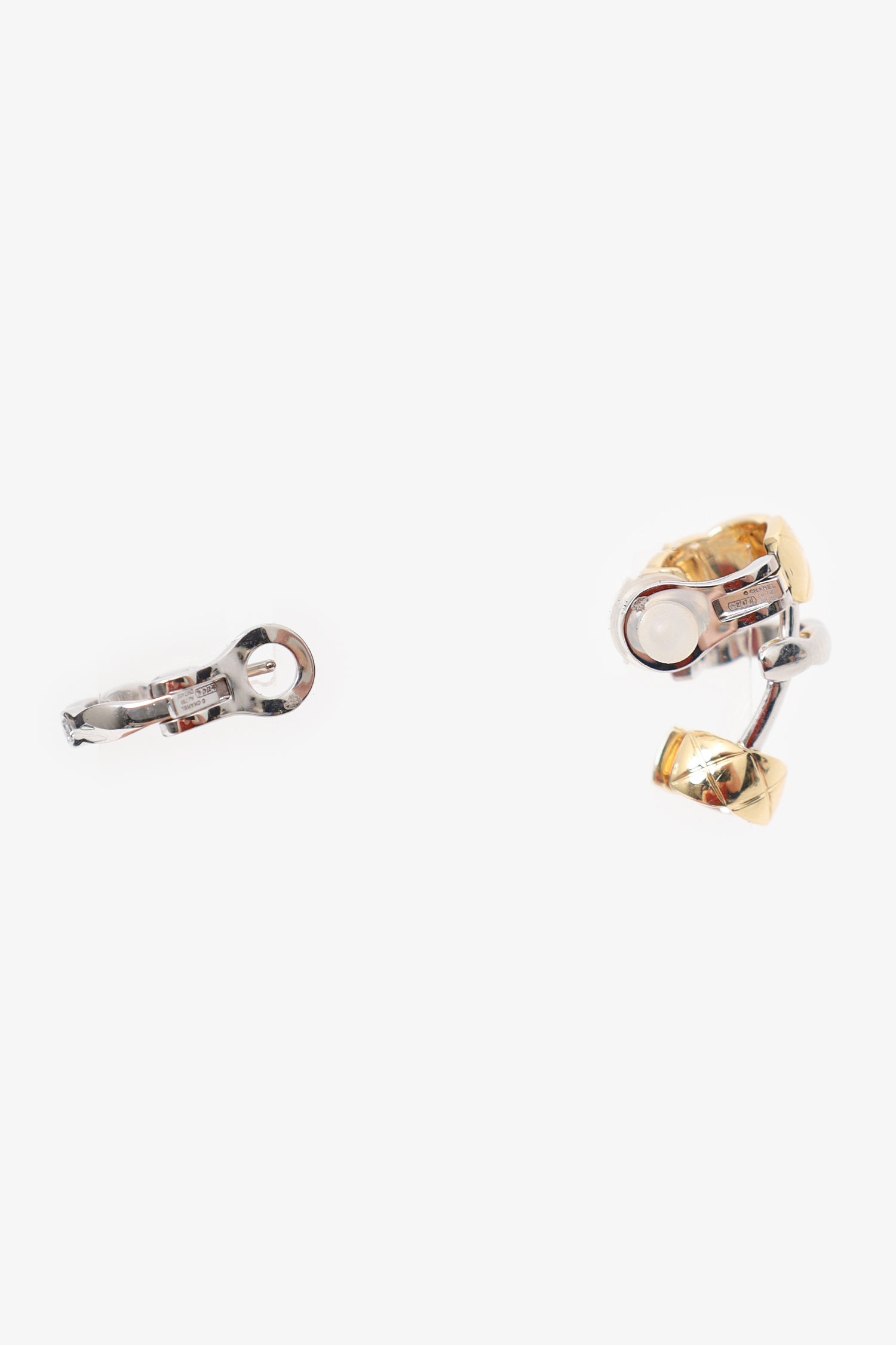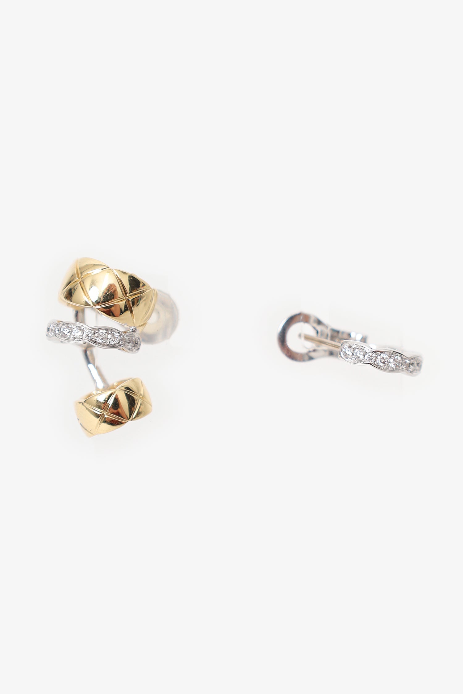 Pre-Loved Chanel™ 18K Gold Coco Crush Quilted Motif Earrings. One pair of ladies bespoke, designer made polished 18K white & yellow gold, diamond modern-style huggy-style earrings with omega-wire backs. Trademark found on item. Gold-tone hardware.