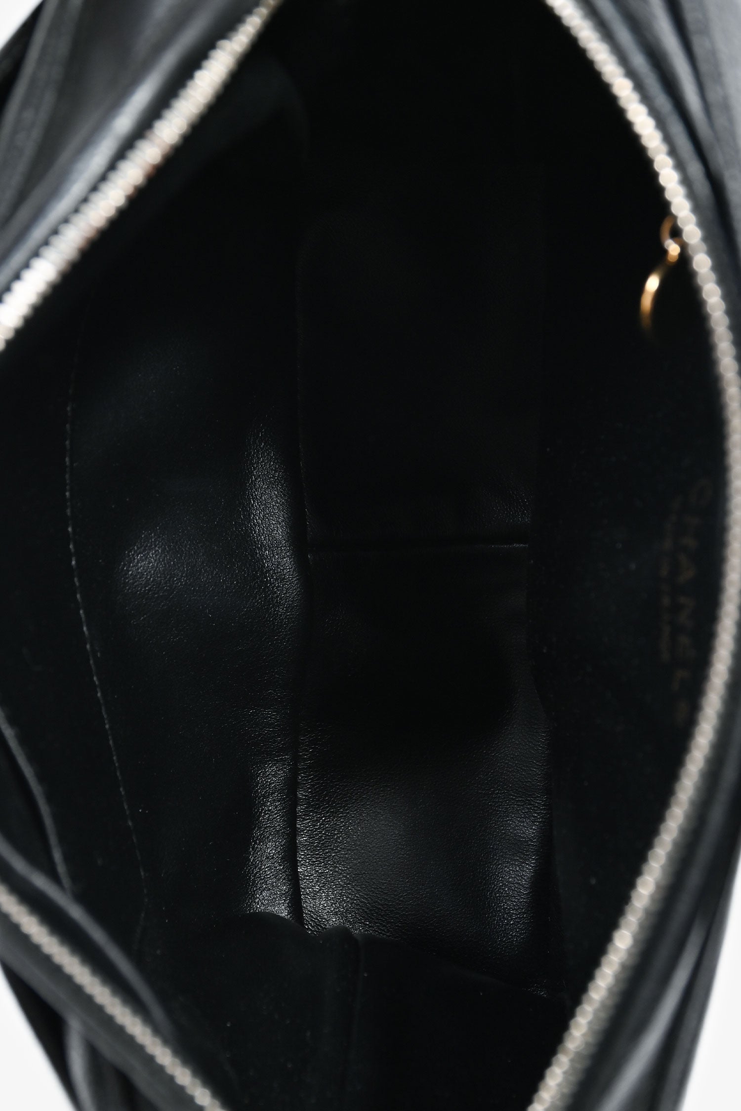 Pre-Loved Chanel™ 1986-1988 Black Caviar Leather Triple CC Logo Crossbody. Gold-tone hardware. Exterior slip compartment. Lined leather interior with a zipped compartment and 1 pocket. Crossbody strap with wrap-around detail. Tonal stitching.